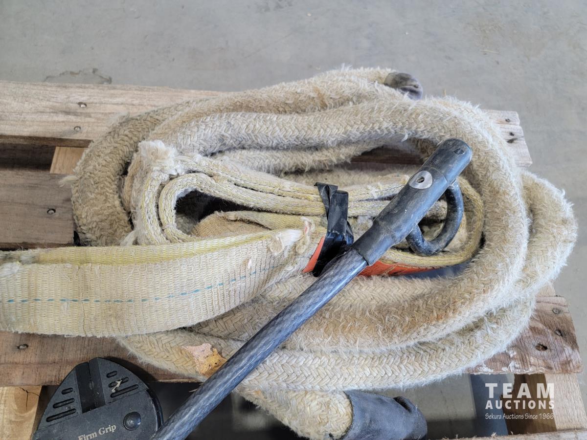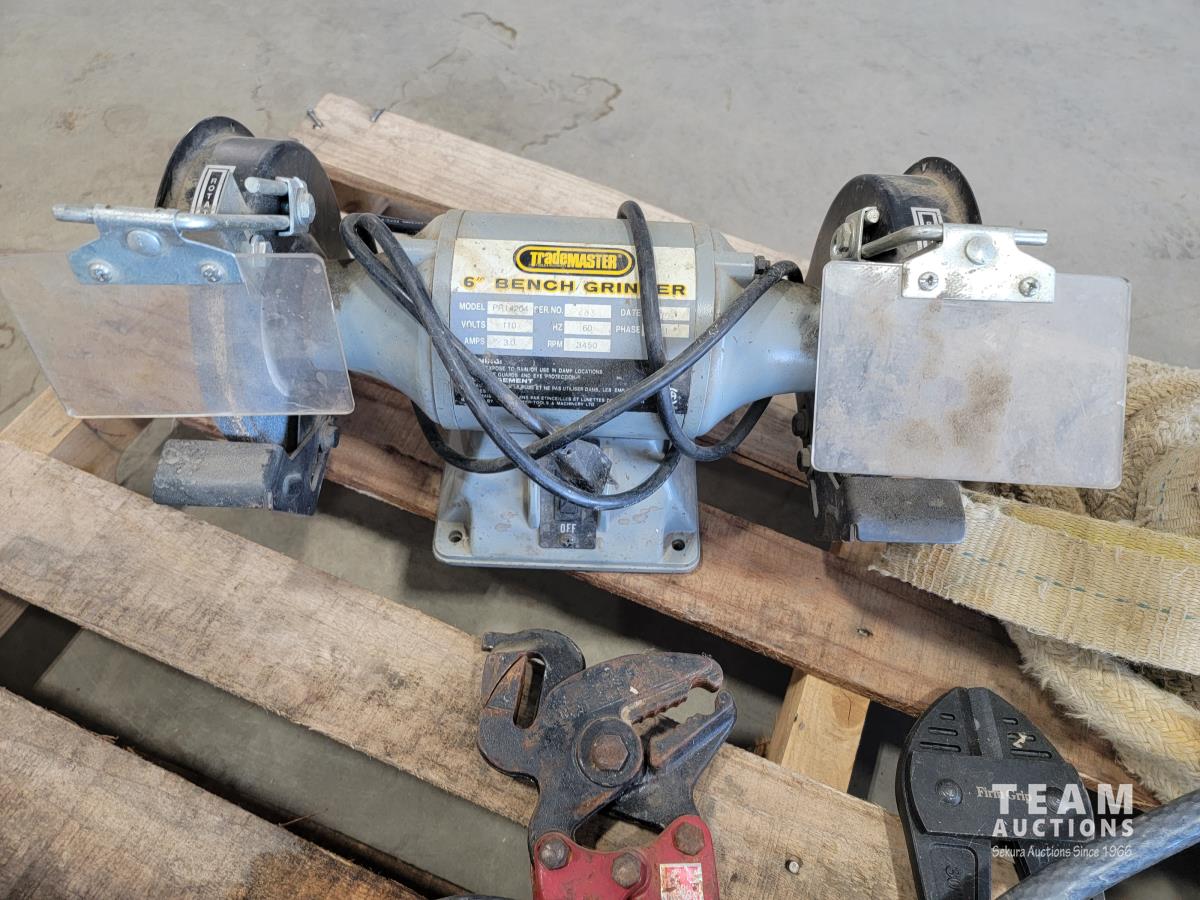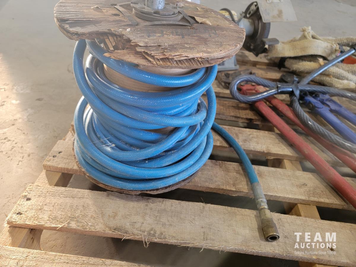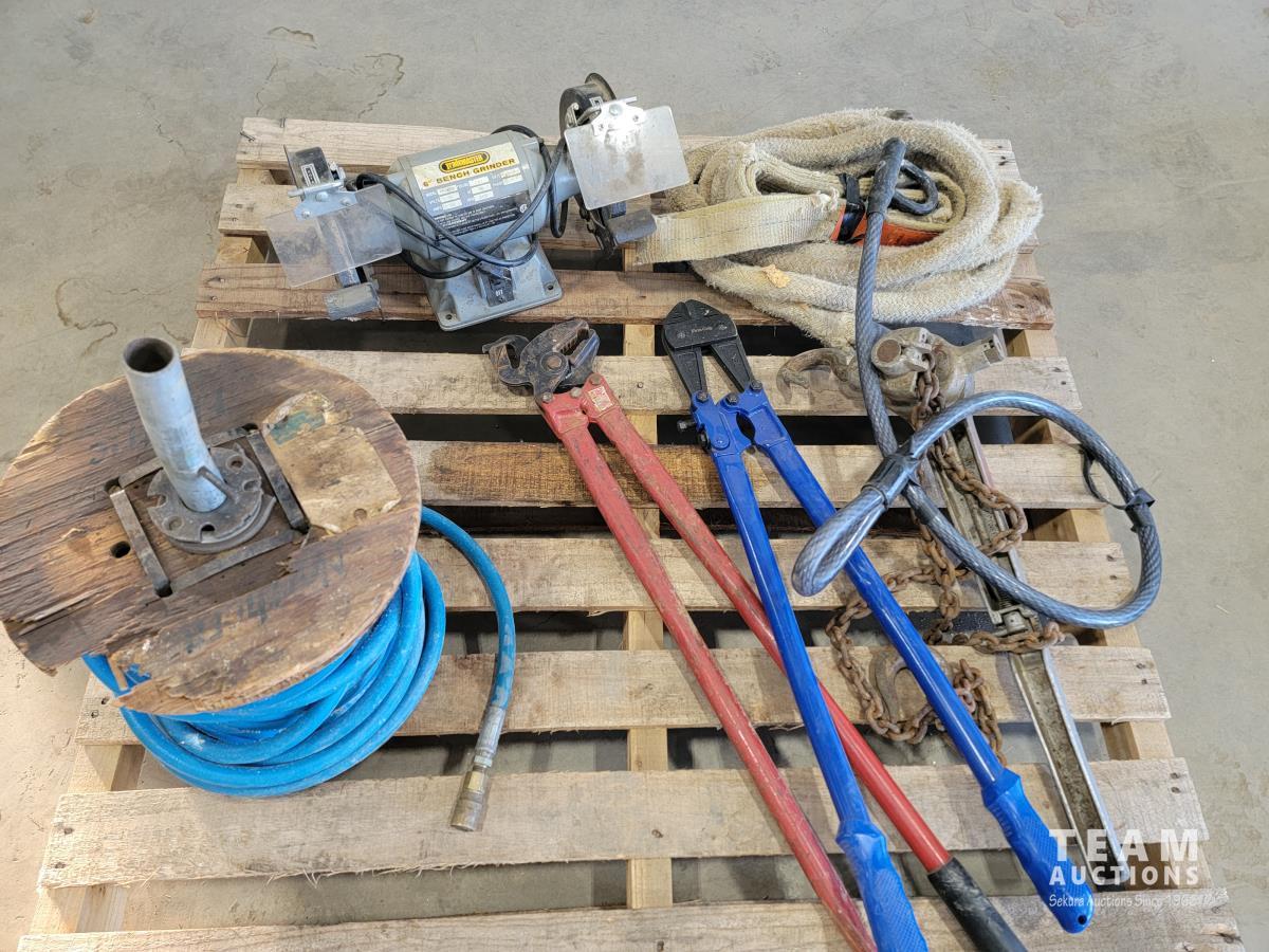 Roll of 3/8 air hose, Trademaster 6 inch bench grinder, tow ropes, straps, come-a-long, bolt cutter and chain pliers