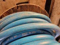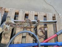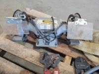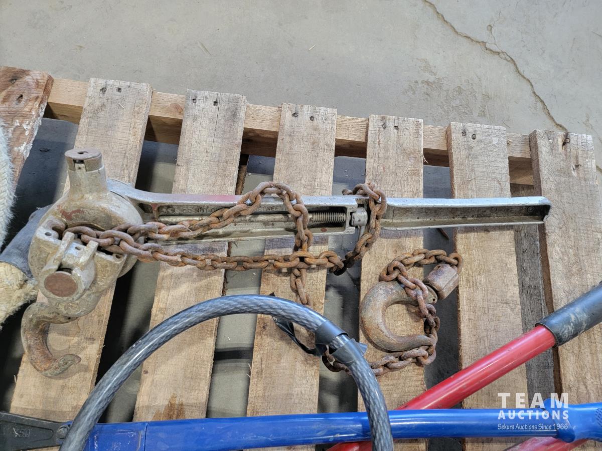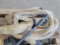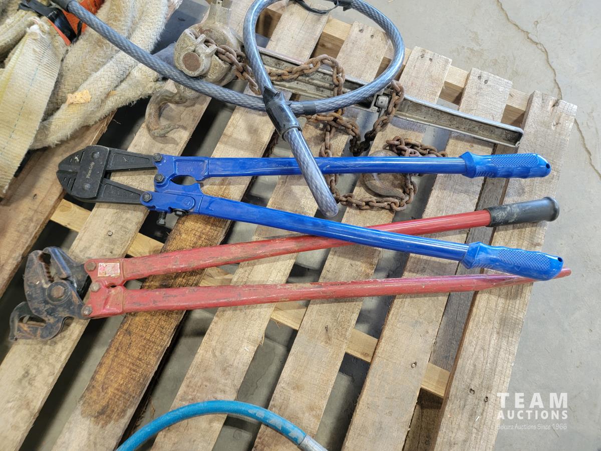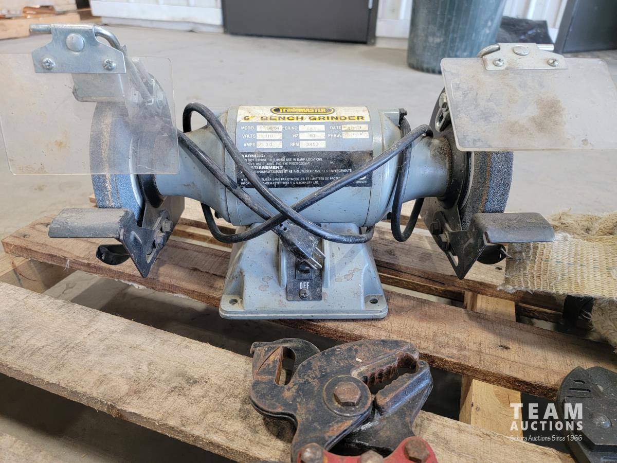 Roll of 3/8 air hose, Trademaster 6 inch bench grinder, tow ropes, straps, come-a-long, bolt cutter and chain pliers