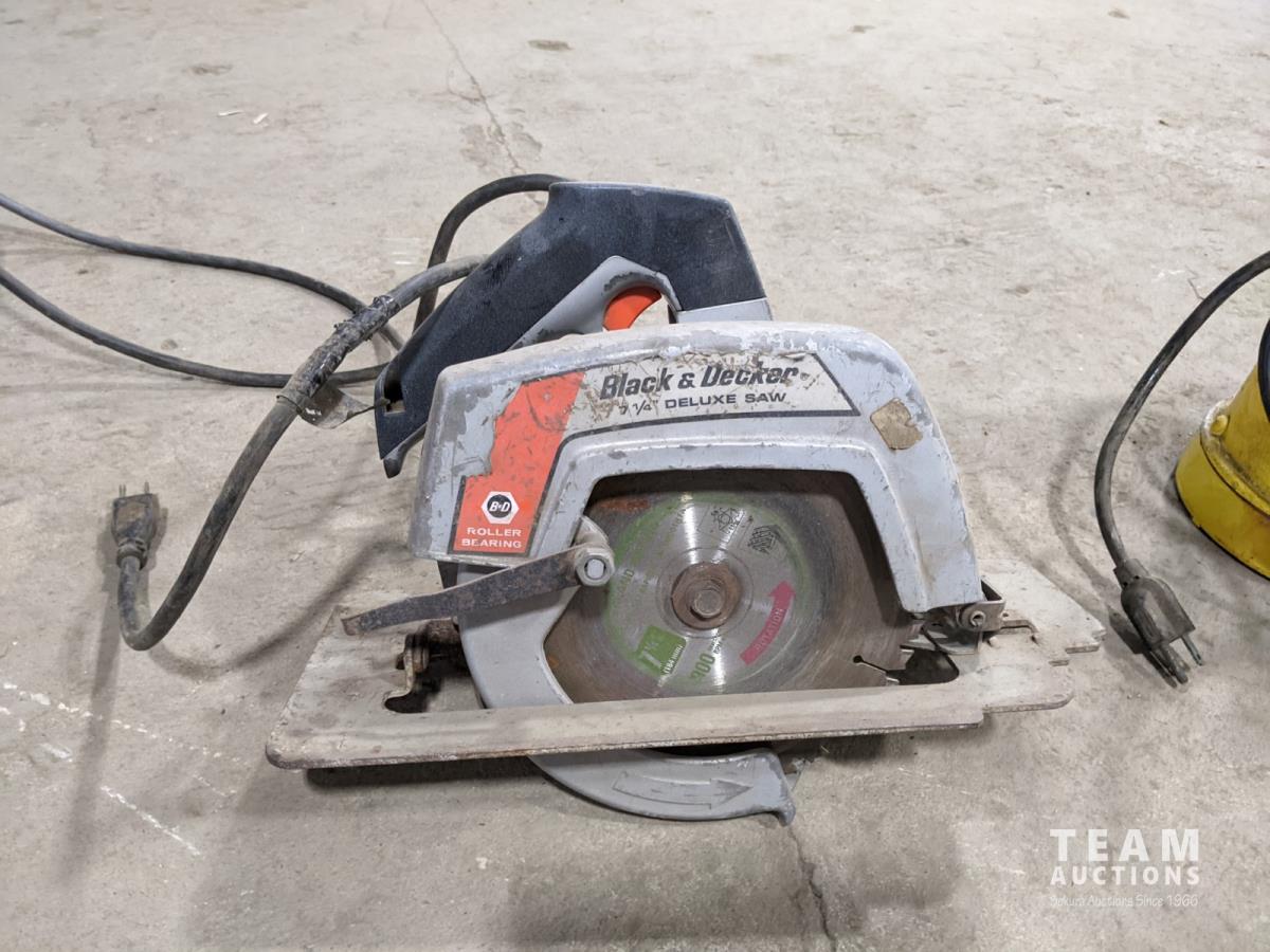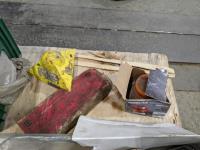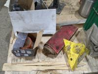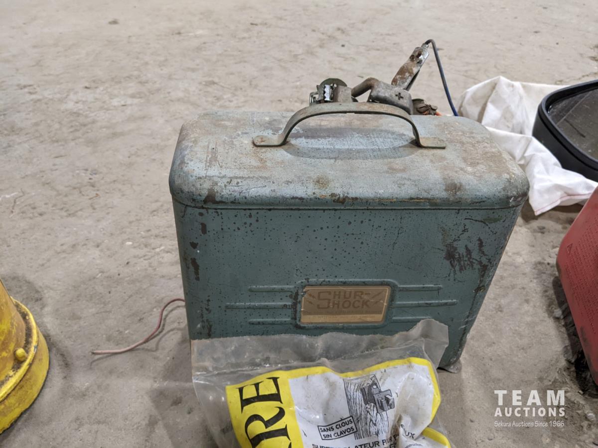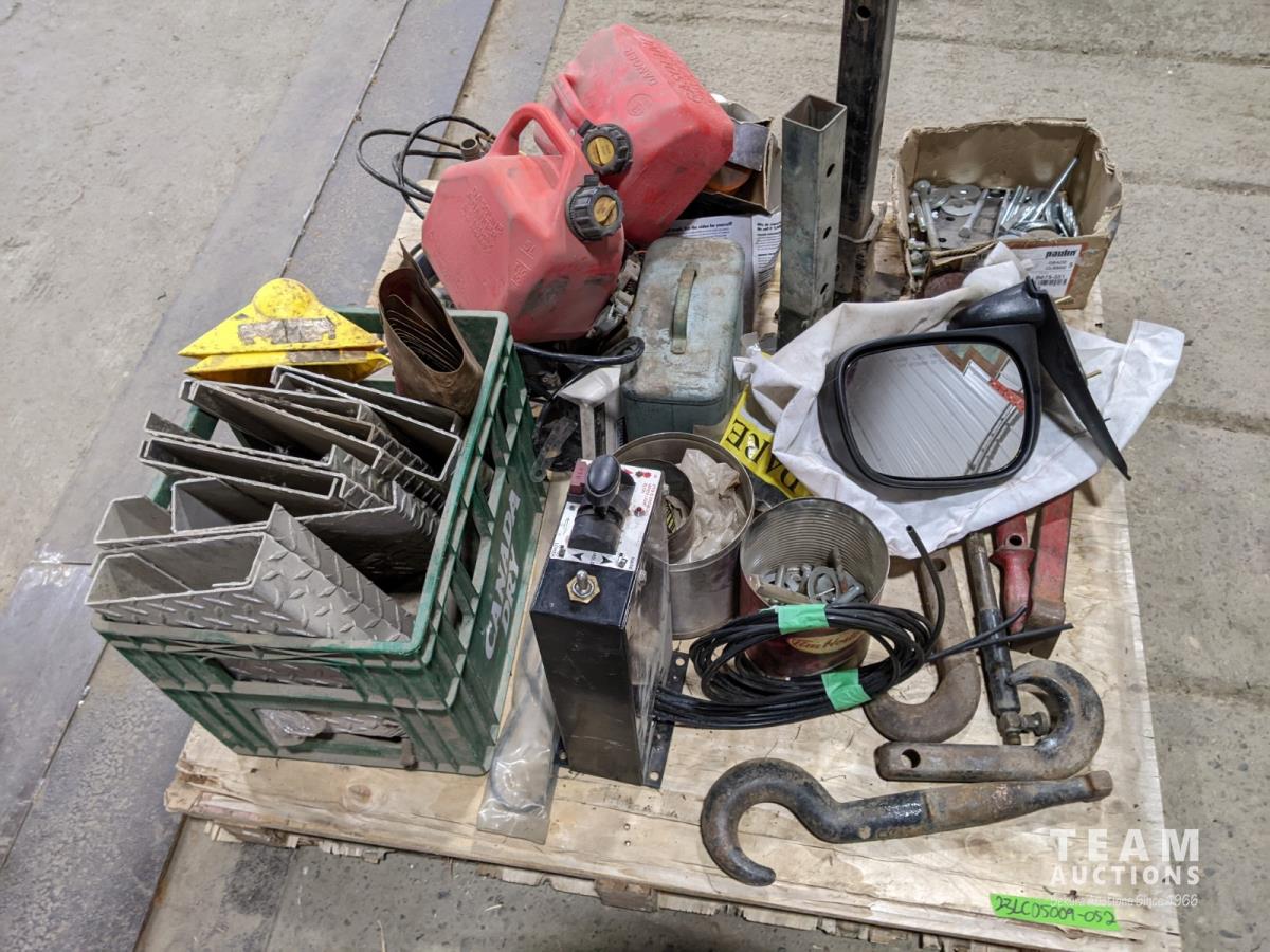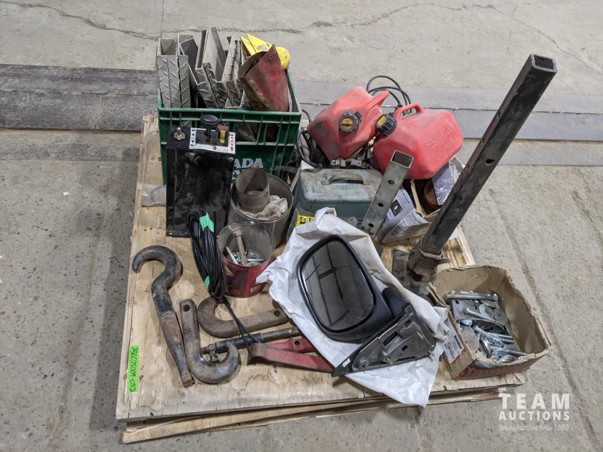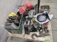 Qty of checker plate, (2) jerry cans, dump box PTO control, amber light, (3) tow hooks, Black & Decker 7-1/4 inch circular saw, electric fencer with insulator, Dodge passenger side heated mirror