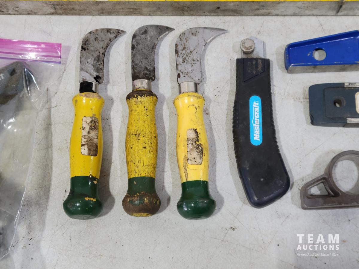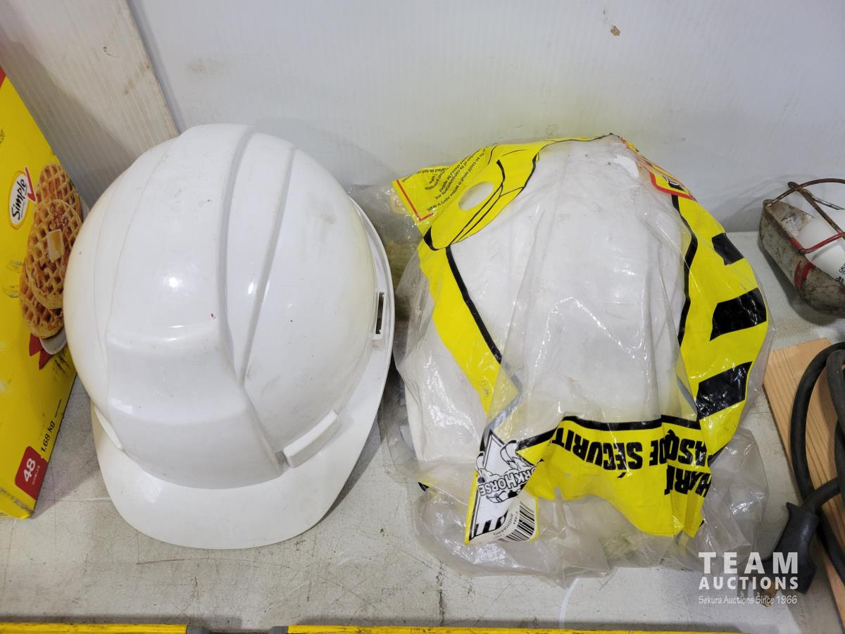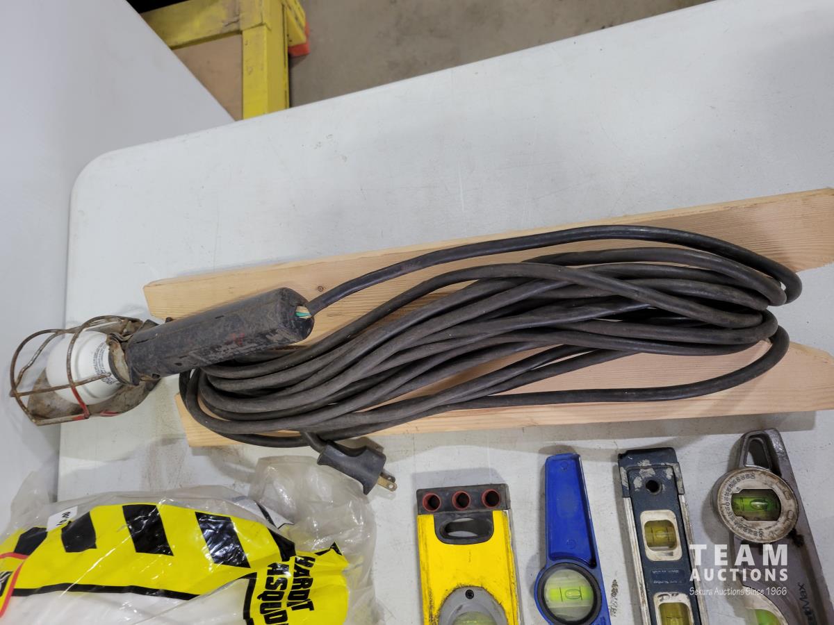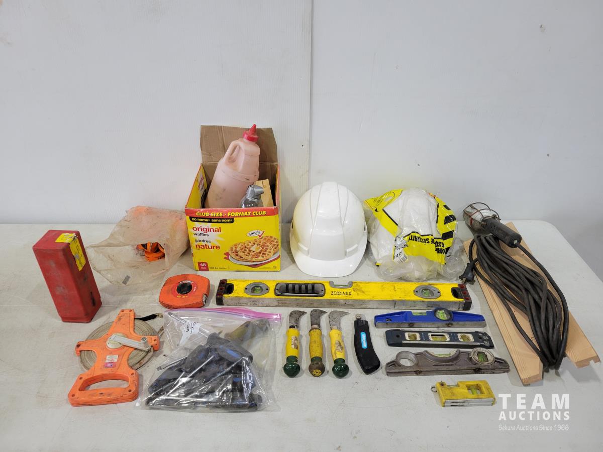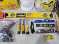 Levels, work light, screwdrivers, hardhats, knives, straight-lines