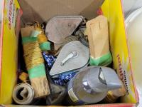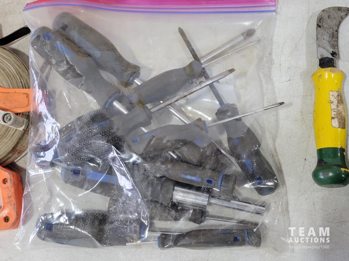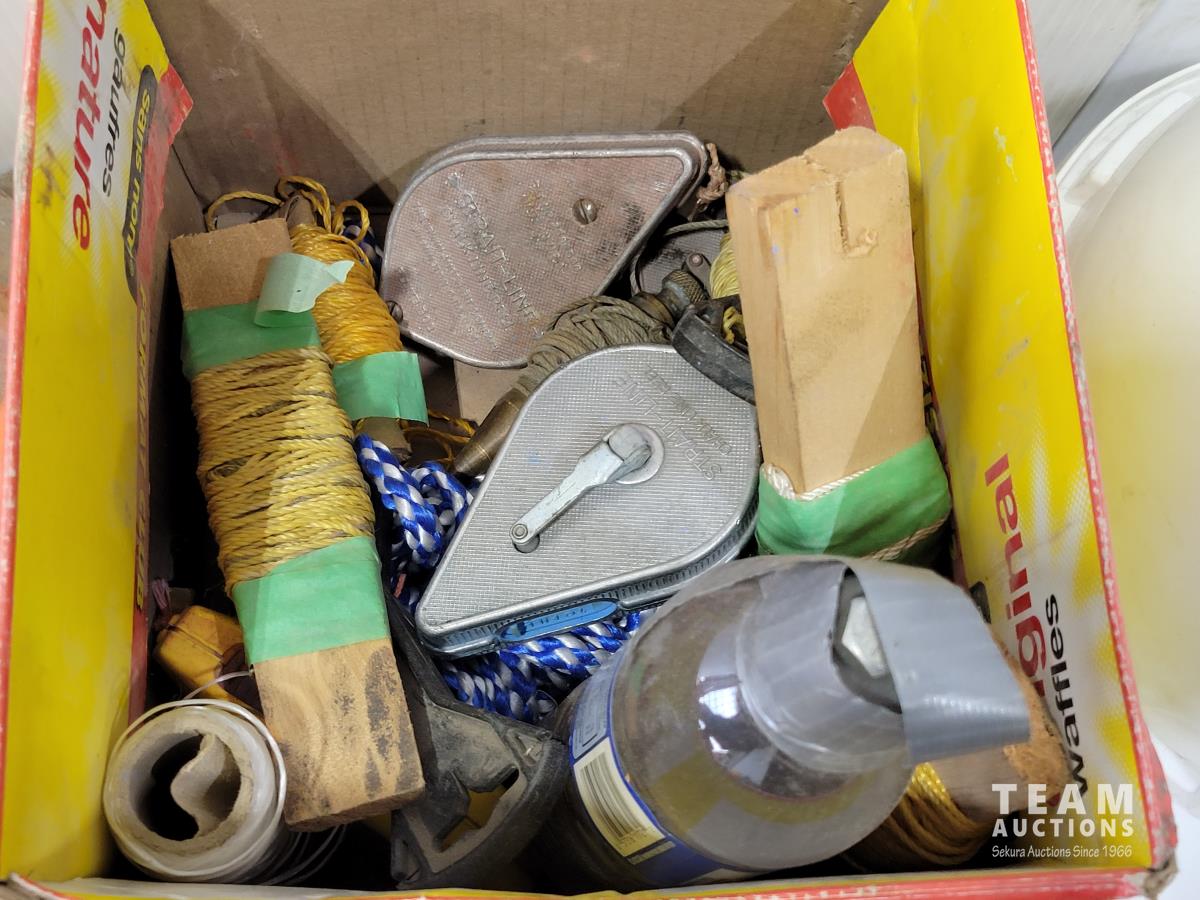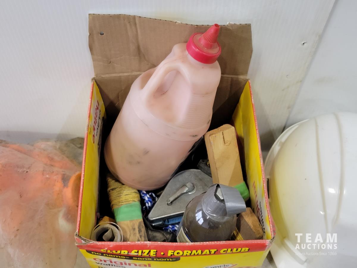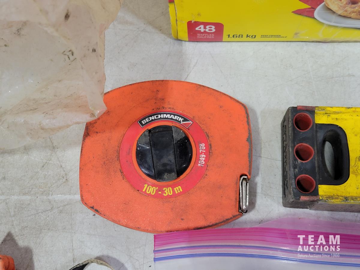 Levels, work light, screwdrivers, hardhats, knives, straight-lines