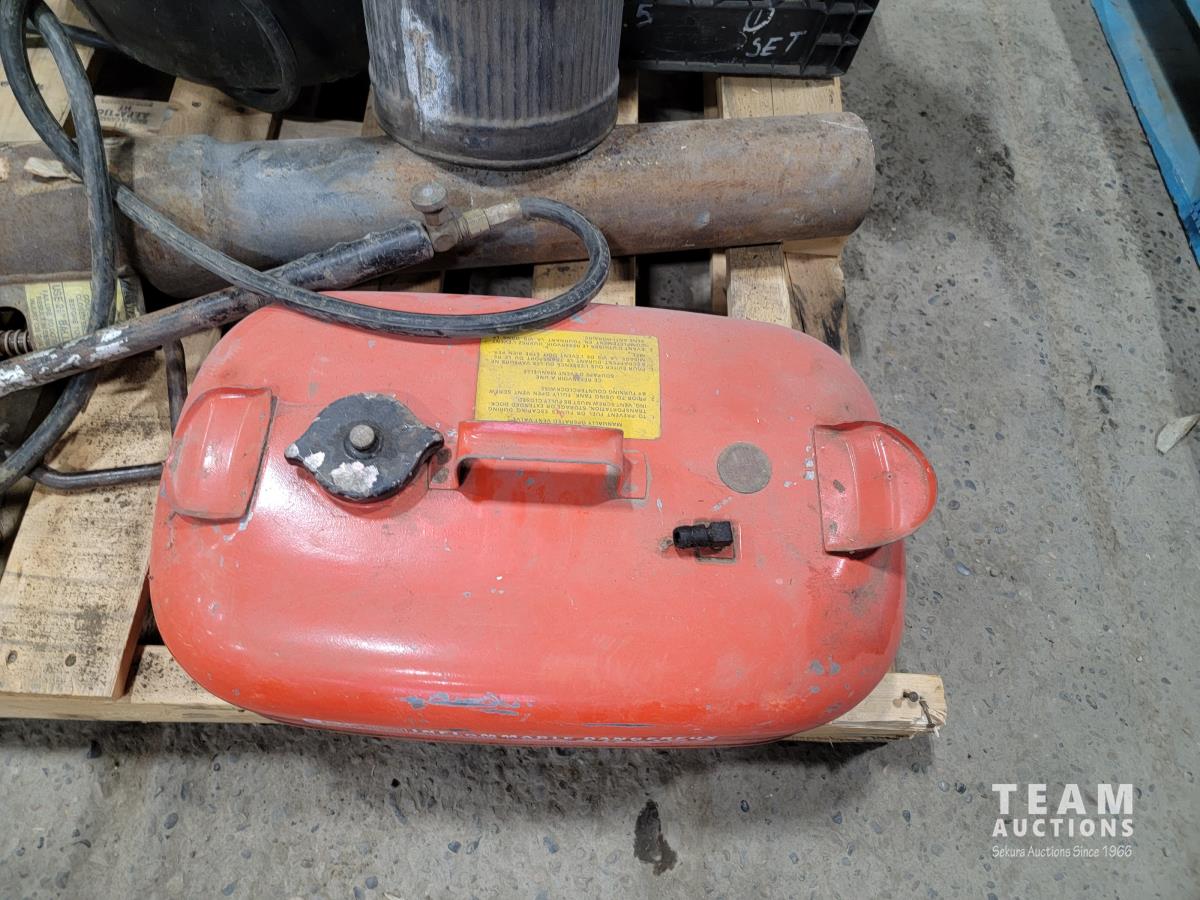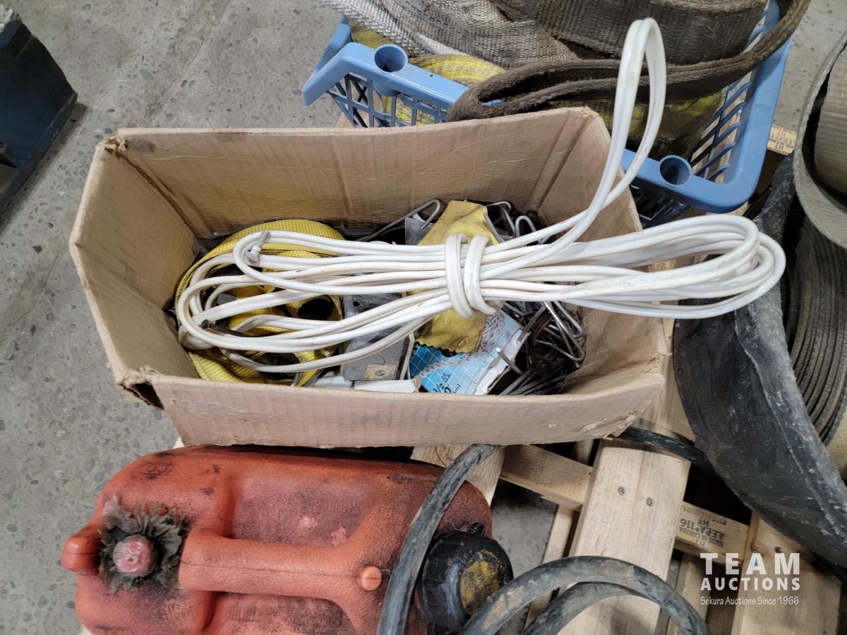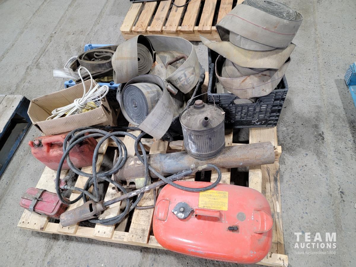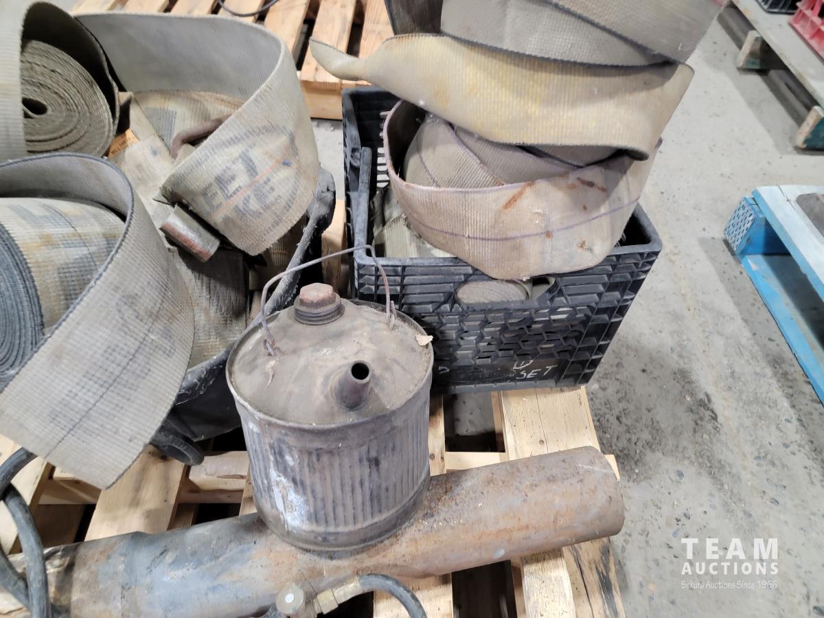 Gooseneck ball hitch, straps, marine fuel tank, propane torch, antique gas can, rubber bucket, straps, slings, jerry cans