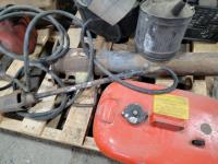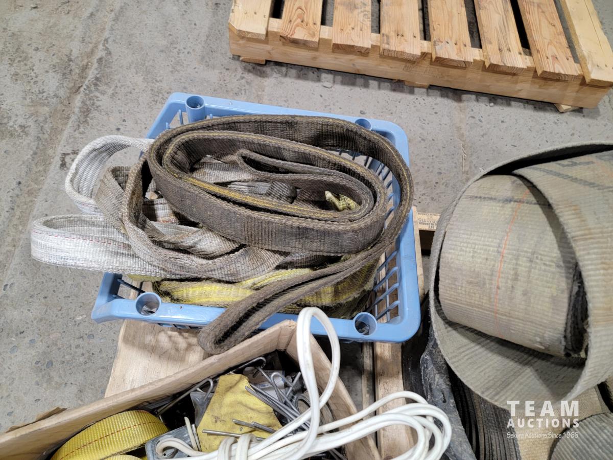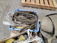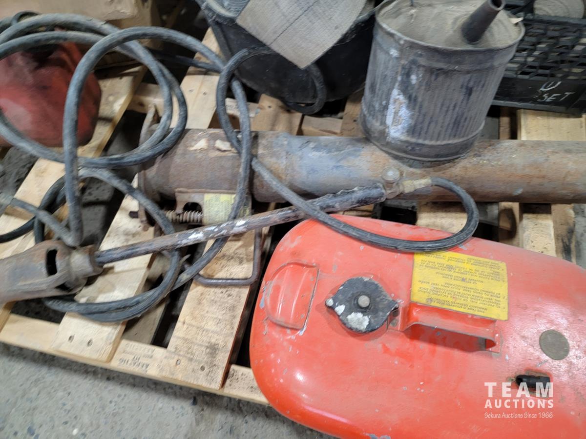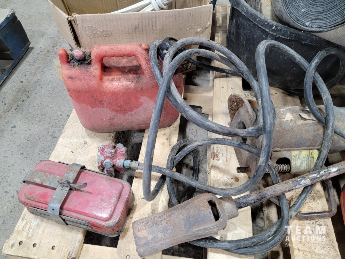 Gooseneck ball hitch, straps, marine fuel tank, propane torch, antique gas can, rubber bucket, straps, slings, jerry cans