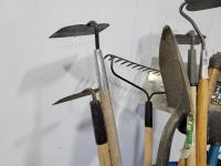 Garden hoes, rake, ice chipper, shovel