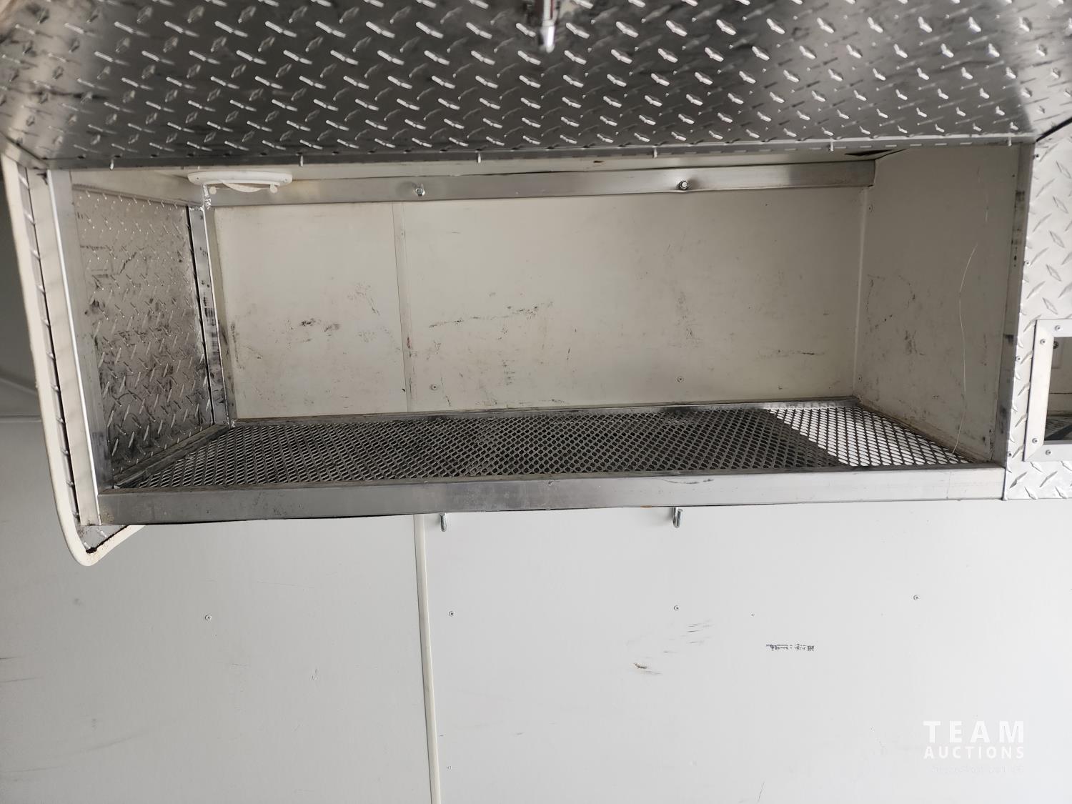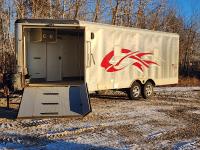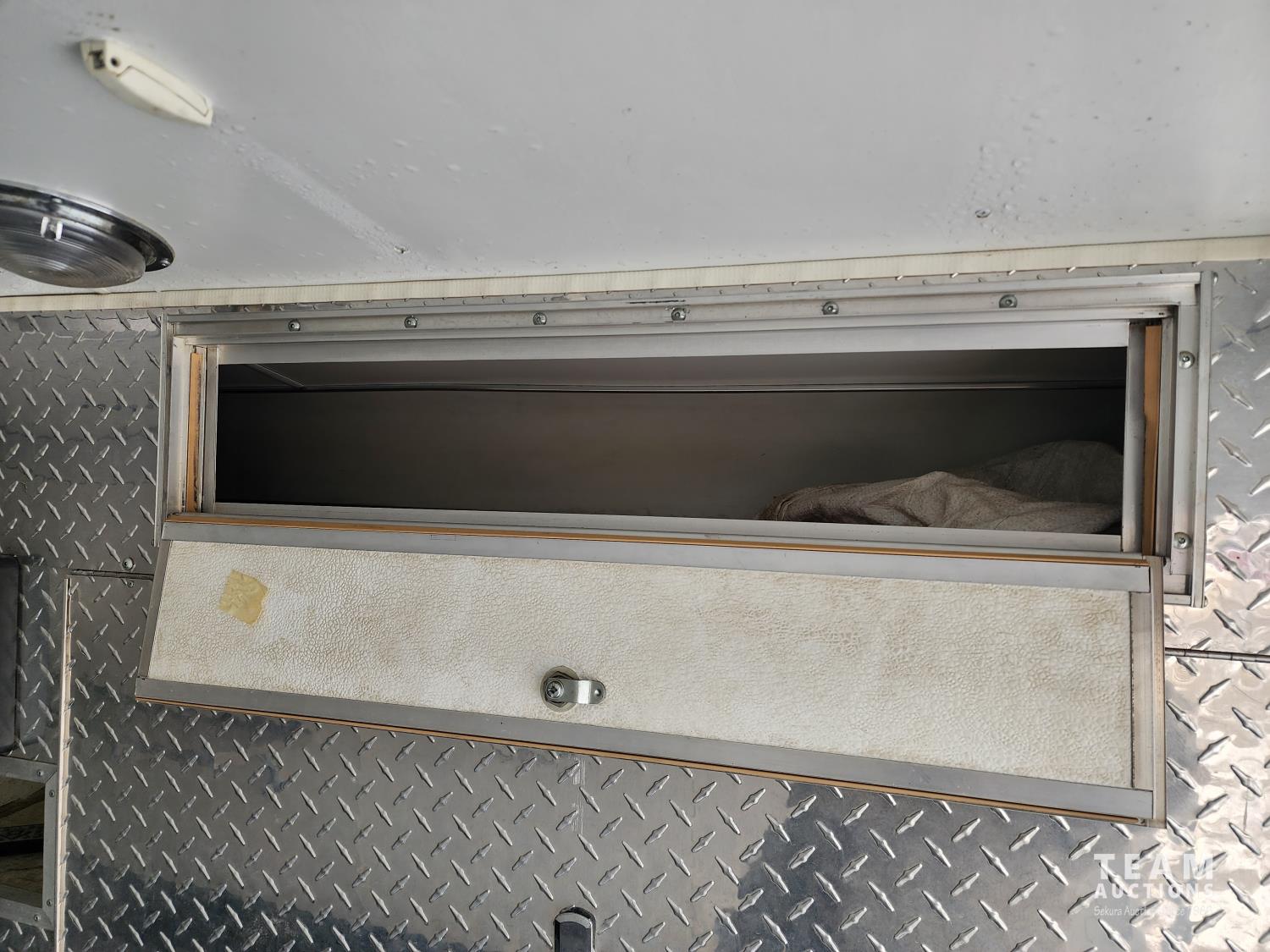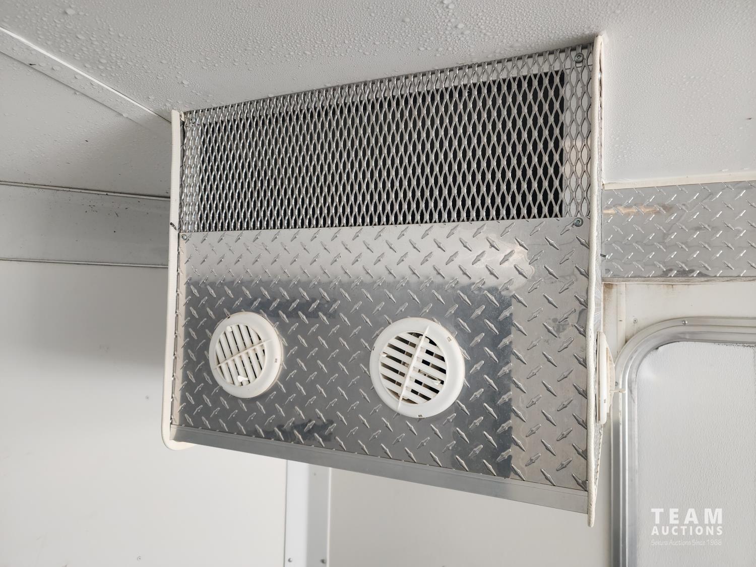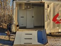 98 inch interior width, 81 inch interior height, ball hitch, side door, fold down door, spring suspension, man door, onboard fuel station, heater, radio, storage cupboards, 3500 lb axles, 205/75R15 tires