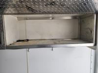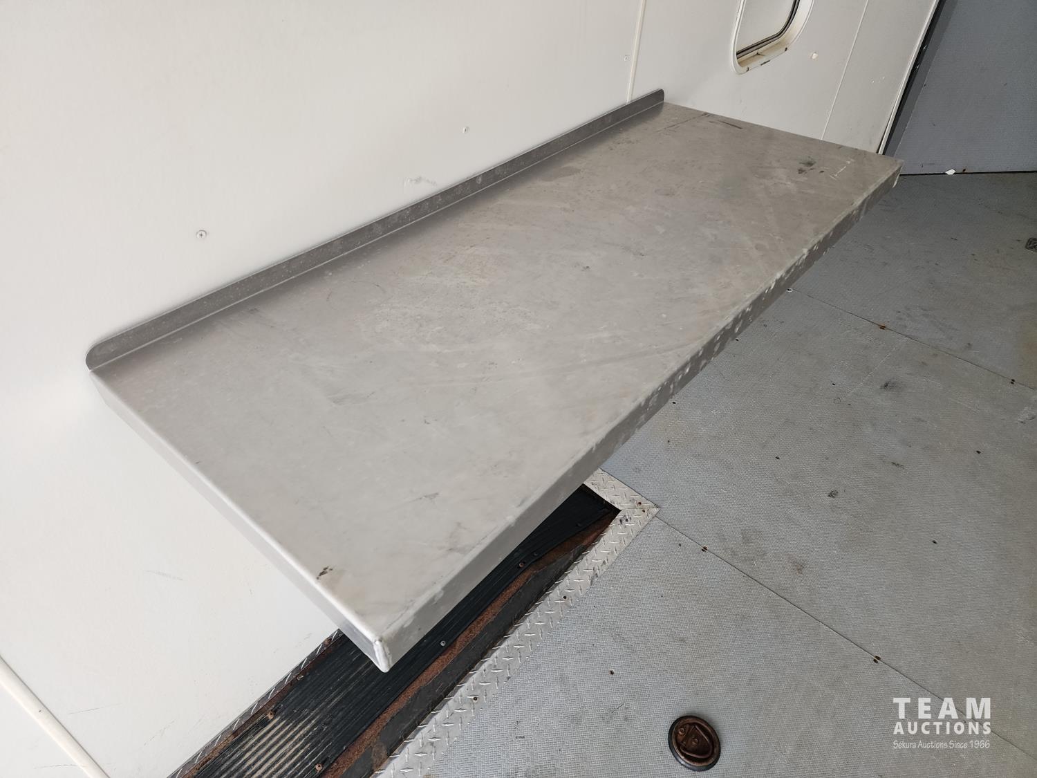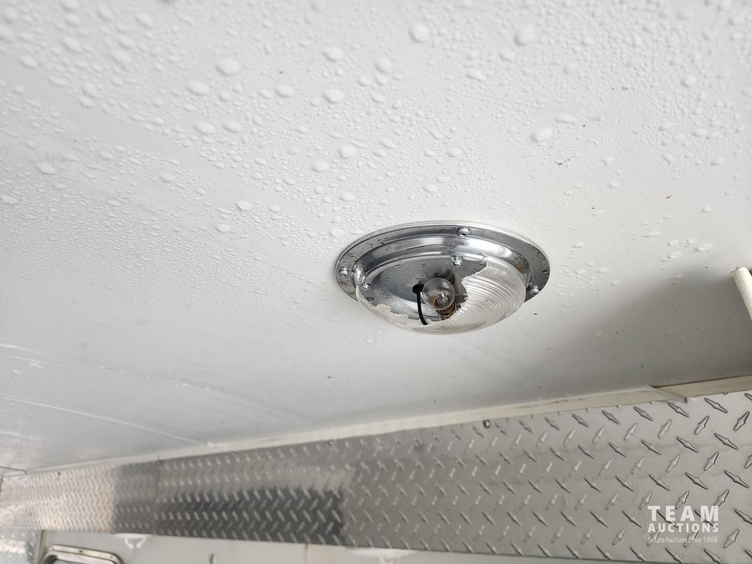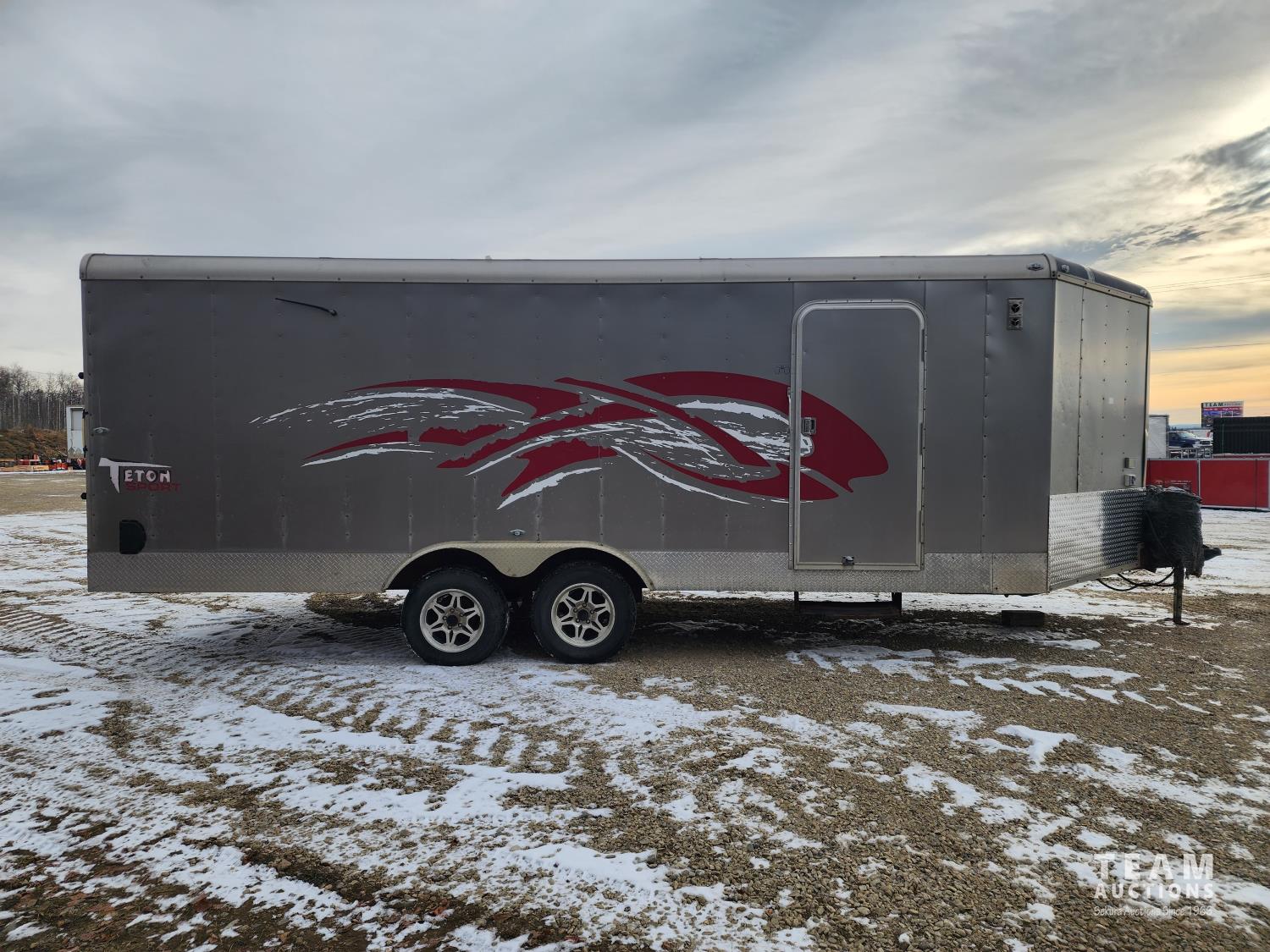 98 inch interior width, 81 inch interior height, ball hitch, side door, fold down door, spring suspension, man door, onboard fuel station, heater, radio, storage cupboards, 3500 lb axles, 205/75R15 tires