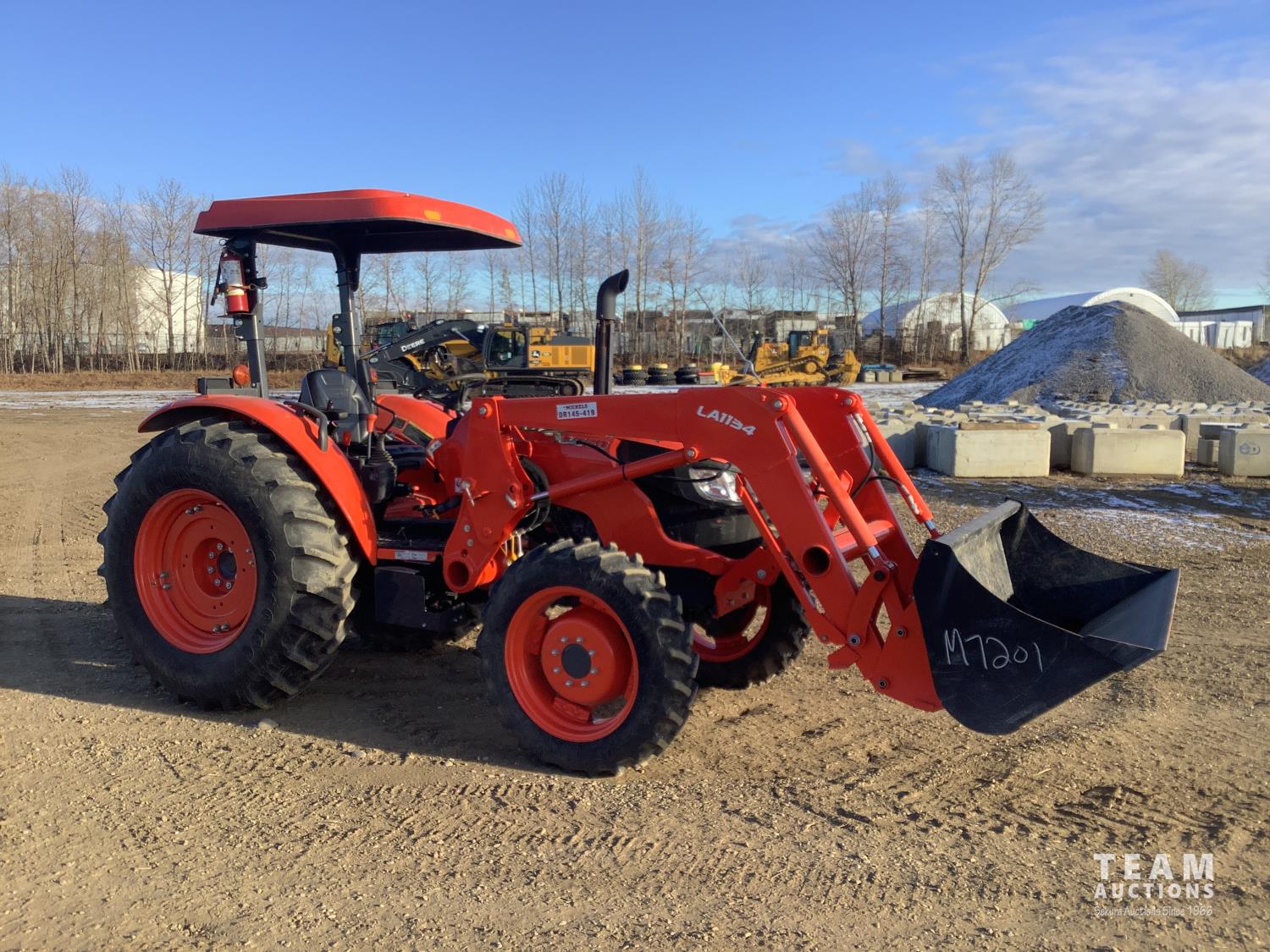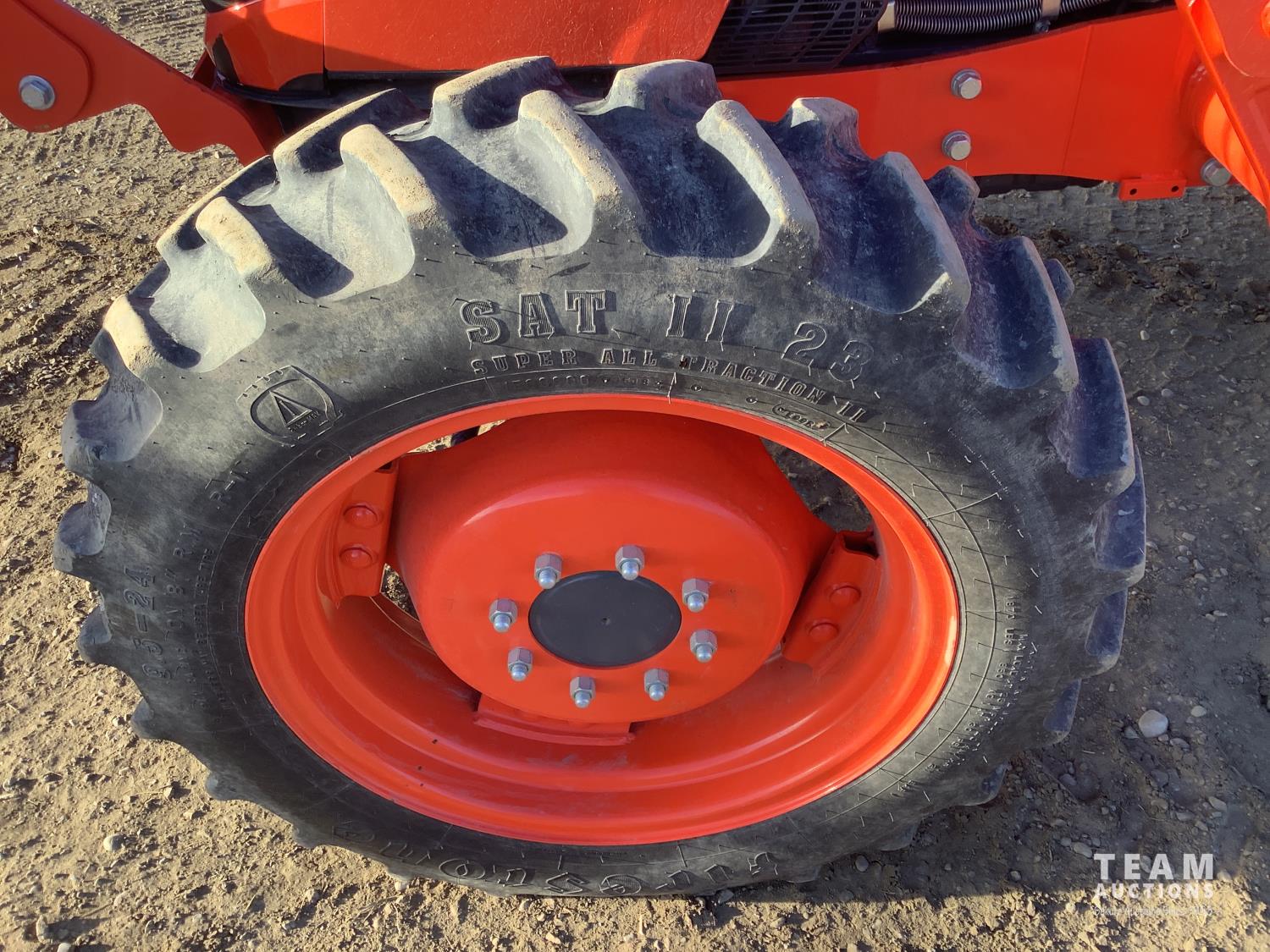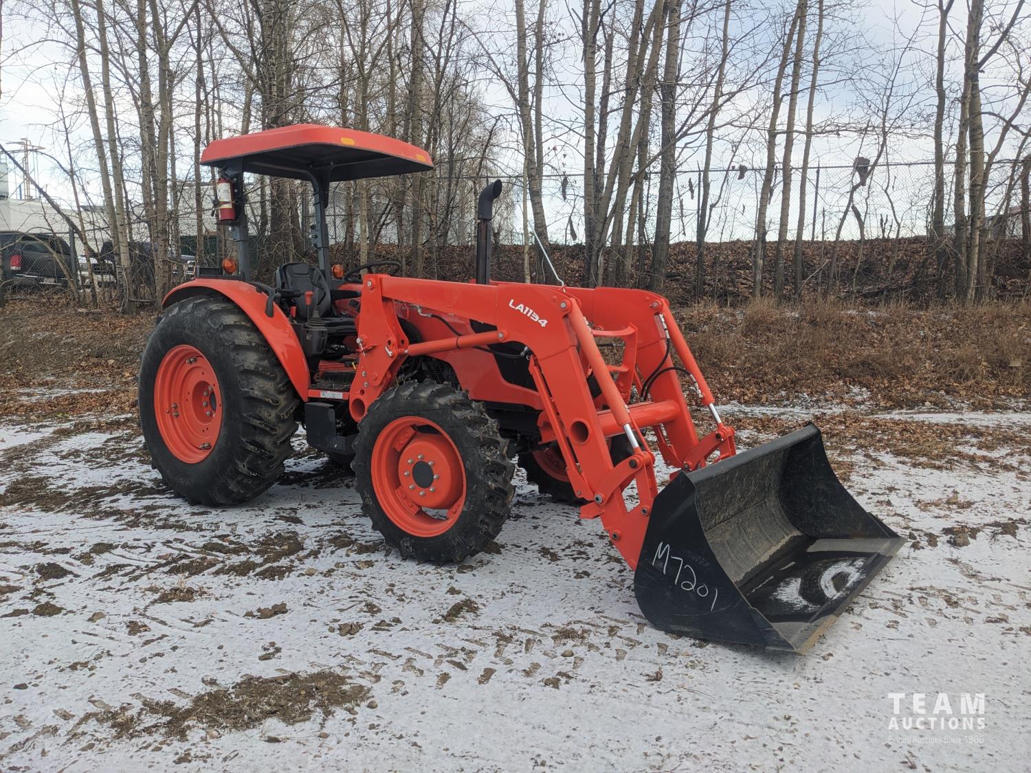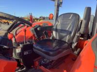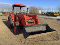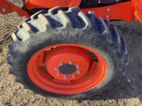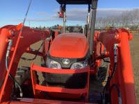 Kubota LA1134 loader, Q/A, bucket, mid mount hydraulic connection, Kubota 3.3 4 cylinder 71 HP, diesel engine, 64 PTO HP, left hand power shuttle, open station platform, joystick, ROPS canopy, 540 PTO, 3 point hitch, 1 rear hydraulic outlets, 9.5X24 front tires, 16.9X30 rear tires