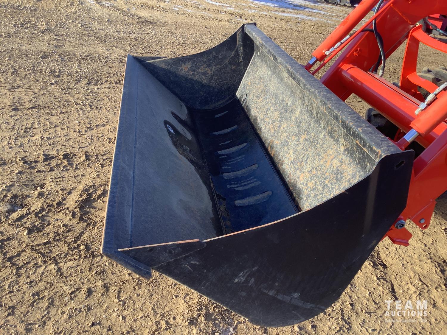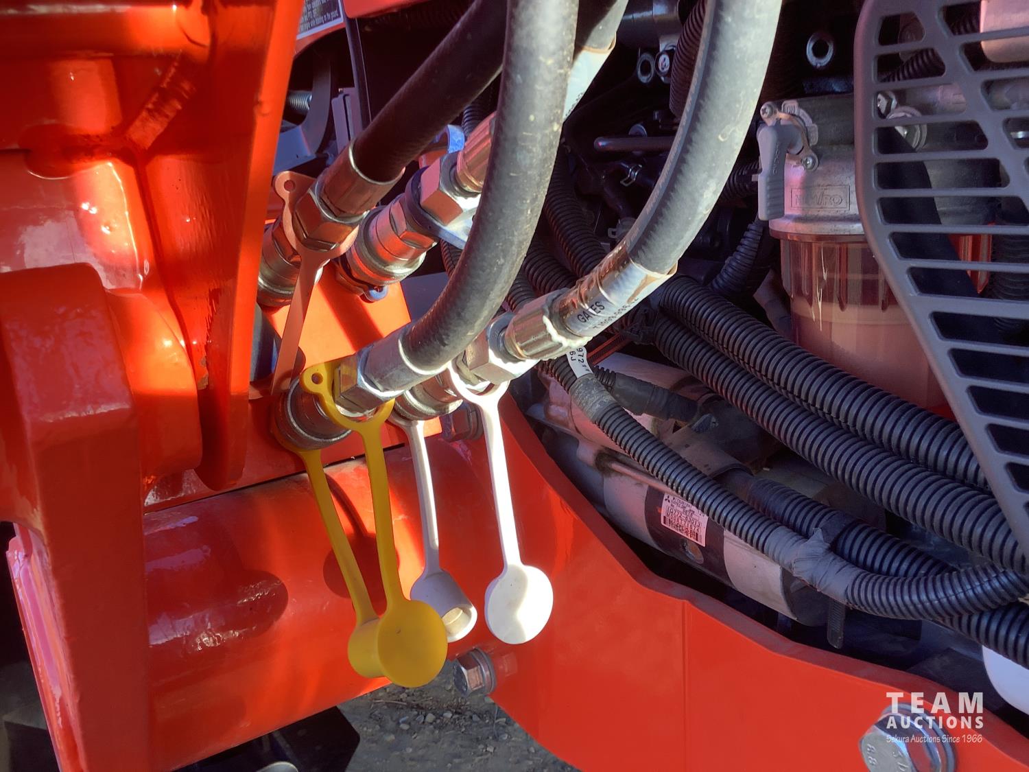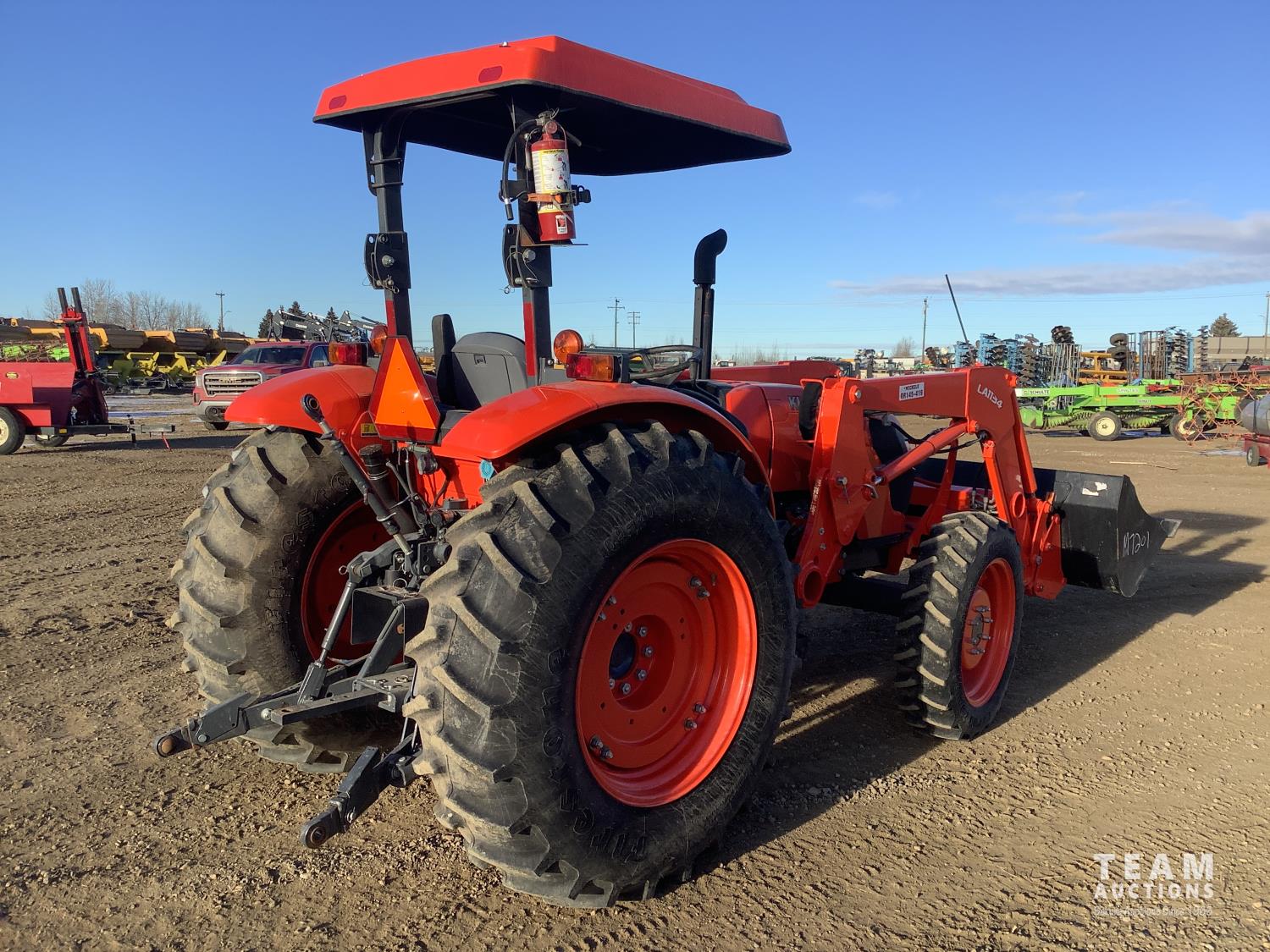Kubota LA1134 loader, Q/A, bucket, mid mount hydraulic connection, Kubota 3.3 4 cylinder 71 HP, diesel engine, 64 PTO HP, left hand power shuttle, open station platform, joystick, ROPS canopy, 540 PTO, 3 point hitch, 1 rear hydraulic outlets, 9.5X24 front tires, 16.9X30 rear tires