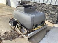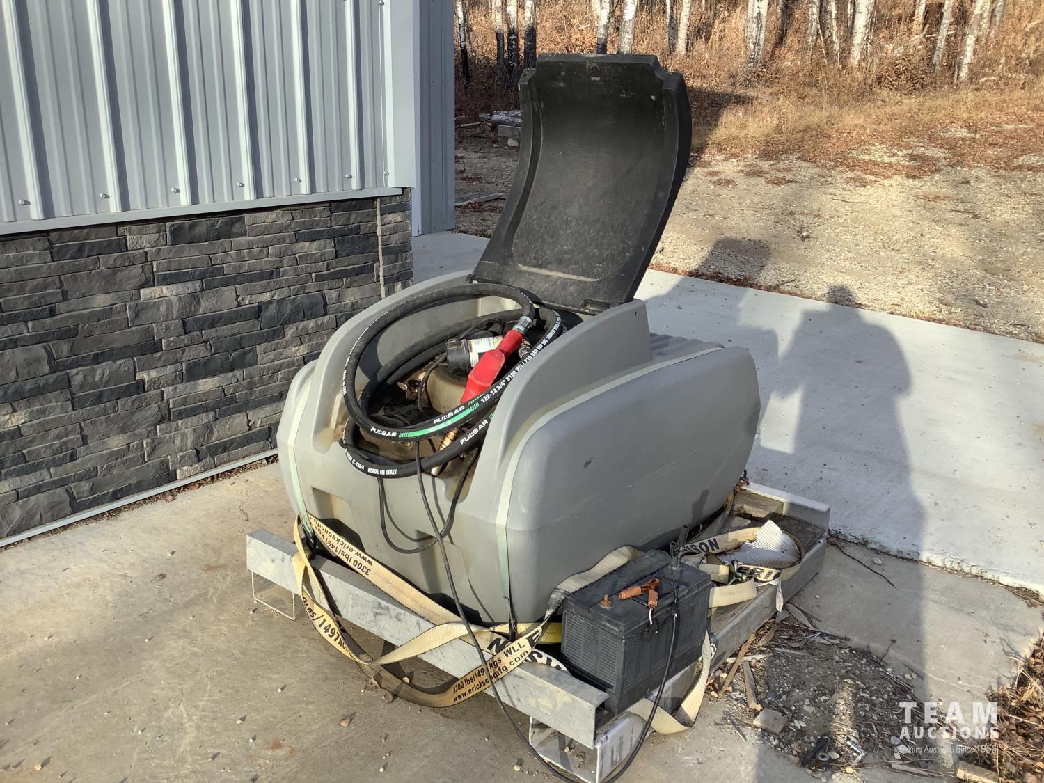 12 volt pump, hose, nozzle, mounted on metal skid frame that can be picked up with pallet forks to be moved around