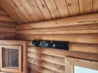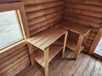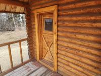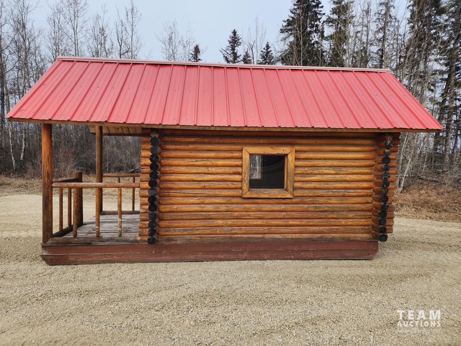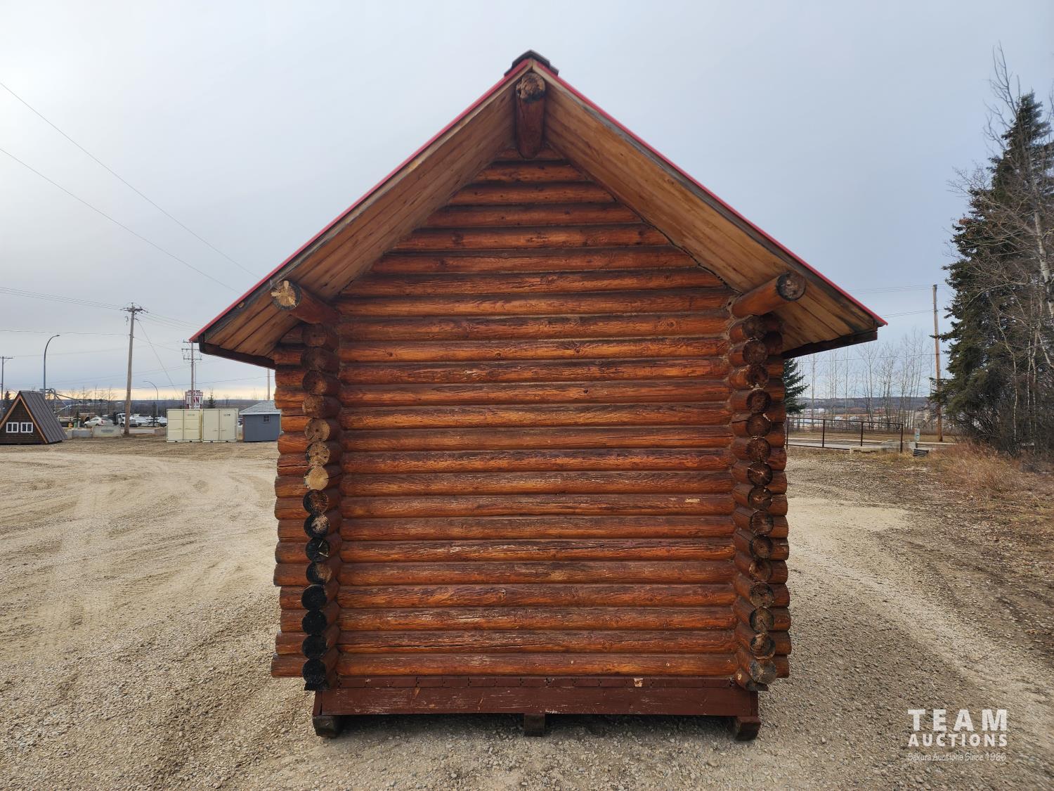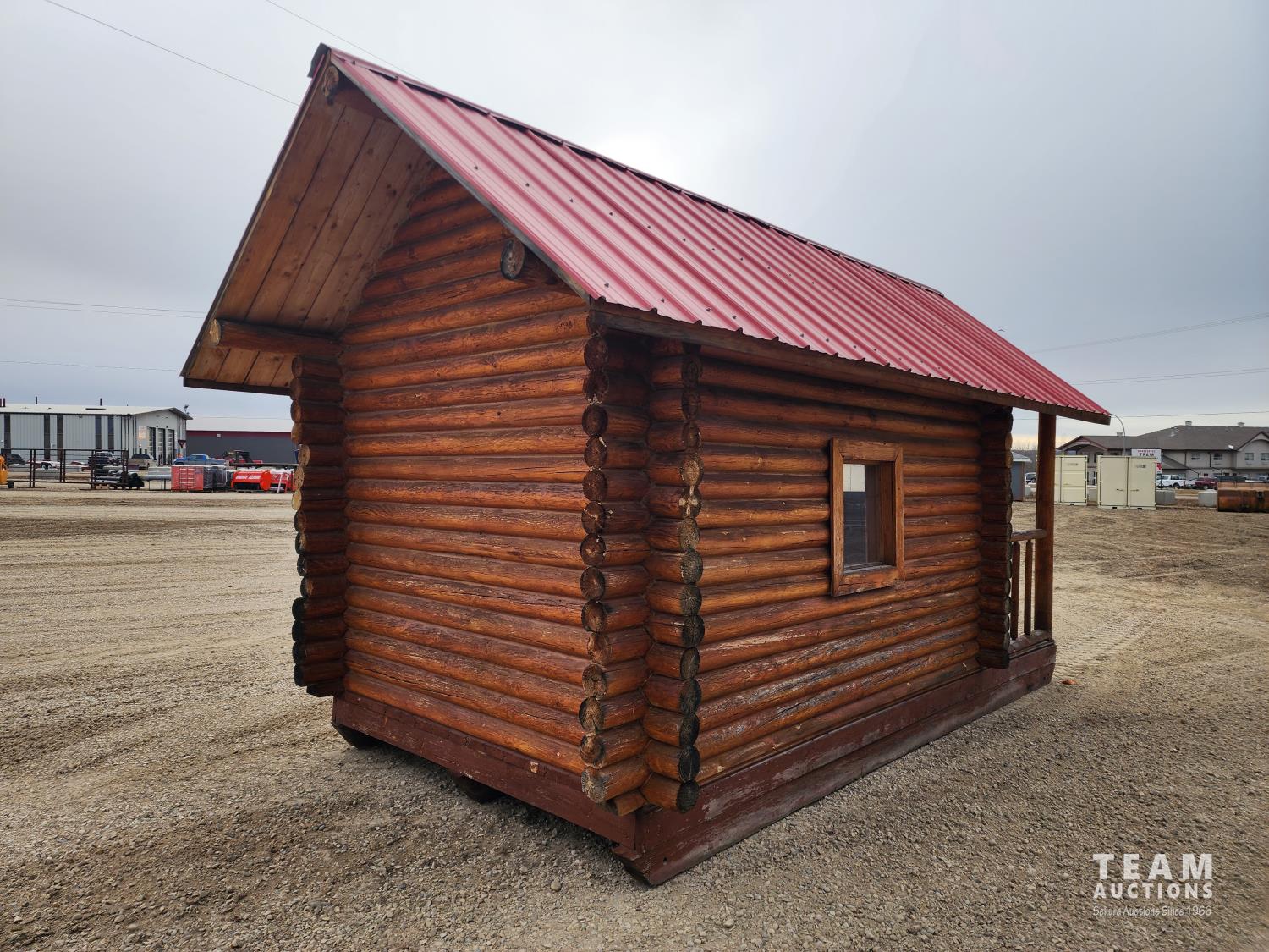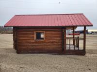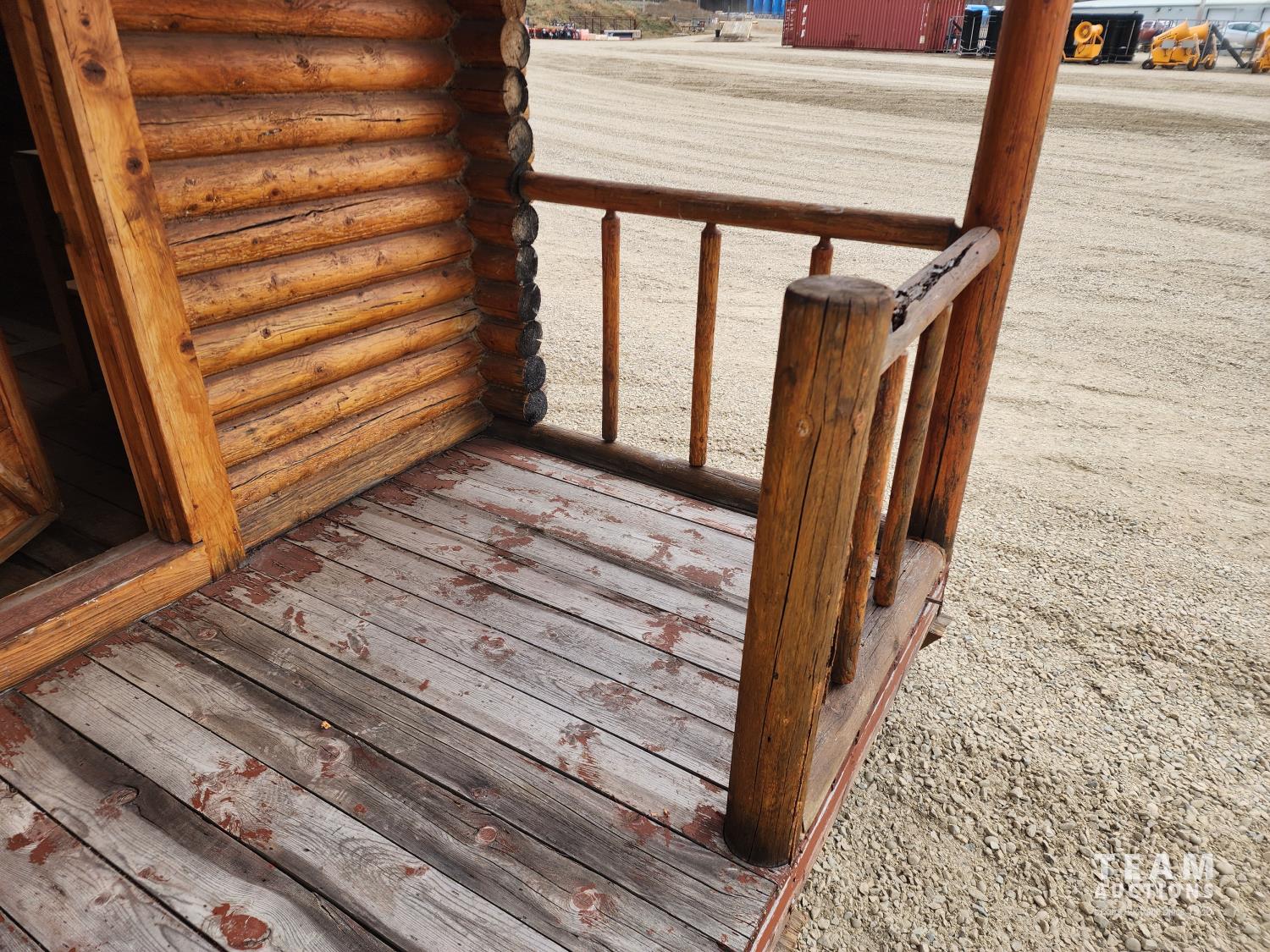 10.5 ft x 6 ft interior, 4 ft porch, 8 ft overall width, 6 ft tall walls, 8 ft ceiling, 5 inch milled logs, tin roof, board floor and ceiling, 5,000 lb, approximately 10 years old