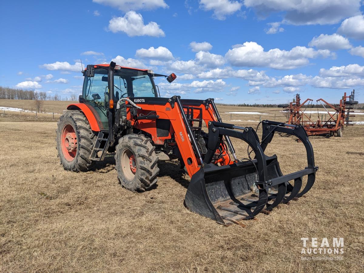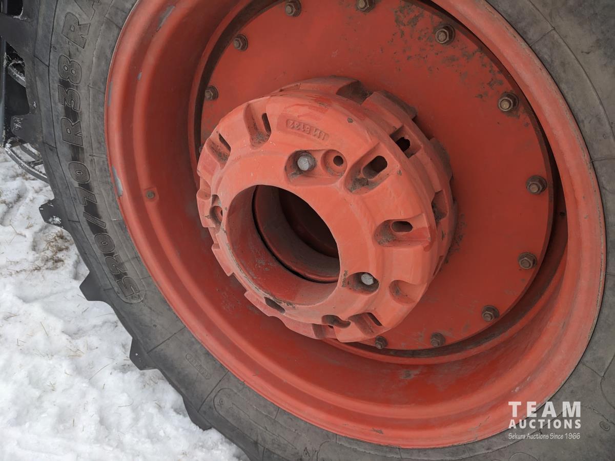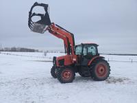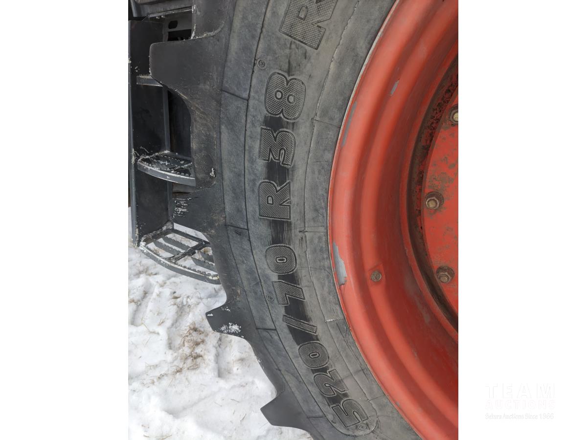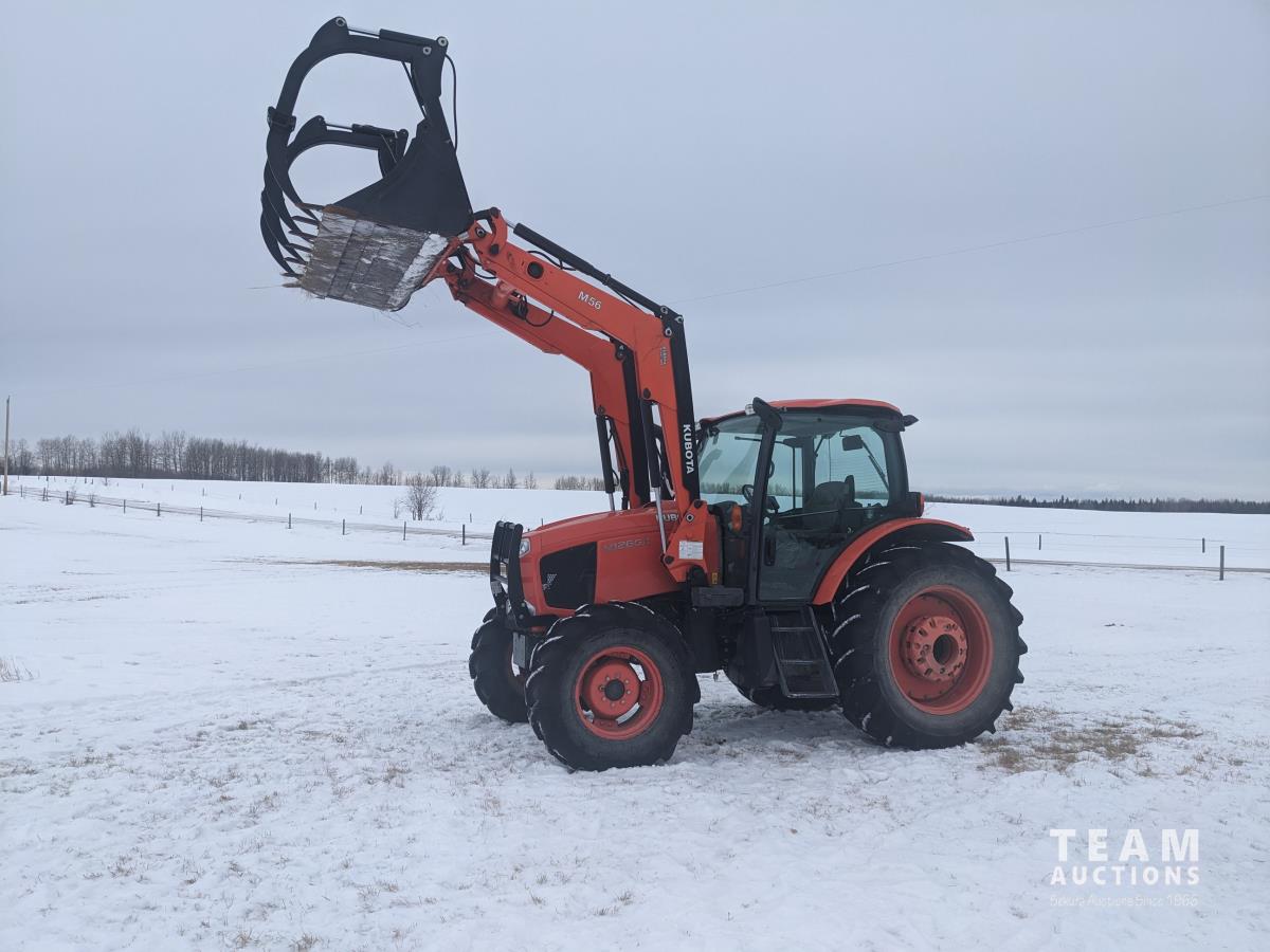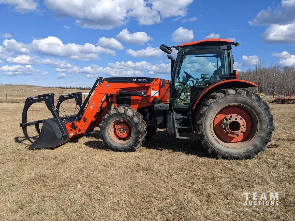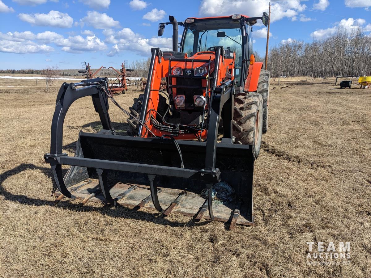 Kubota M56 loader, Q/A, 96 inch bucket, grapple, mid mount hydraulic connection, Kubota 6.1 L 4 125 HP, engine, 108 PTO HP, 24 speed Intelli-Shift partial power shift transmission, cab, left hand reverser, rear differential lock, joystick, A/C, radio, buddy seat, 540/1000 PTO, 3 point hitch, 3 point hitch exterior control, 2 rear hydraulic outlets, rear wheel weights, 420/70R24 front tires, 520/70R38 rear tires