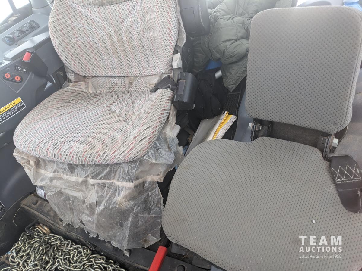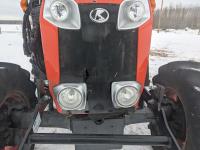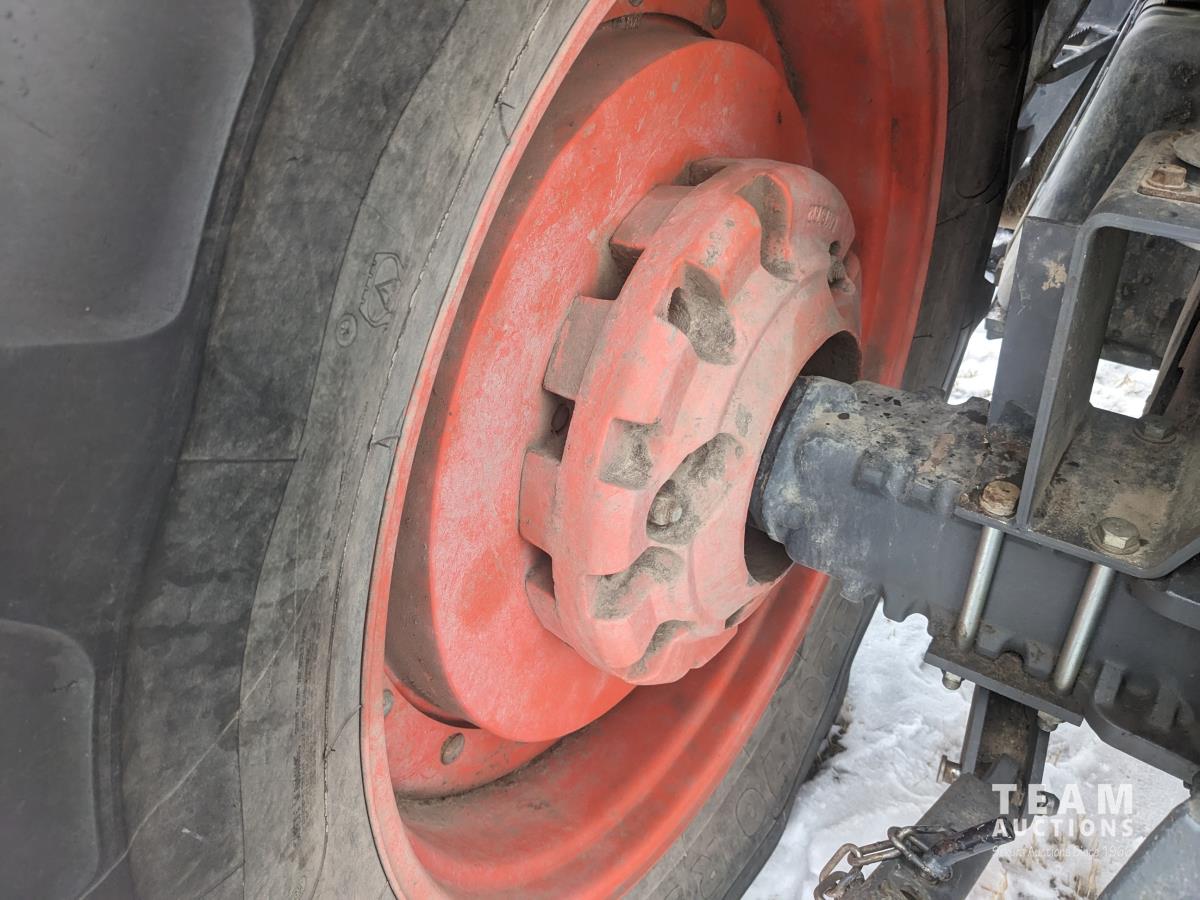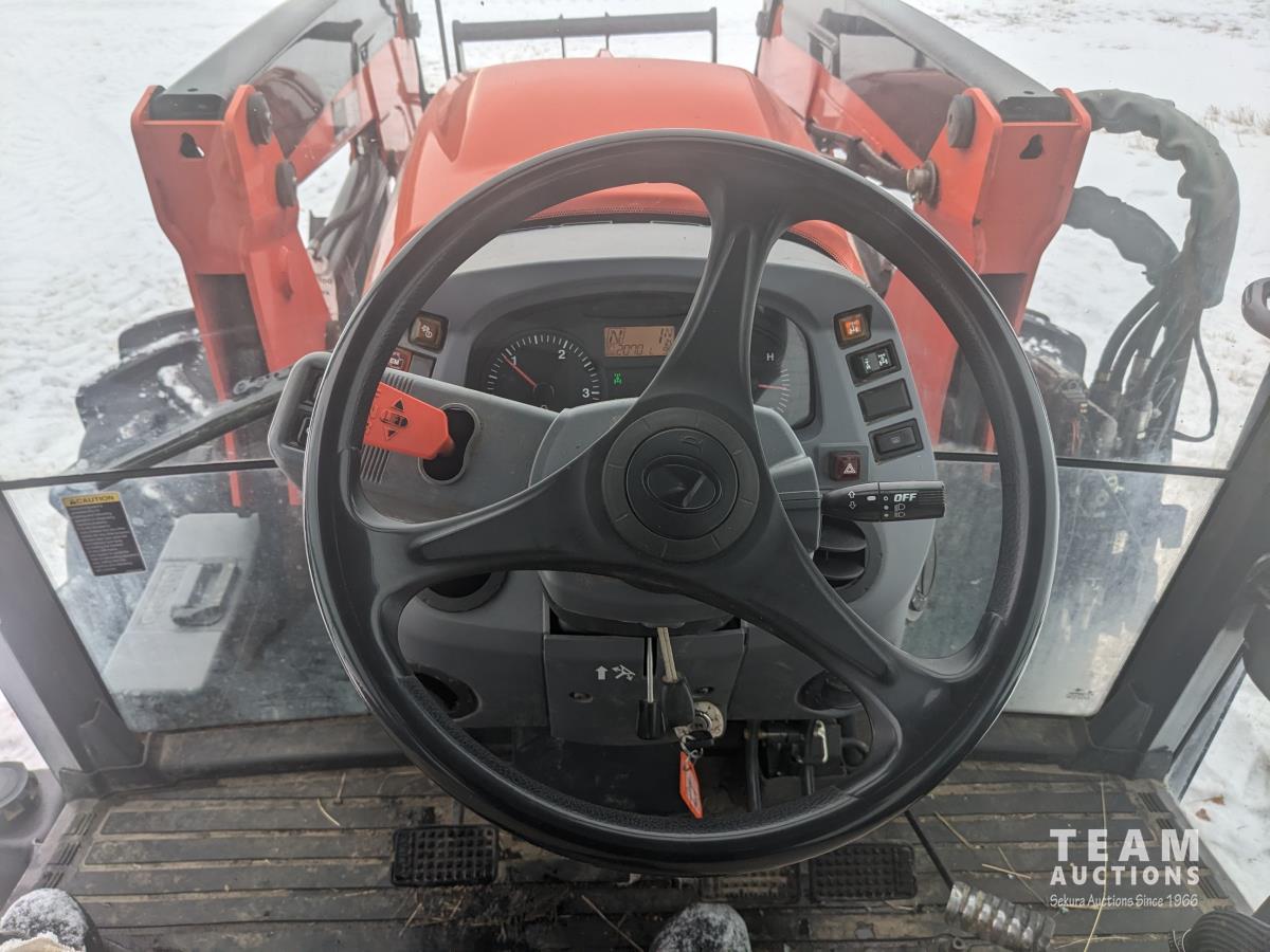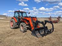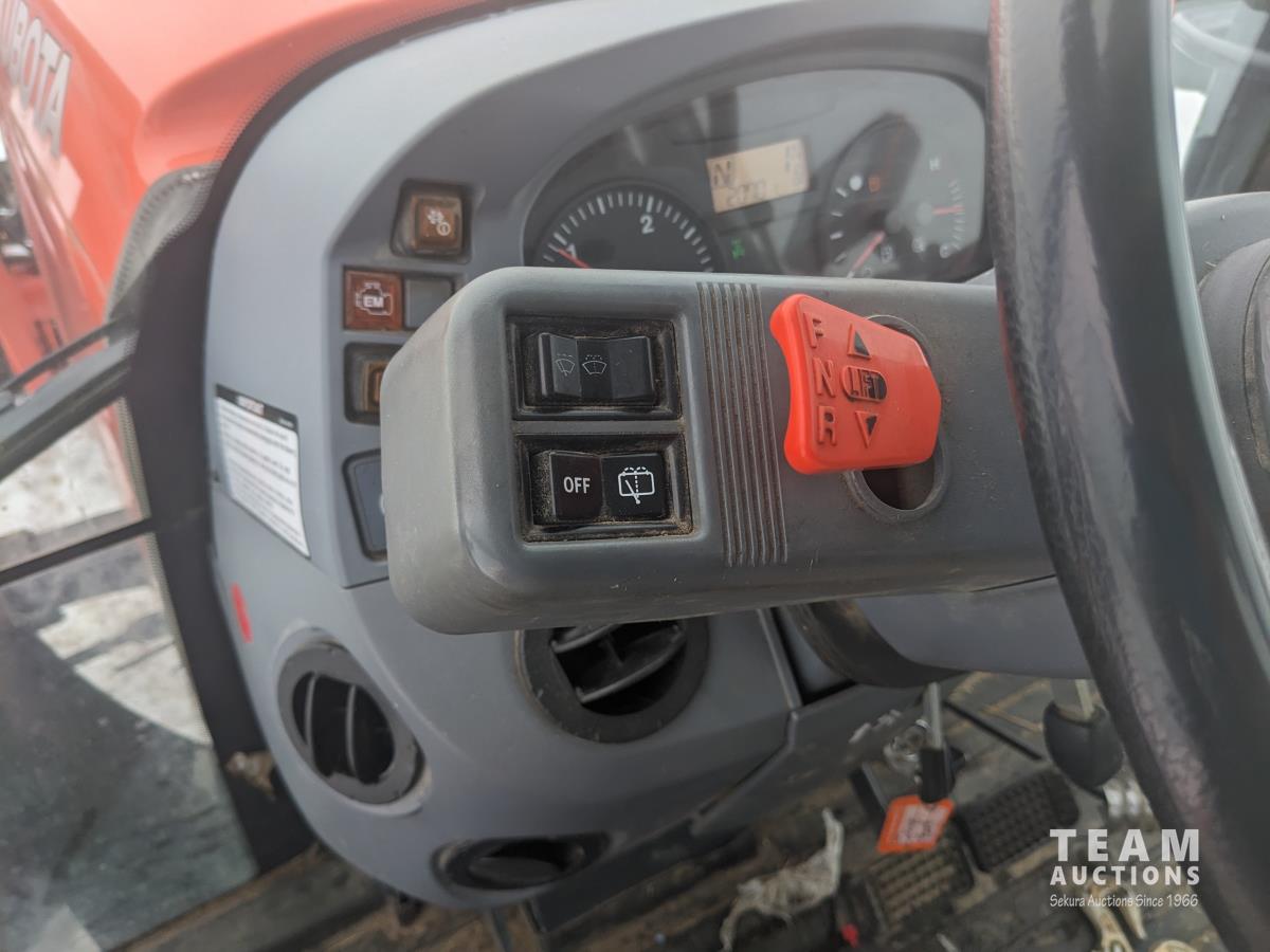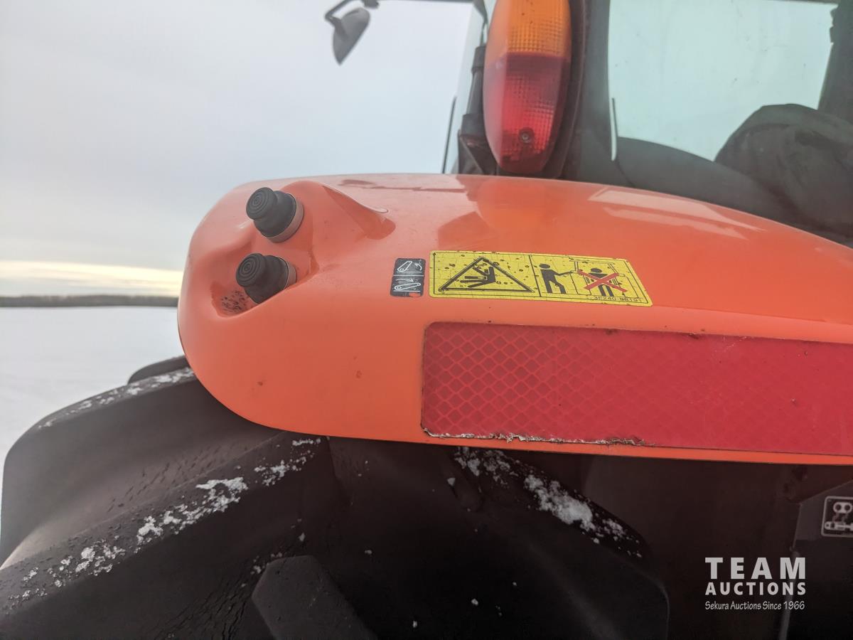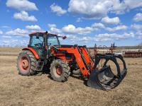 Kubota M56 loader, Q/A, 96 inch bucket, grapple, mid mount hydraulic connection, Kubota 6.1 L 4 125 HP, engine, 108 PTO HP, 24 speed Intelli-Shift partial power shift transmission, cab, left hand reverser, rear differential lock, joystick, A/C, radio, buddy seat, 540/1000 PTO, 3 point hitch, 3 point hitch exterior control, 2 rear hydraulic outlets, rear wheel weights, 420/70R24 front tires, 520/70R38 rear tires