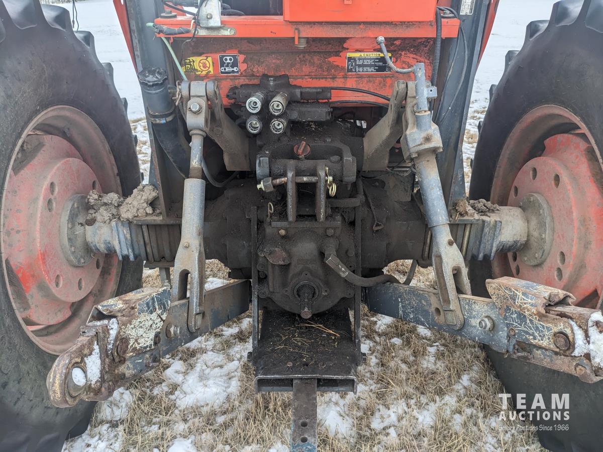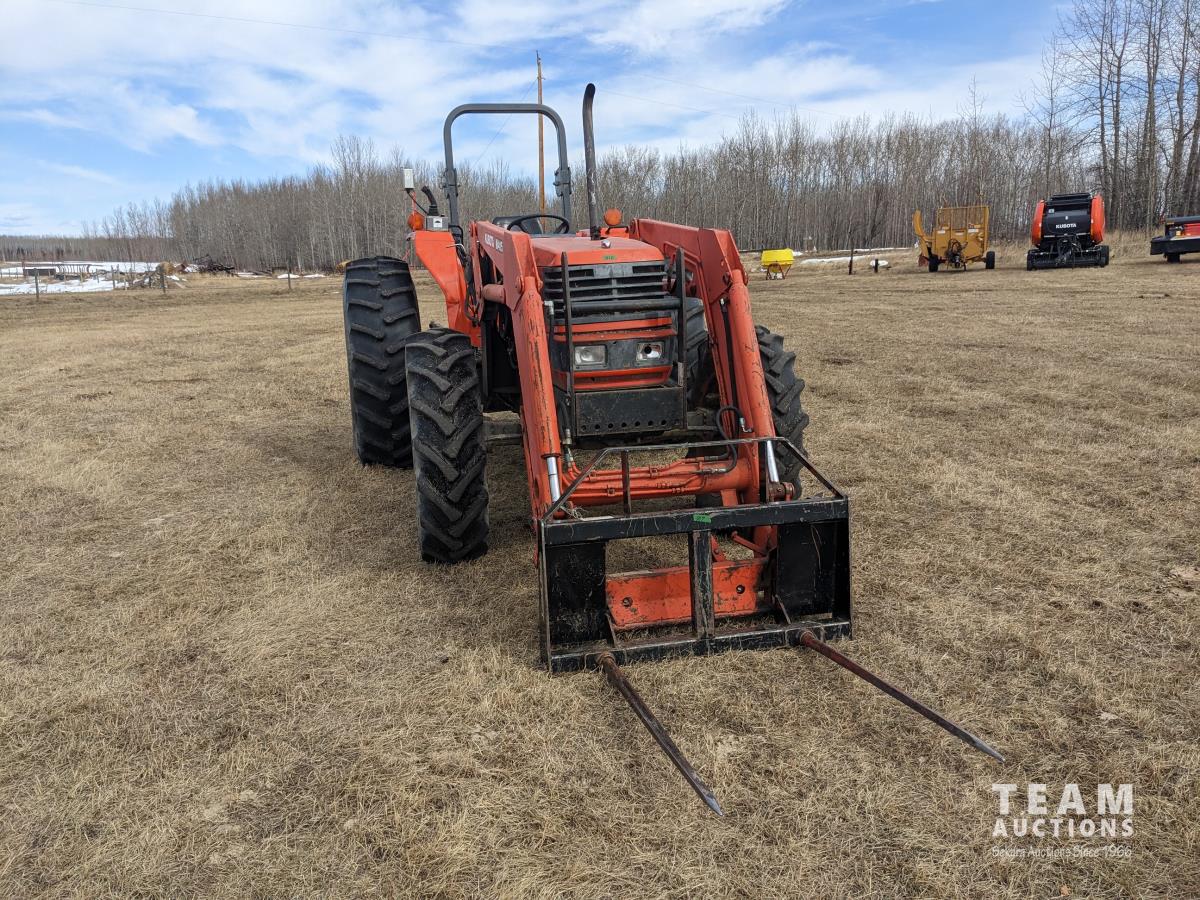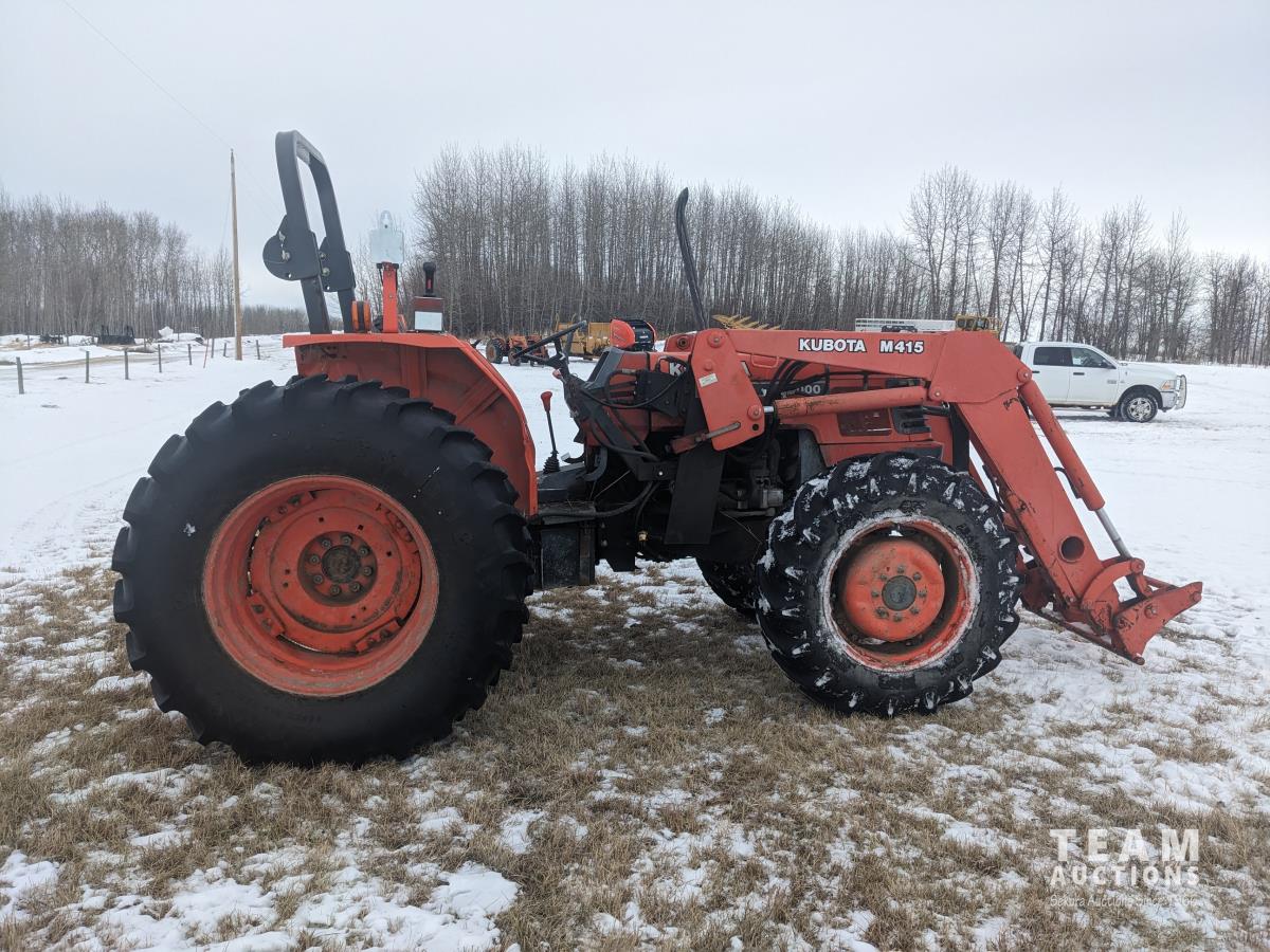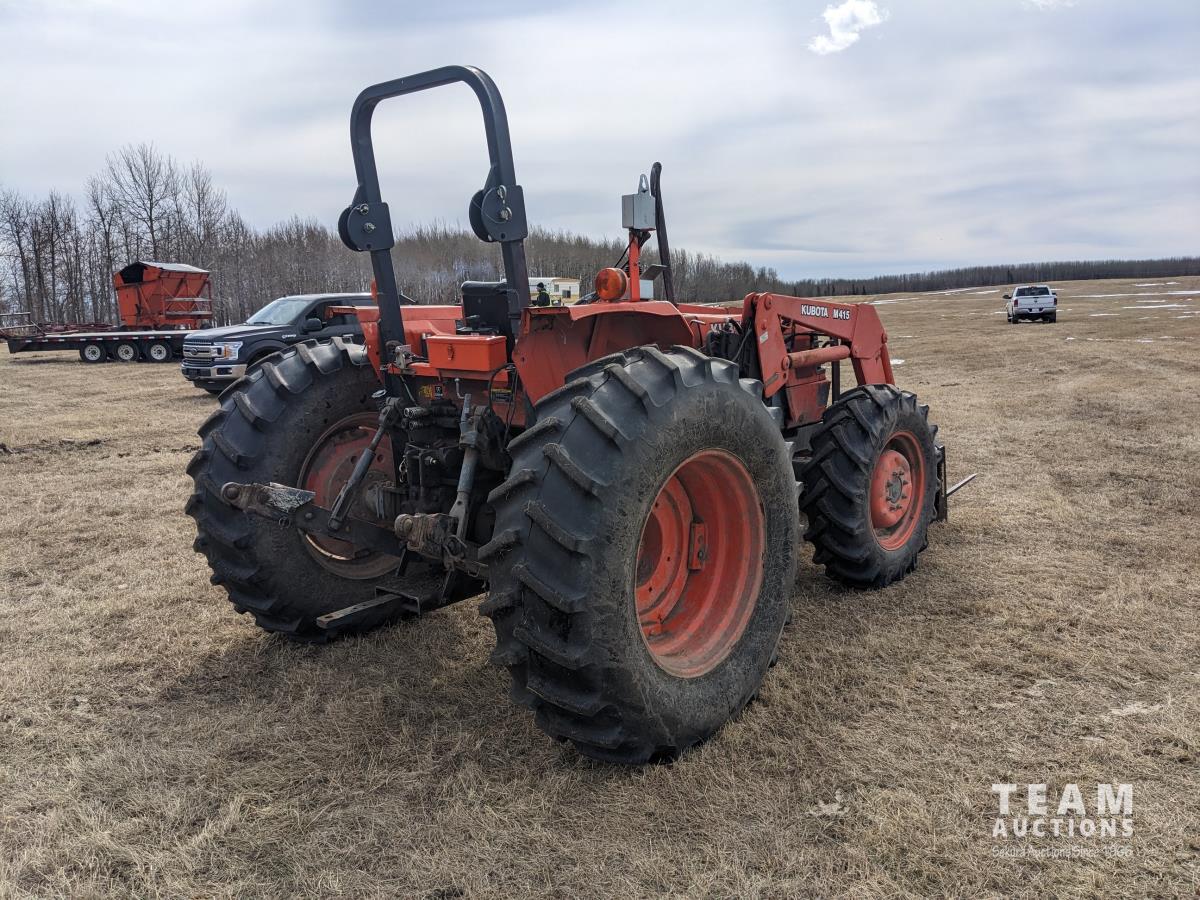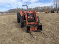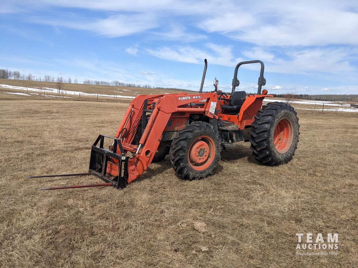 Kubota M415 loader, Q/A, bale forks, Kubota 3.3 L 4 cylinder 92 HP, diesel engine, 80 PTO HP, 12 speed manual transmission, ROPS, shuttle shift, 540/1000 PTO, 3 point hitch, 2 rear hydraulic outlets, 12.4-24 front tires, 18.4-30 rear tires