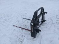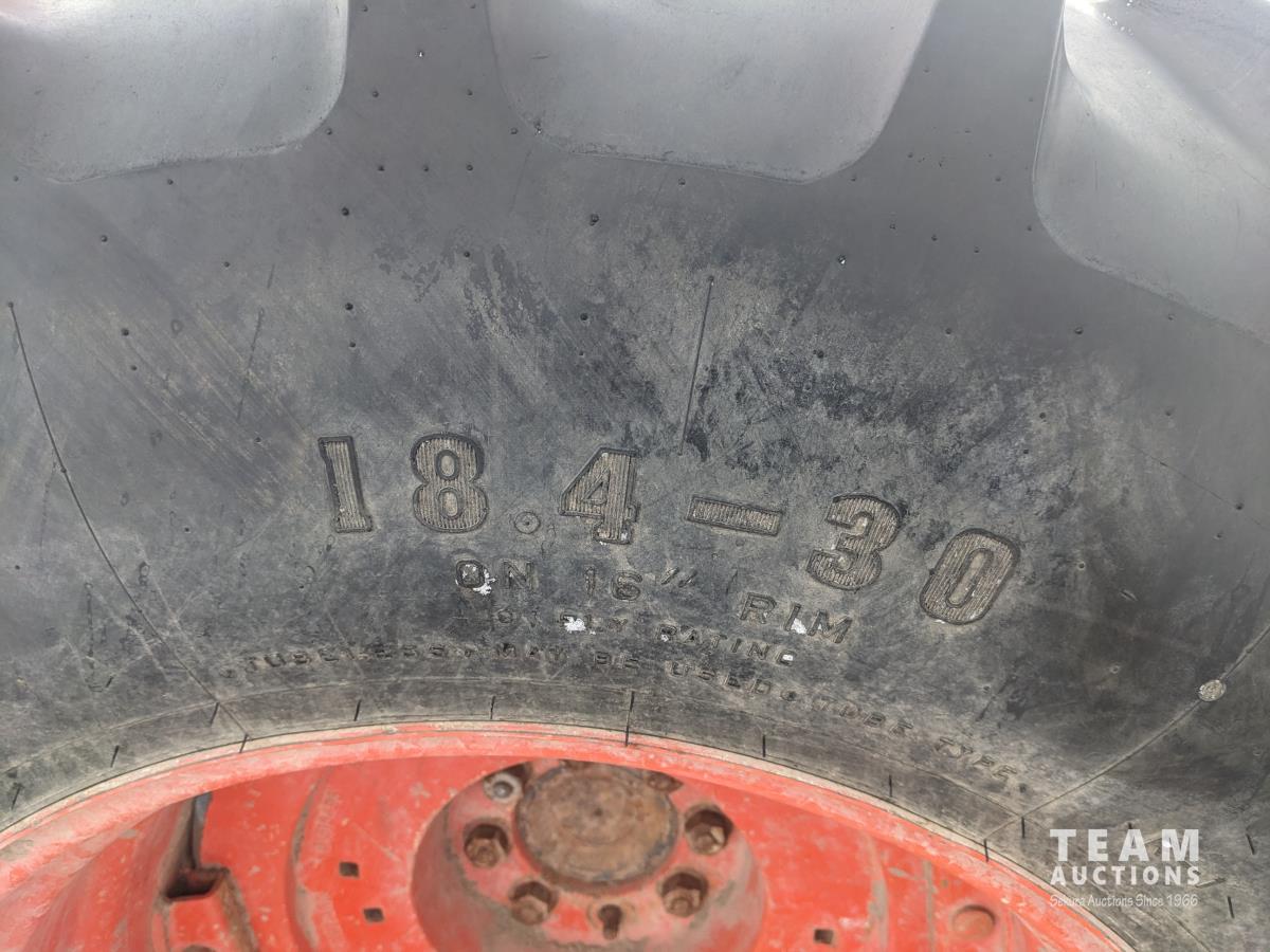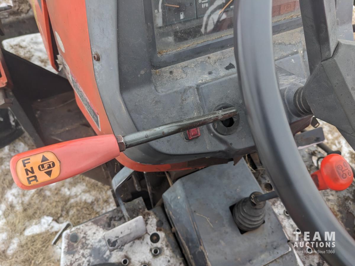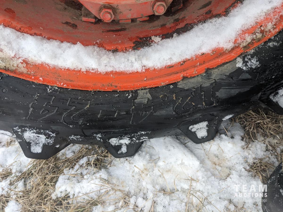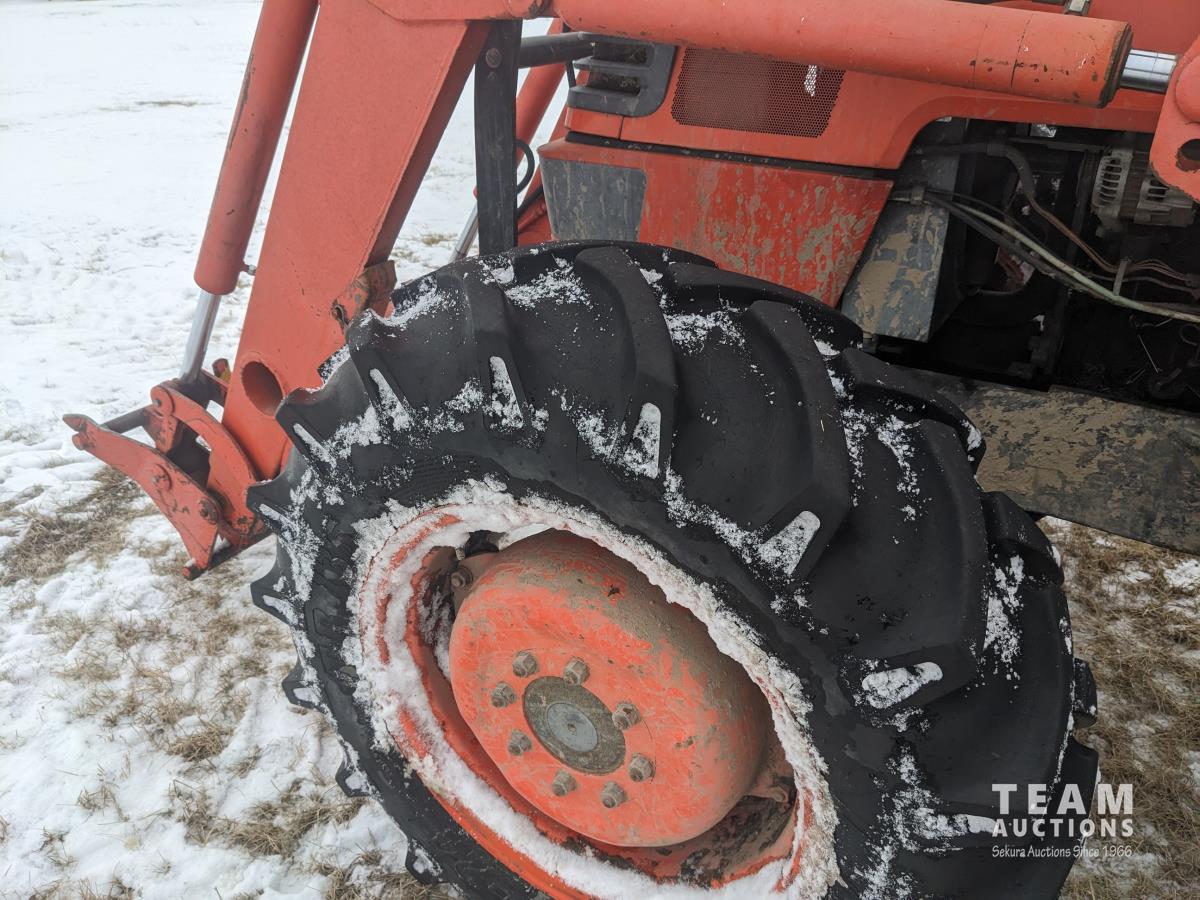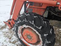 Kubota M415 loader, Q/A, bale forks, Kubota 3.3 L 4 cylinder 92 HP, diesel engine, 80 PTO HP, 12 speed manual transmission, ROPS, shuttle shift, 540/1000 PTO, 3 point hitch, 2 rear hydraulic outlets, 12.4-24 front tires, 18.4-30 rear tires