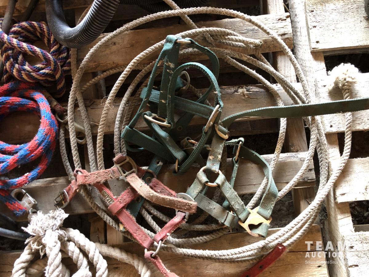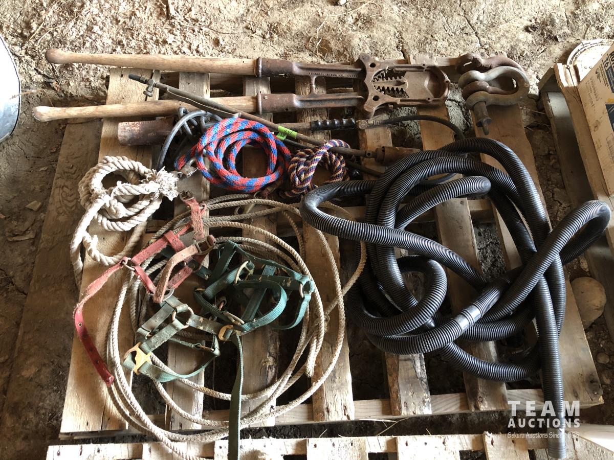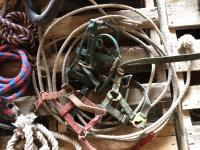 Large dehorners, poly discharge hose, (2) tiger torches, bridles, lead ropes, (2) shackles