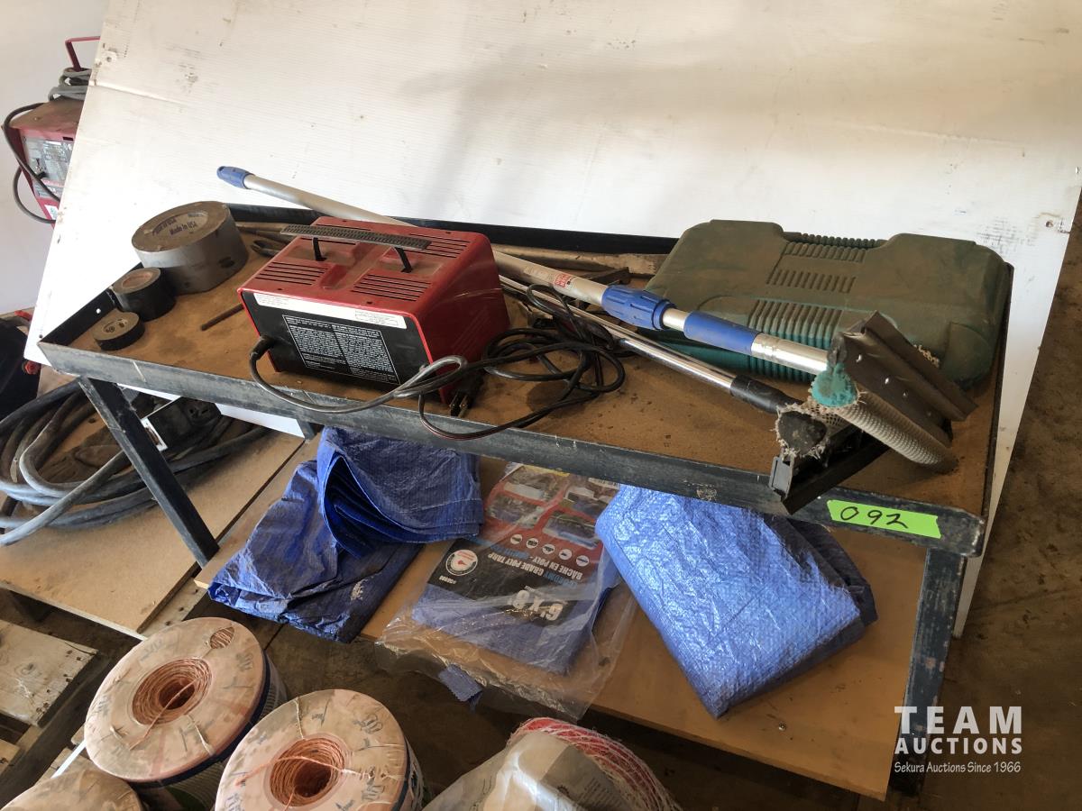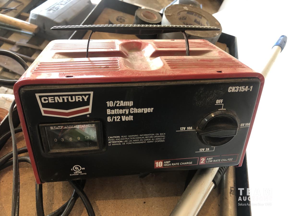 Bench 44 inch L X 14 inch W X 26 inch H, century 10 amp charger, socket set, miscellaneous tools