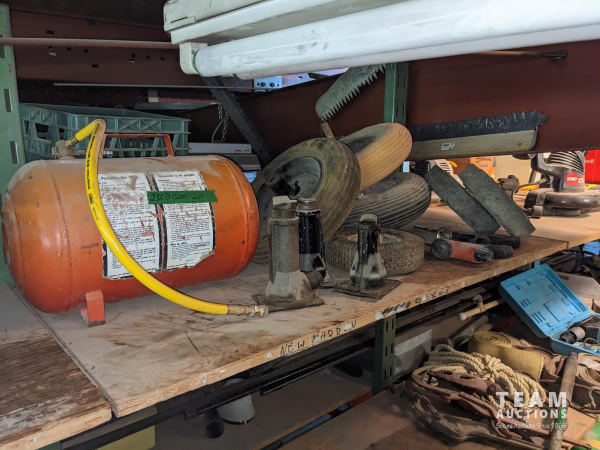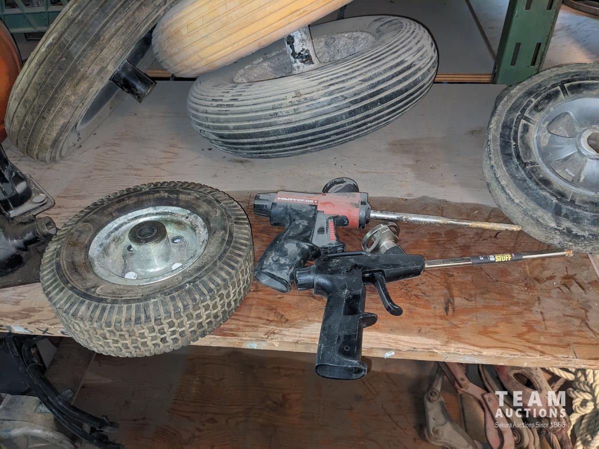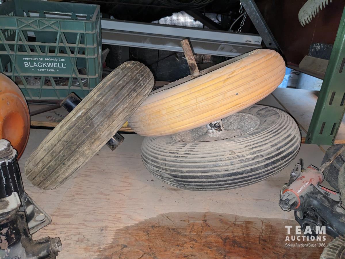 212 (3) Wheel Barrows Wheels, (2) Foam Guns, Air Tank, (3) Wheels and (3) Small Car Jacks