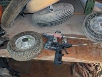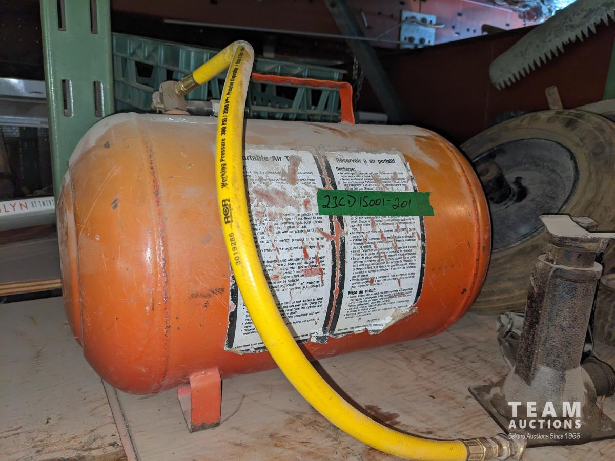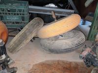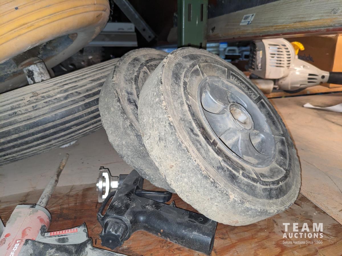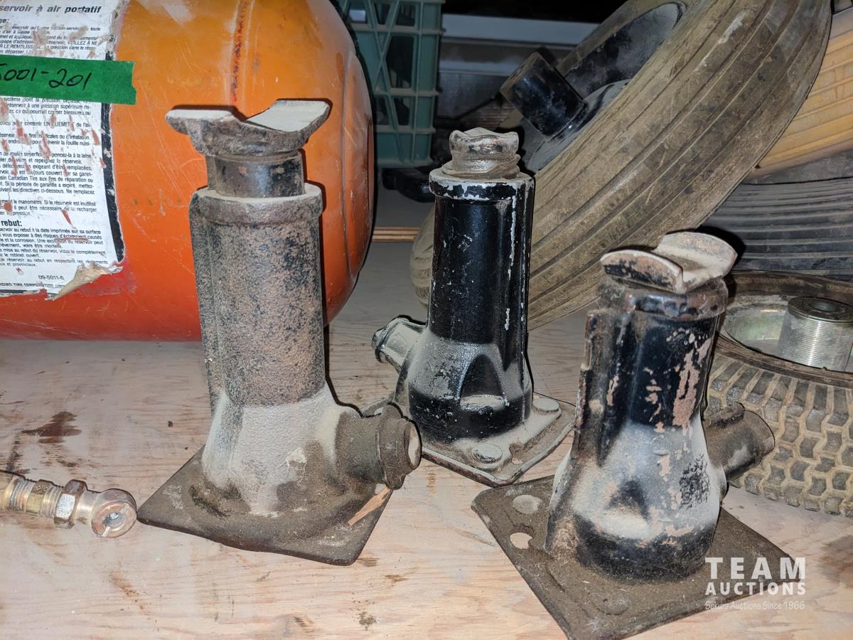 212 (3) Wheel Barrows Wheels, (2) Foam Guns, Air Tank, (3) Wheels and (3) Small Car Jacks