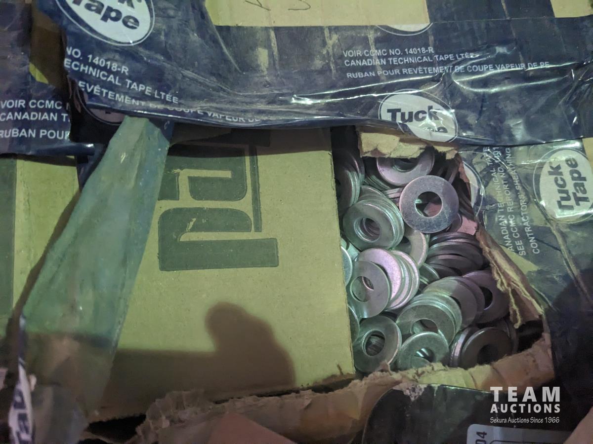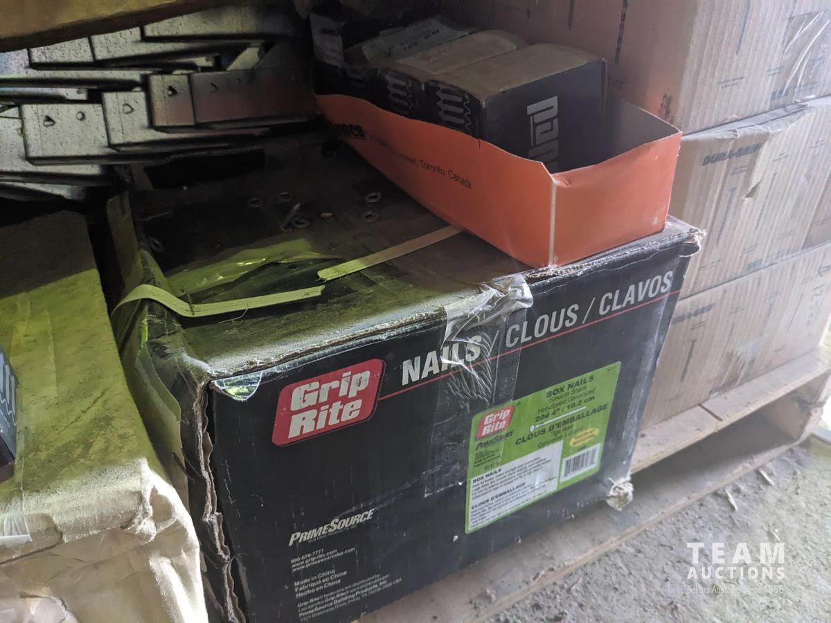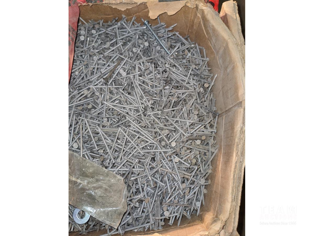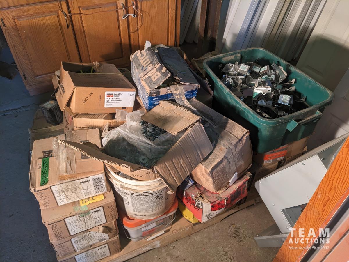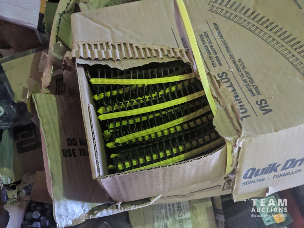 quick drive screws, assorted washers, joist hangers, various sized nails, 2-1/2" roofing nails, air gun coil nails, staples