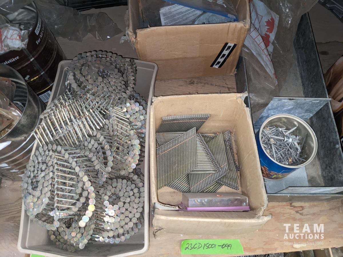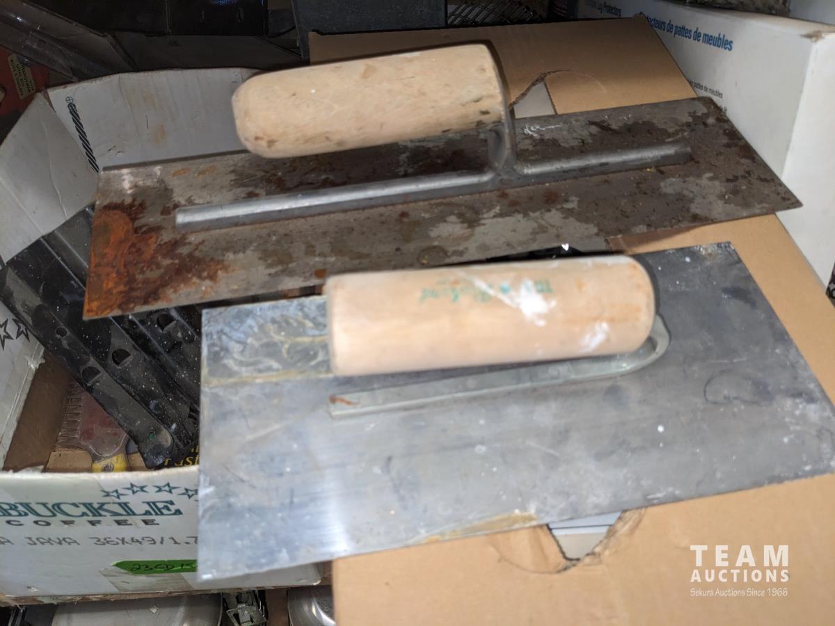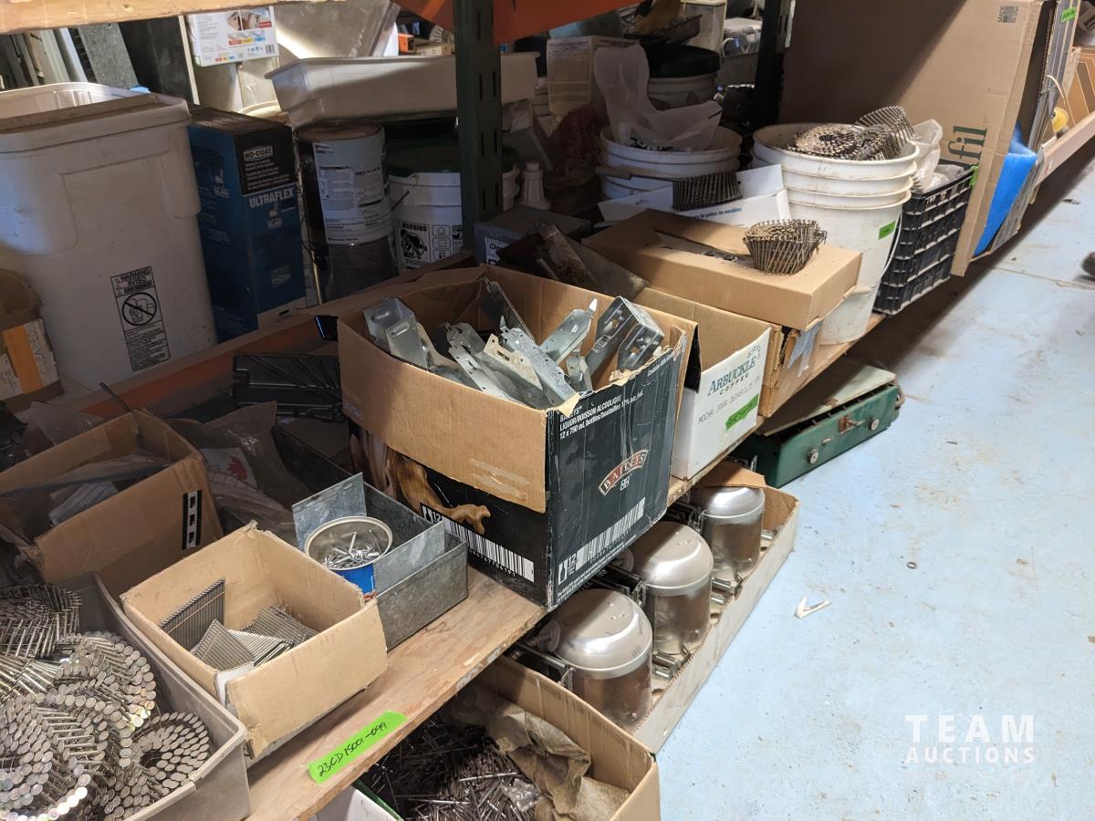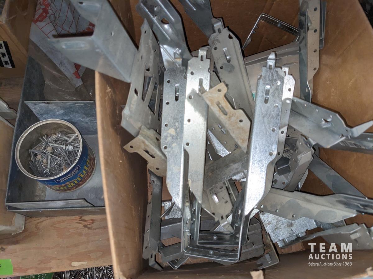 Qty of miscellaneous hardware, nails for air nailer, toilet tank lid, concrete form ties, trowels, box of joist hangers