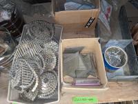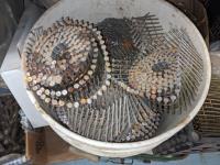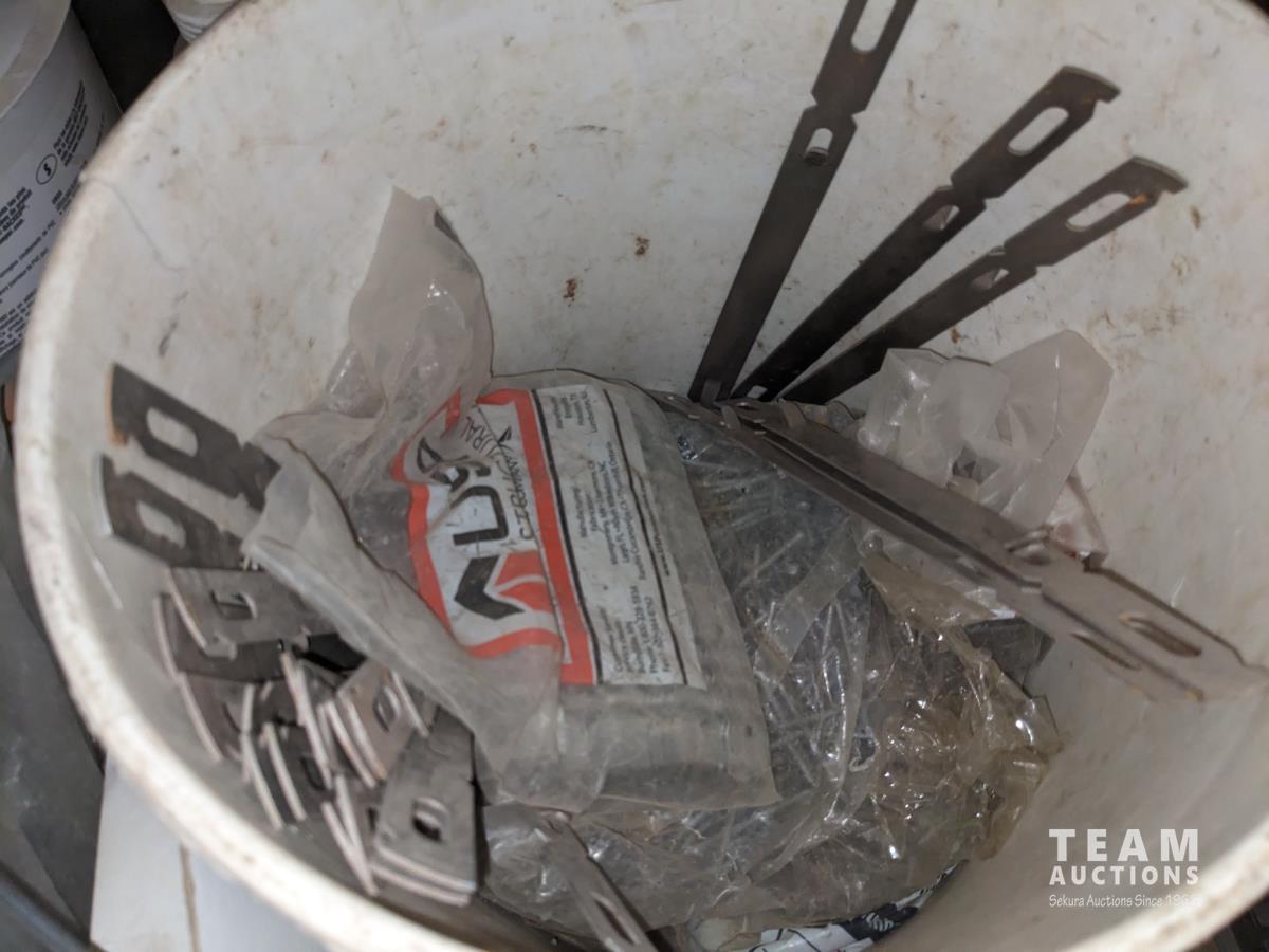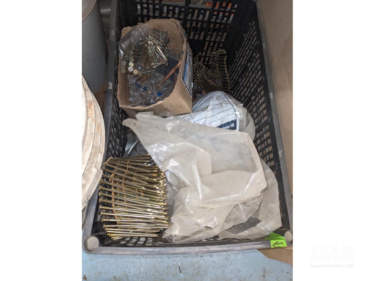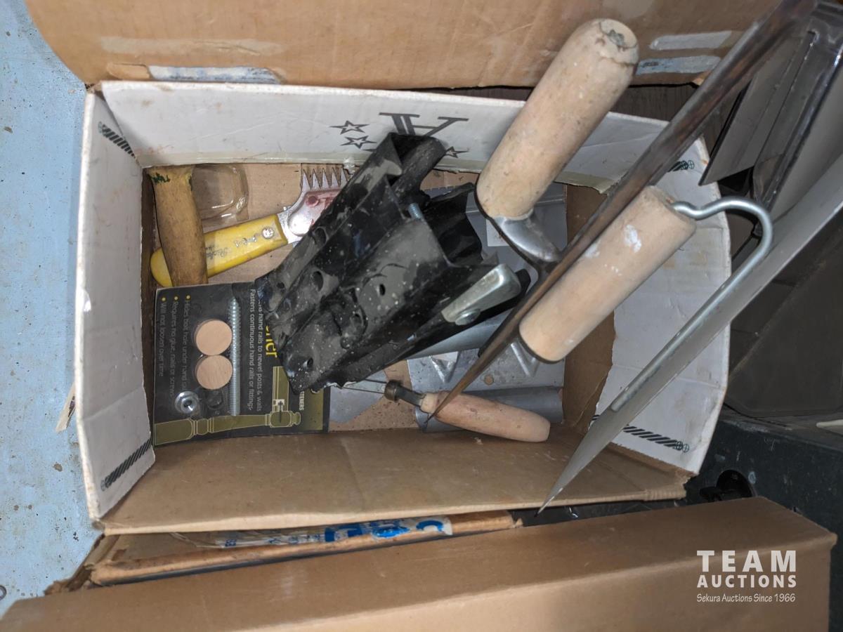 Qty of miscellaneous hardware, nails for air nailer, toilet tank lid, concrete form ties, trowels, box of joist hangers
