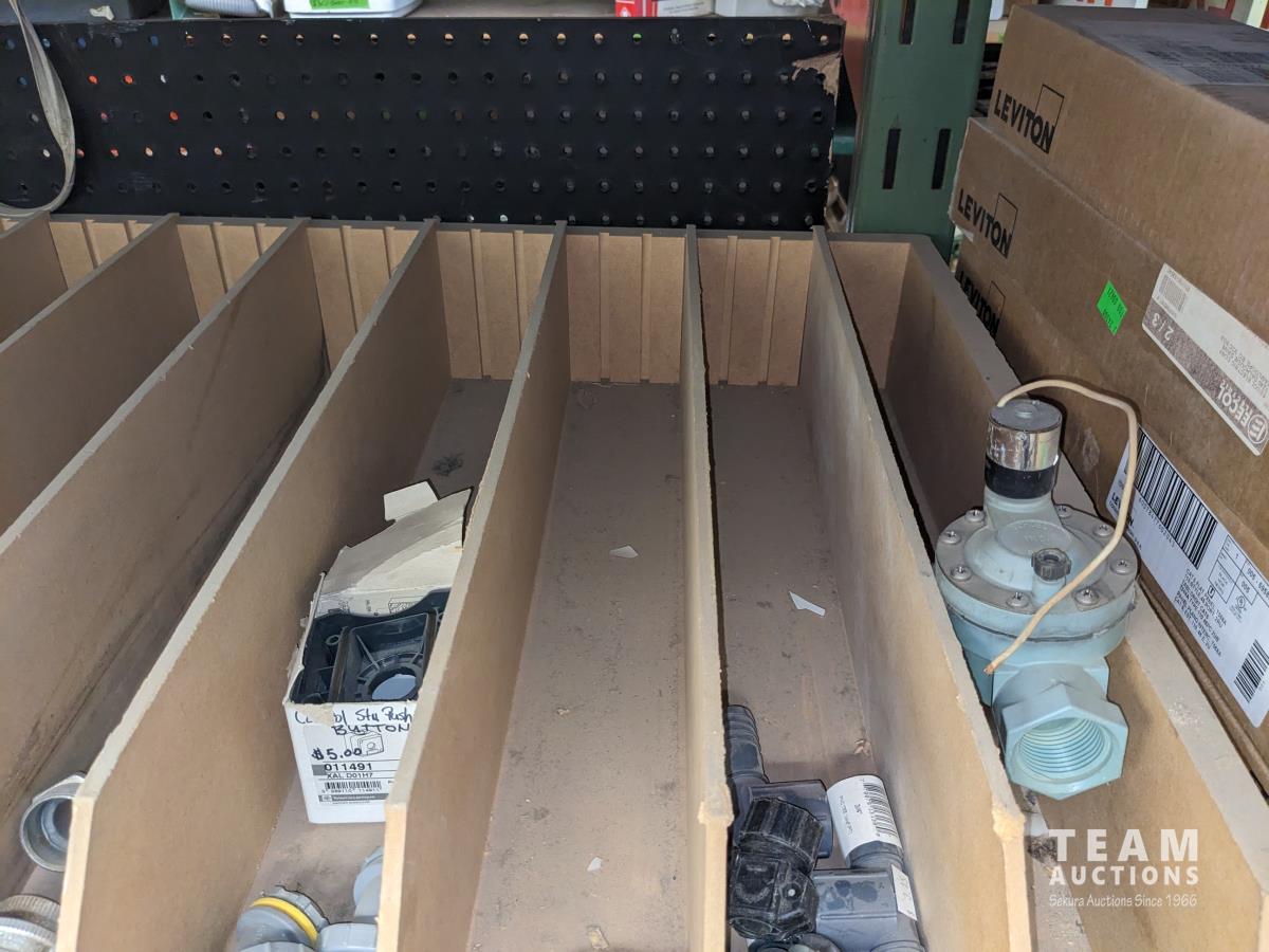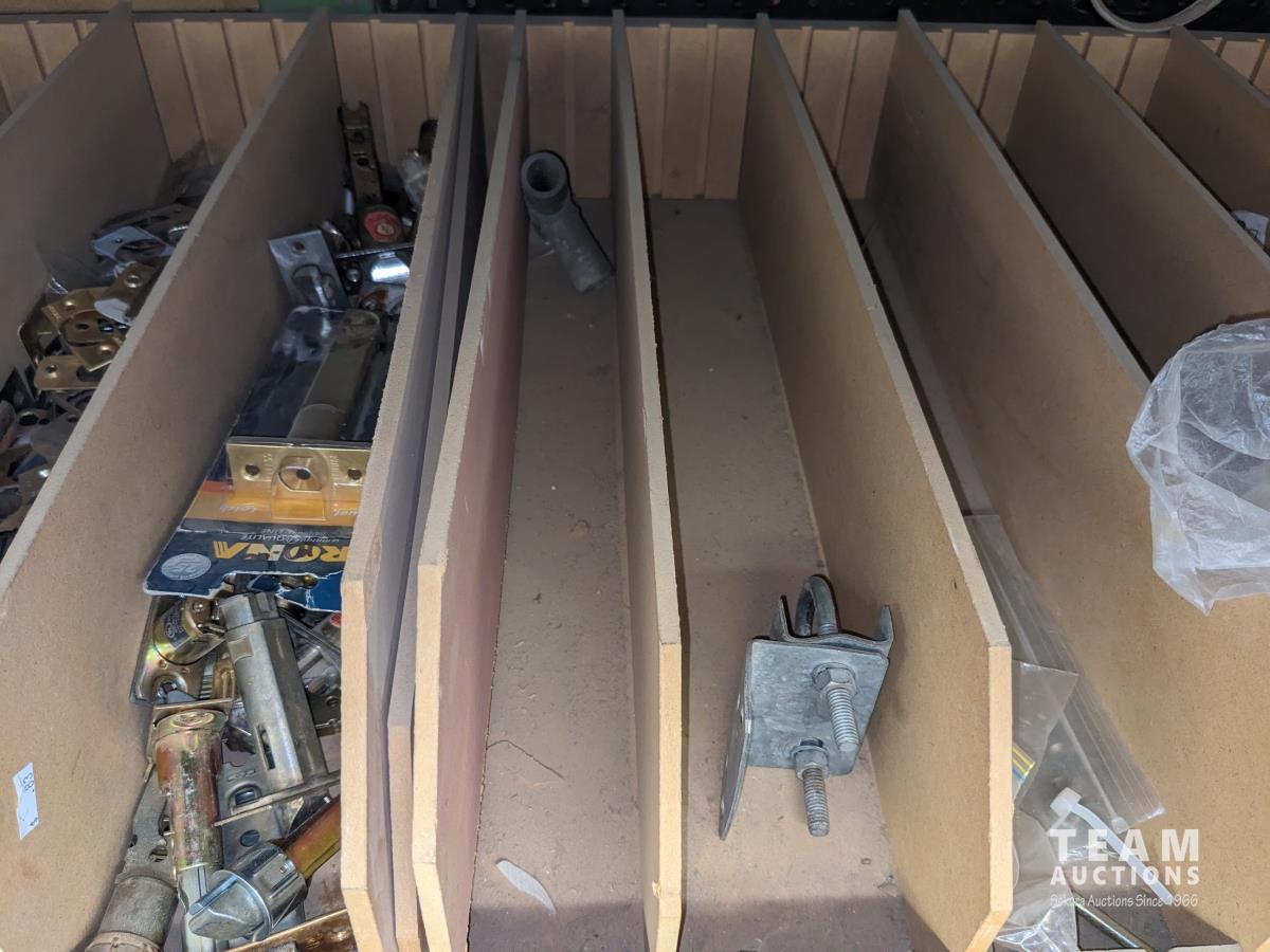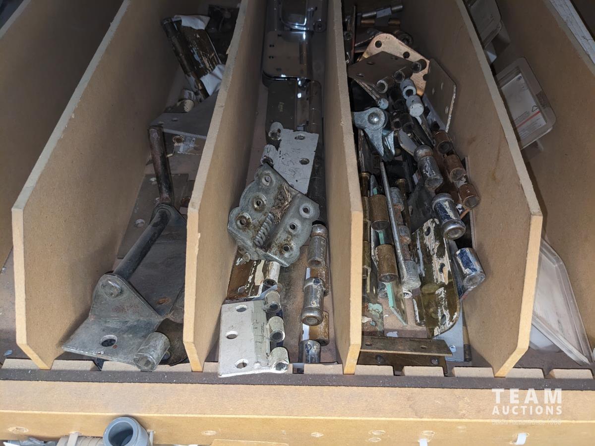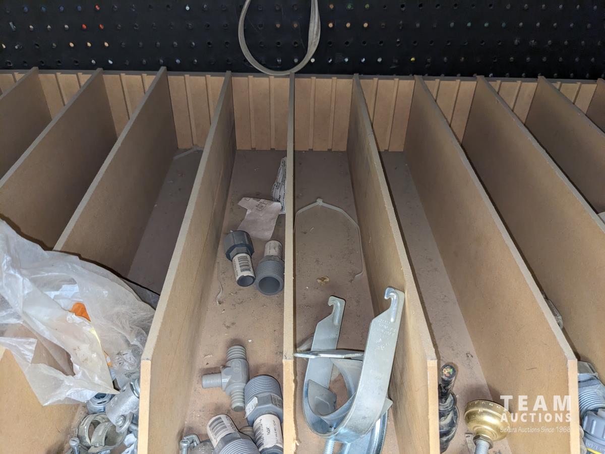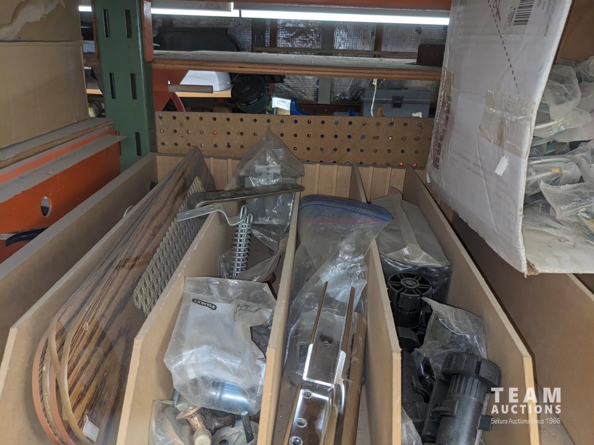 Various pipe fittings and connectors, various door hardware and hinges, ceiling fan blades