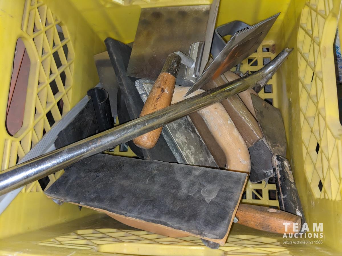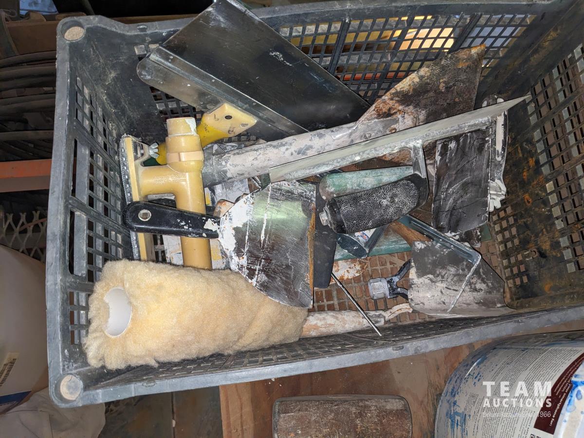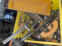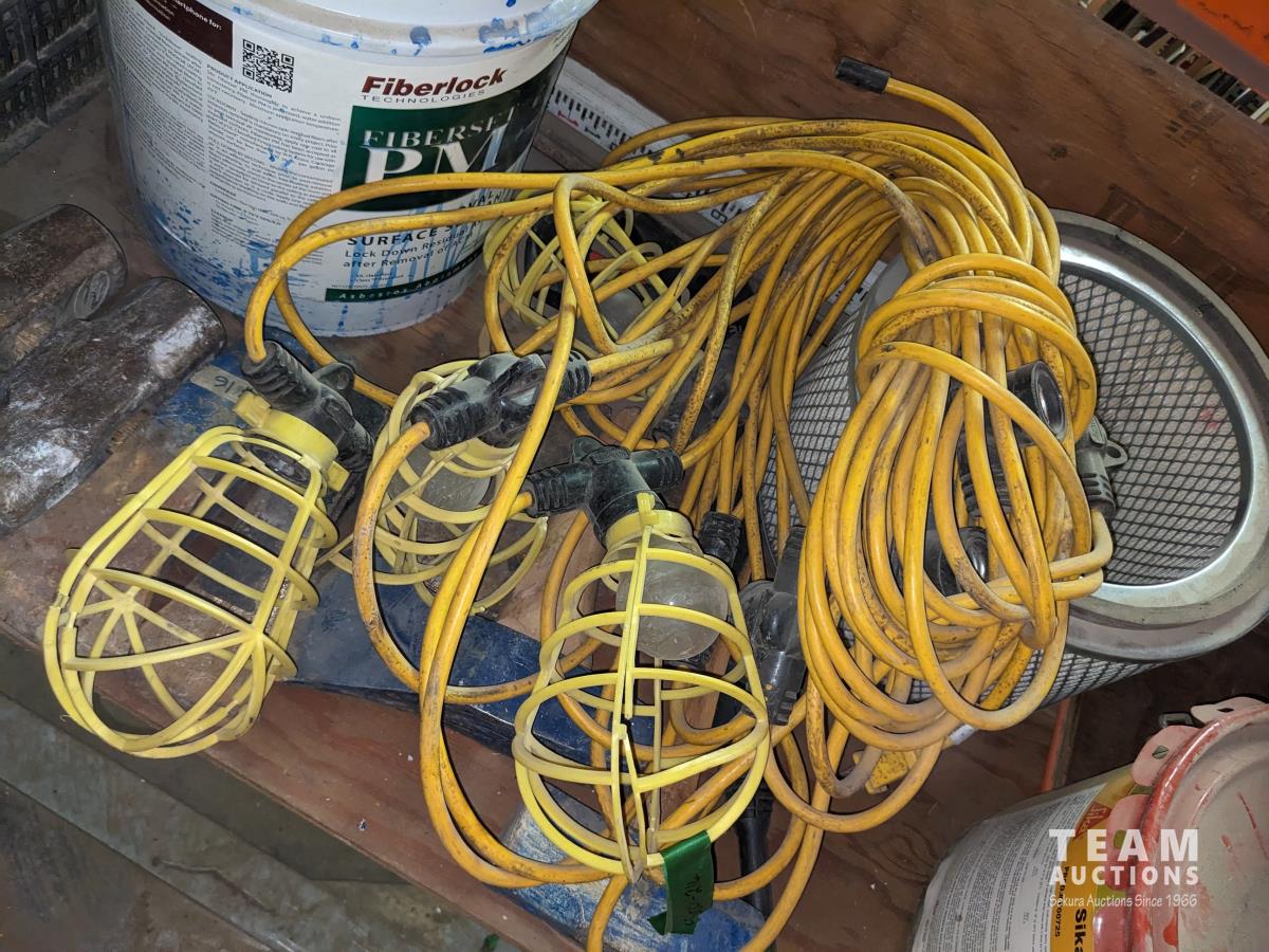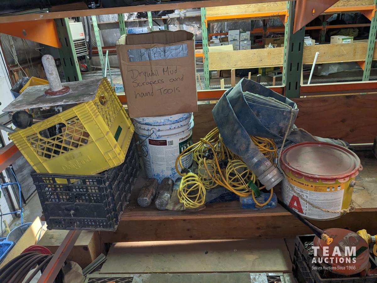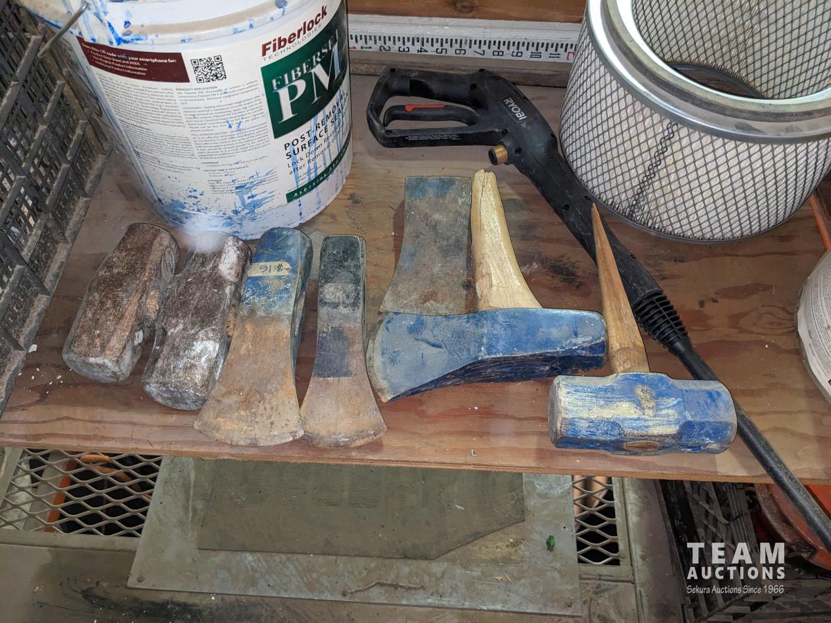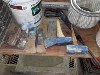 3 inch lay flat hose, work string light, qty of hammer and axe heads, qty of drywall mud tools, air filter, pressure washer wand
