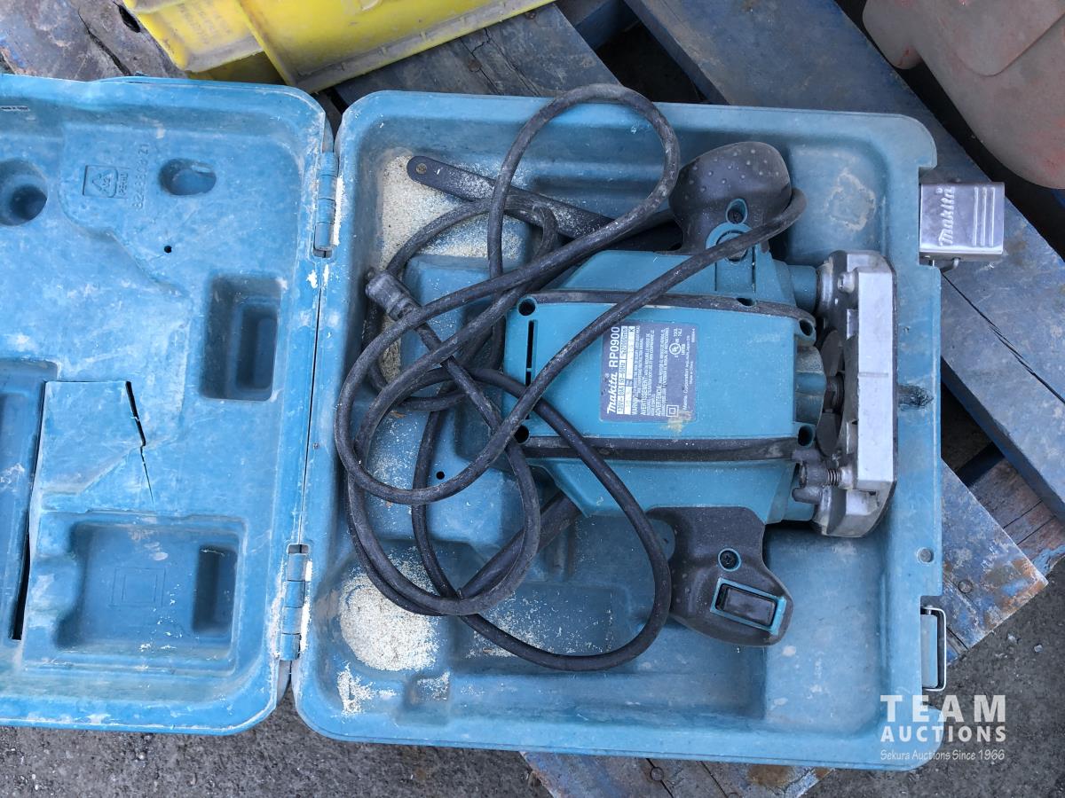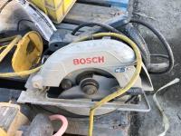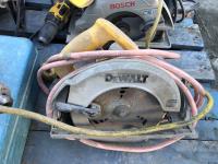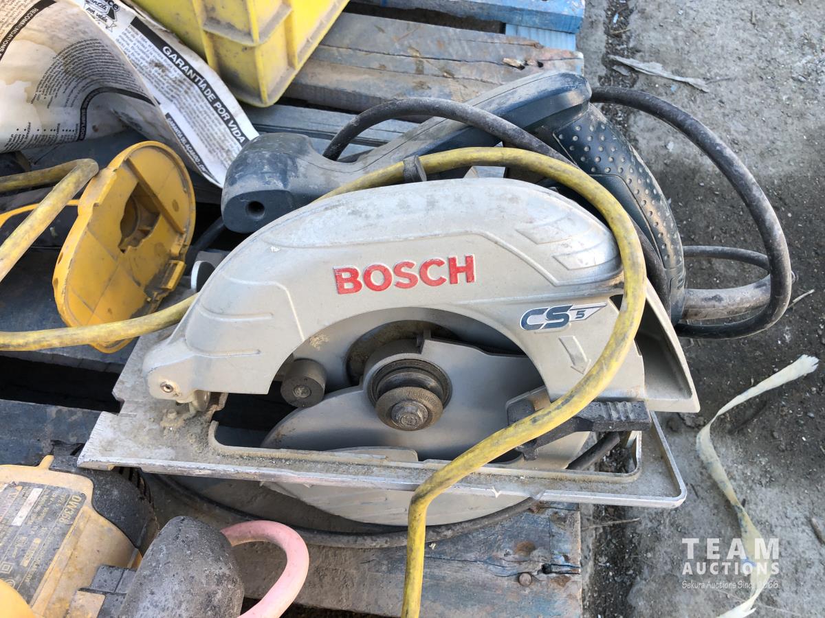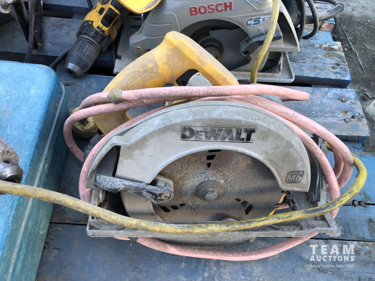 Bosch and DeWalt circular saws, Makita hammer drills and router, various hand tools