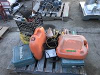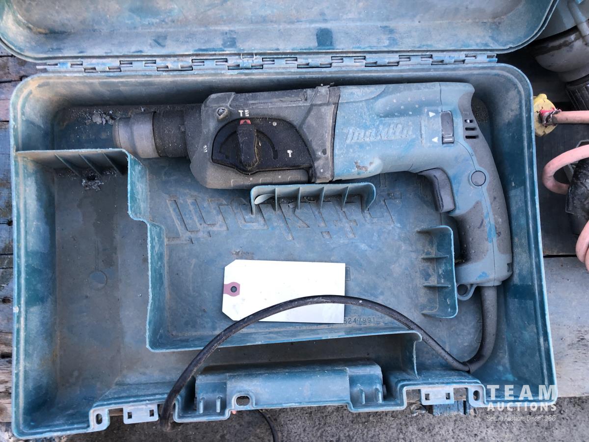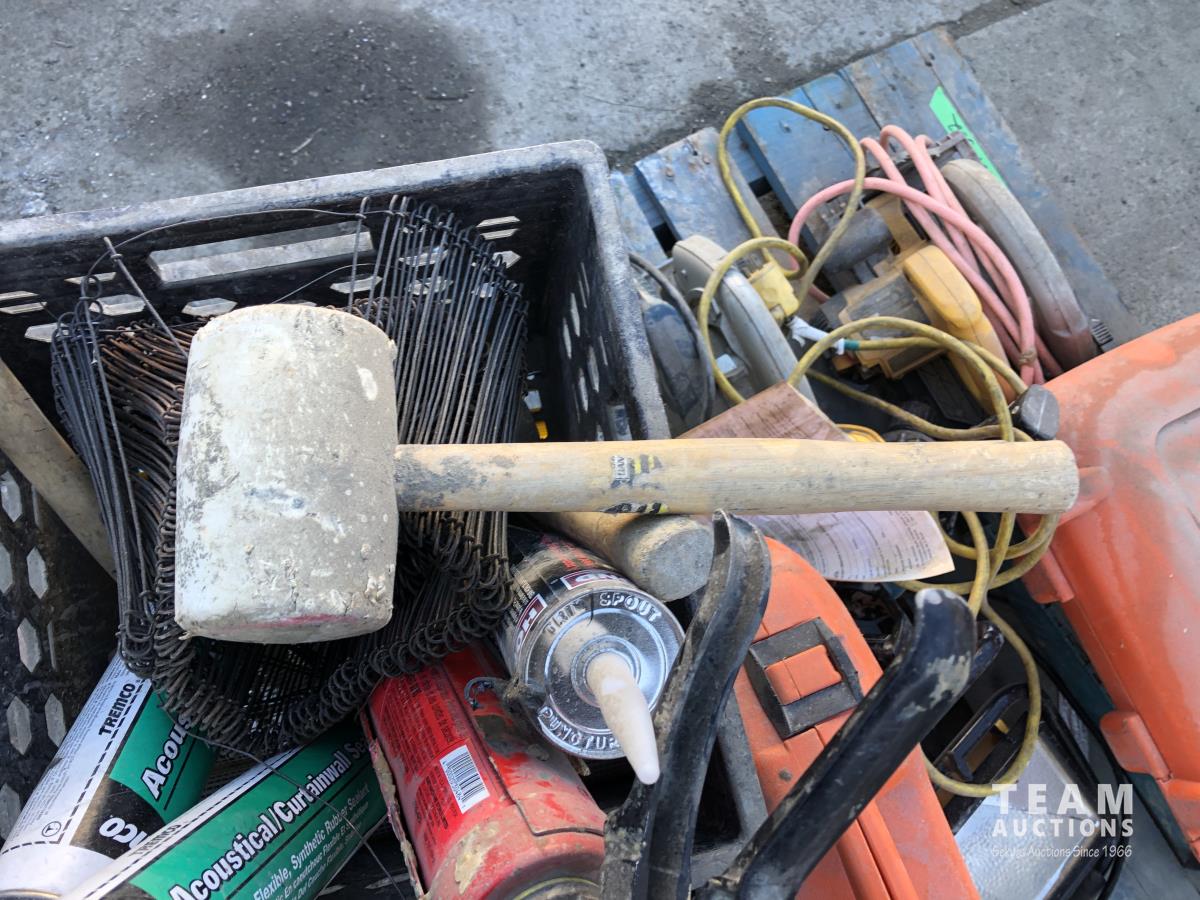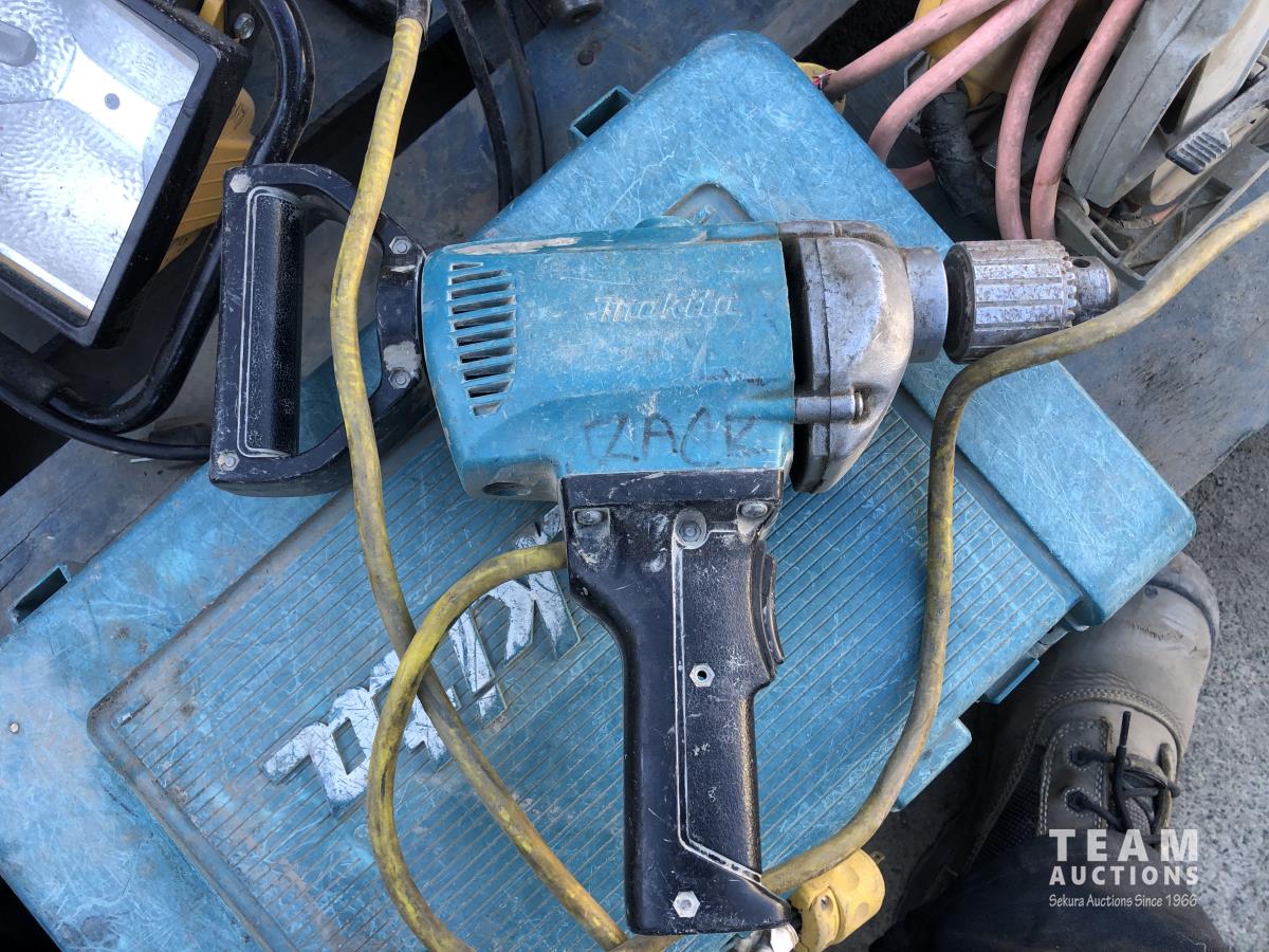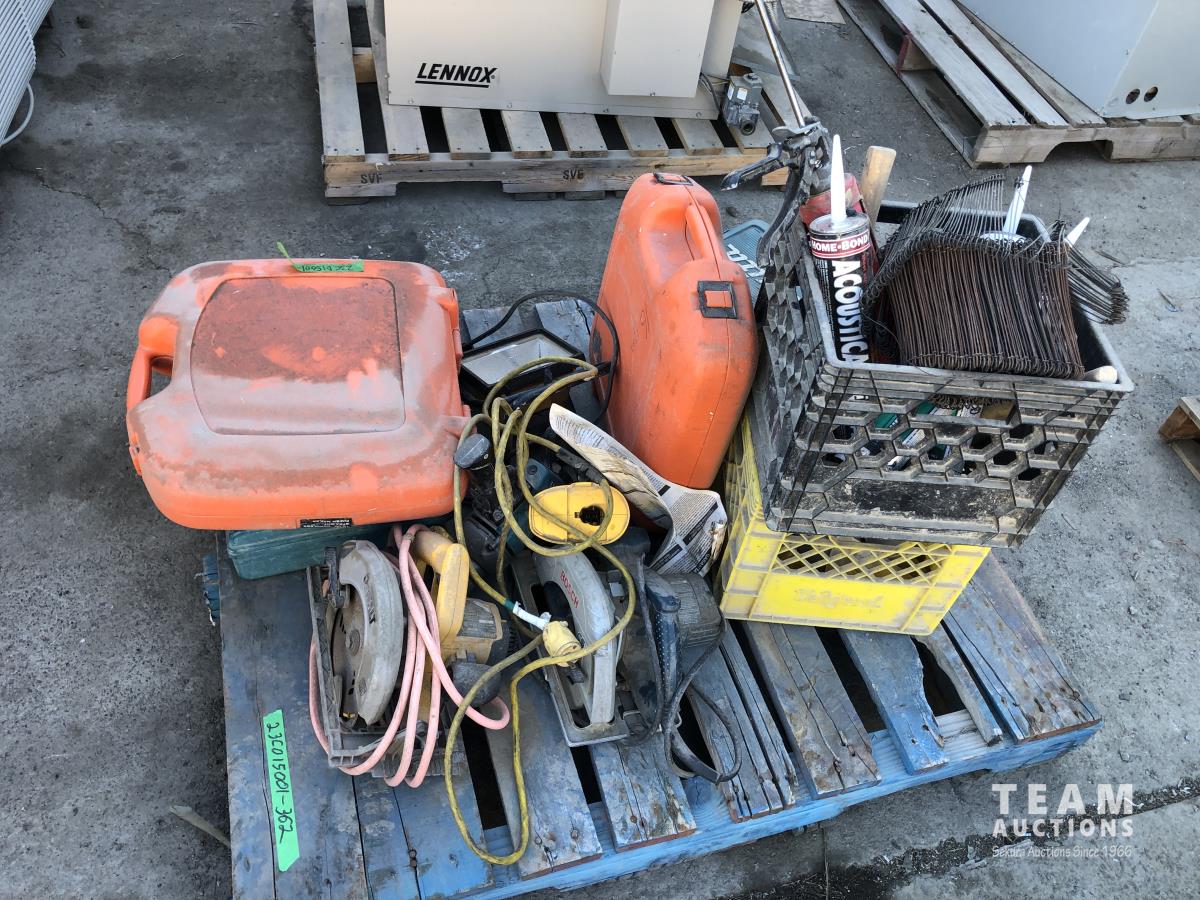 Bosch and DeWalt circular saws, Makita hammer drills and router, various hand tools