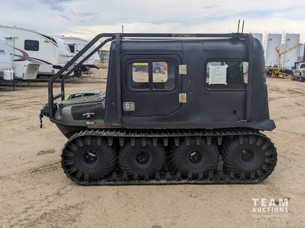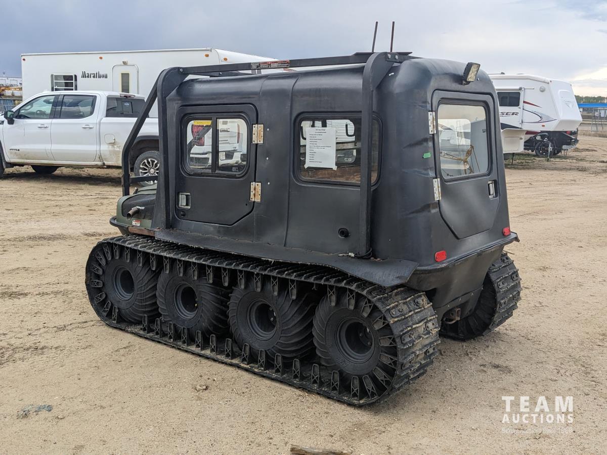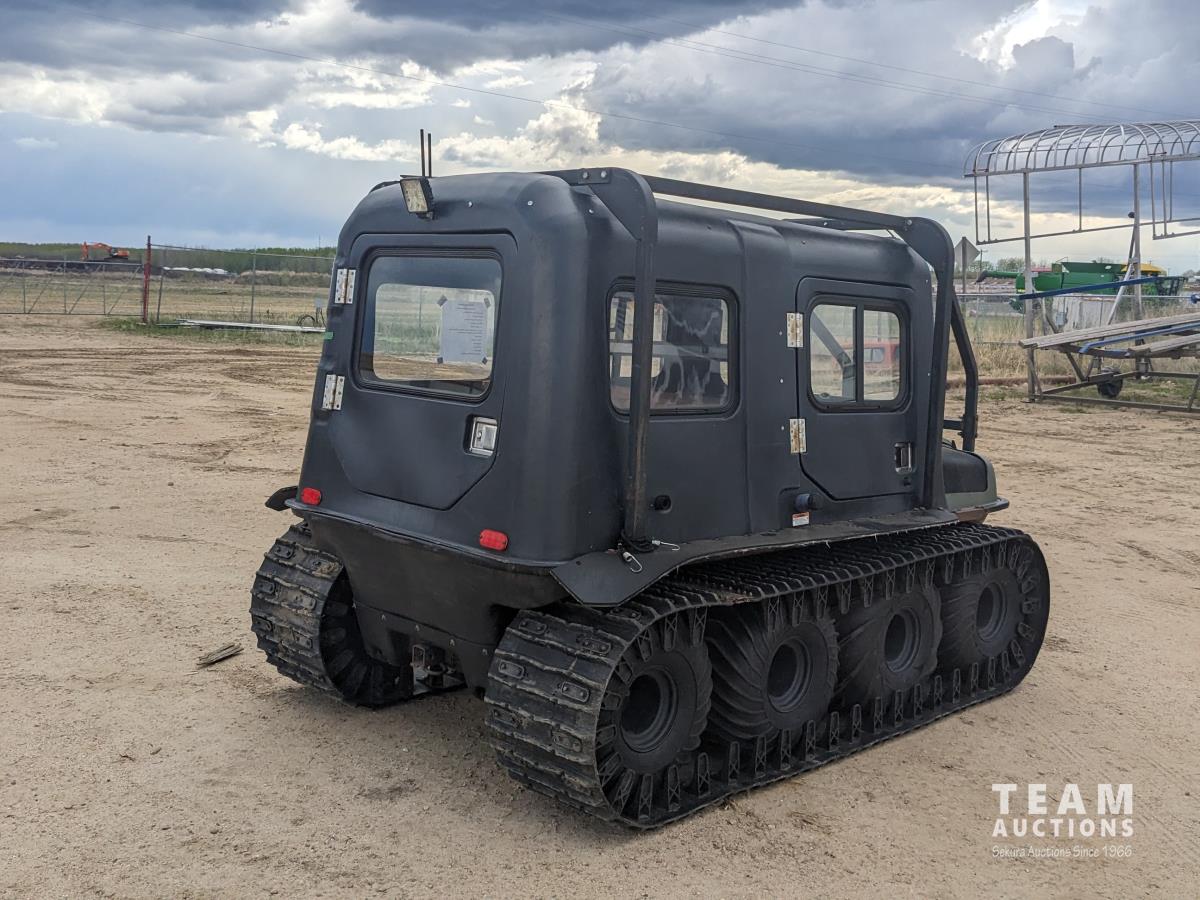 Water cooled V twin gas engine, enclosed cab, cab heater, roll over protection, 4700 lb winch, 18 inch rubber tracks, 25X12.00-9