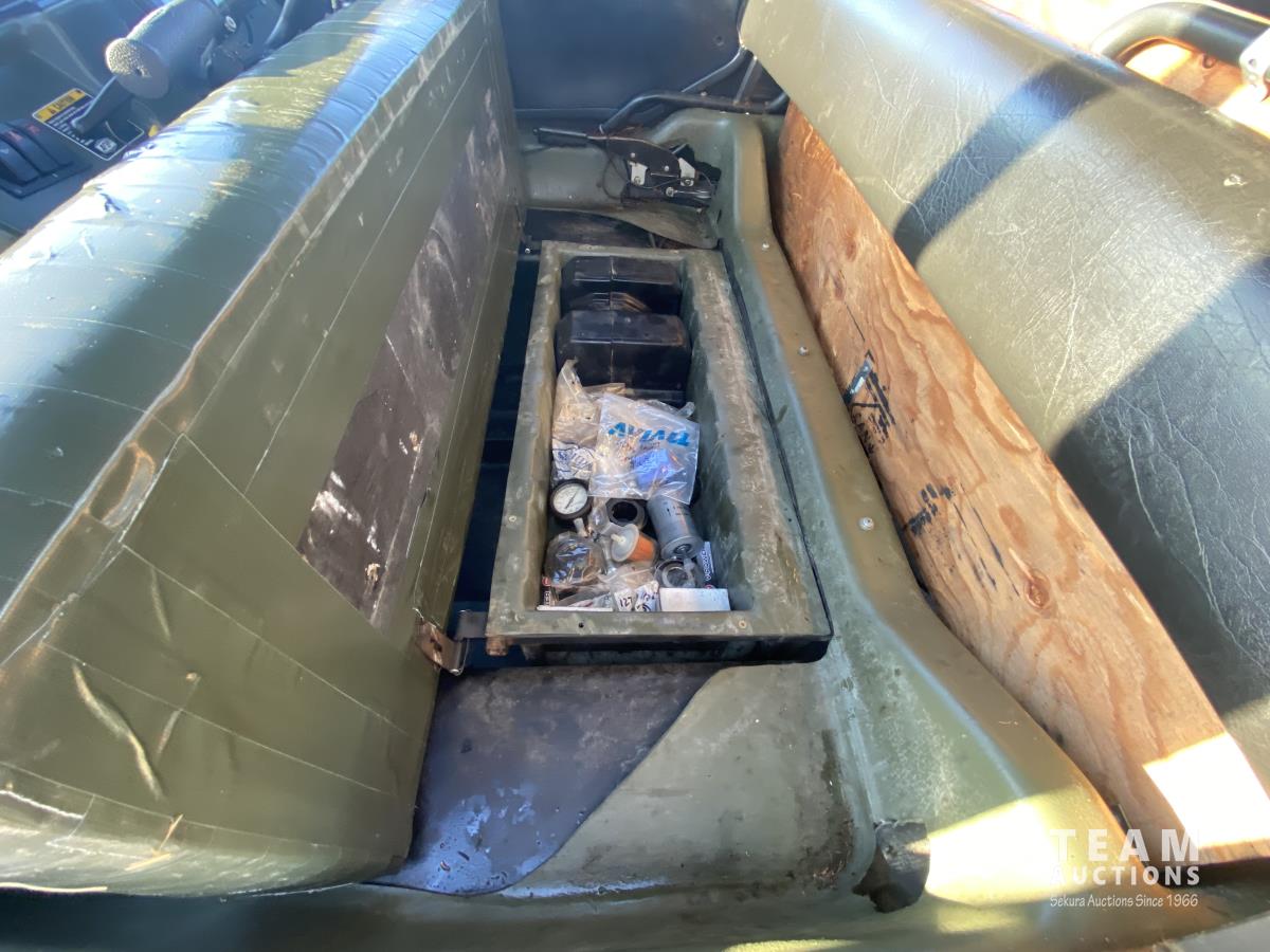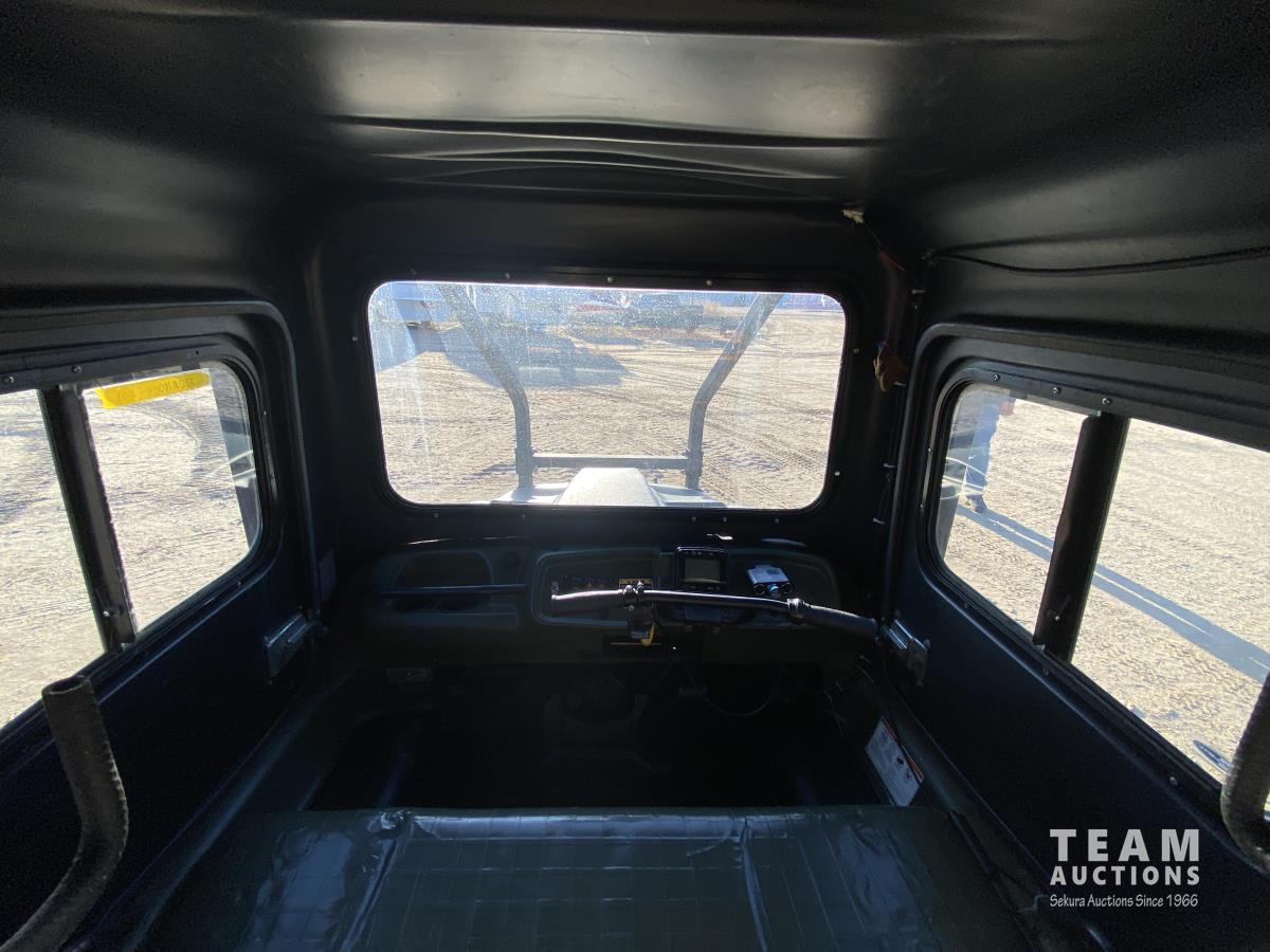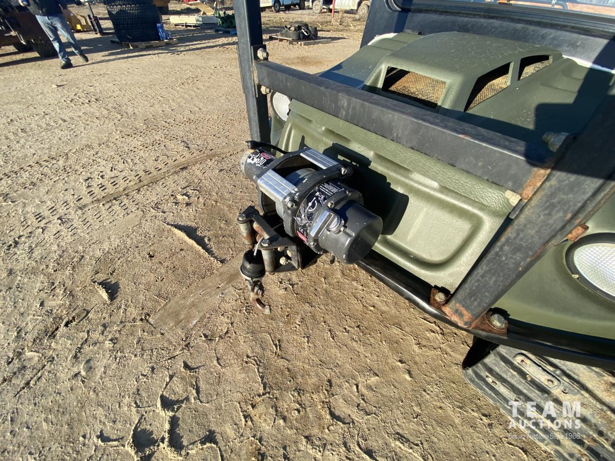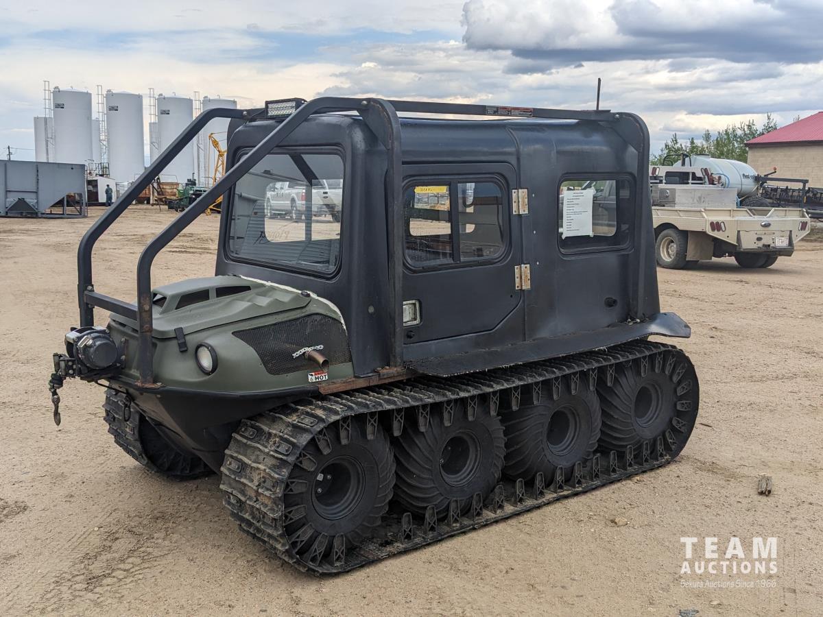 Water cooled V twin gas engine, enclosed cab, cab heater, roll over protection, 4700 lb winch, 18 inch rubber tracks, 25X12.00-9