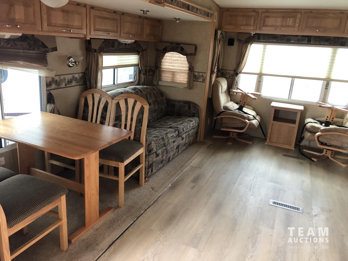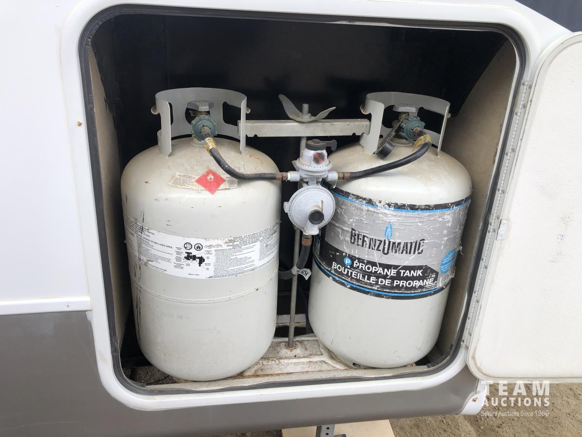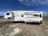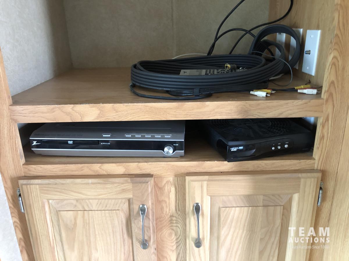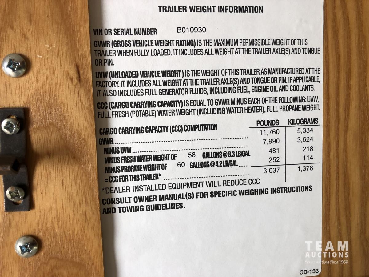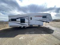 (3) Slides 11 ft 9.5 ft and 5.5 ft, fridge, stove, microwave, bathroom, sleeps 4, stereo, A/C, 13 ft awning, power landing gear, roof access ladder, 225/75R15
