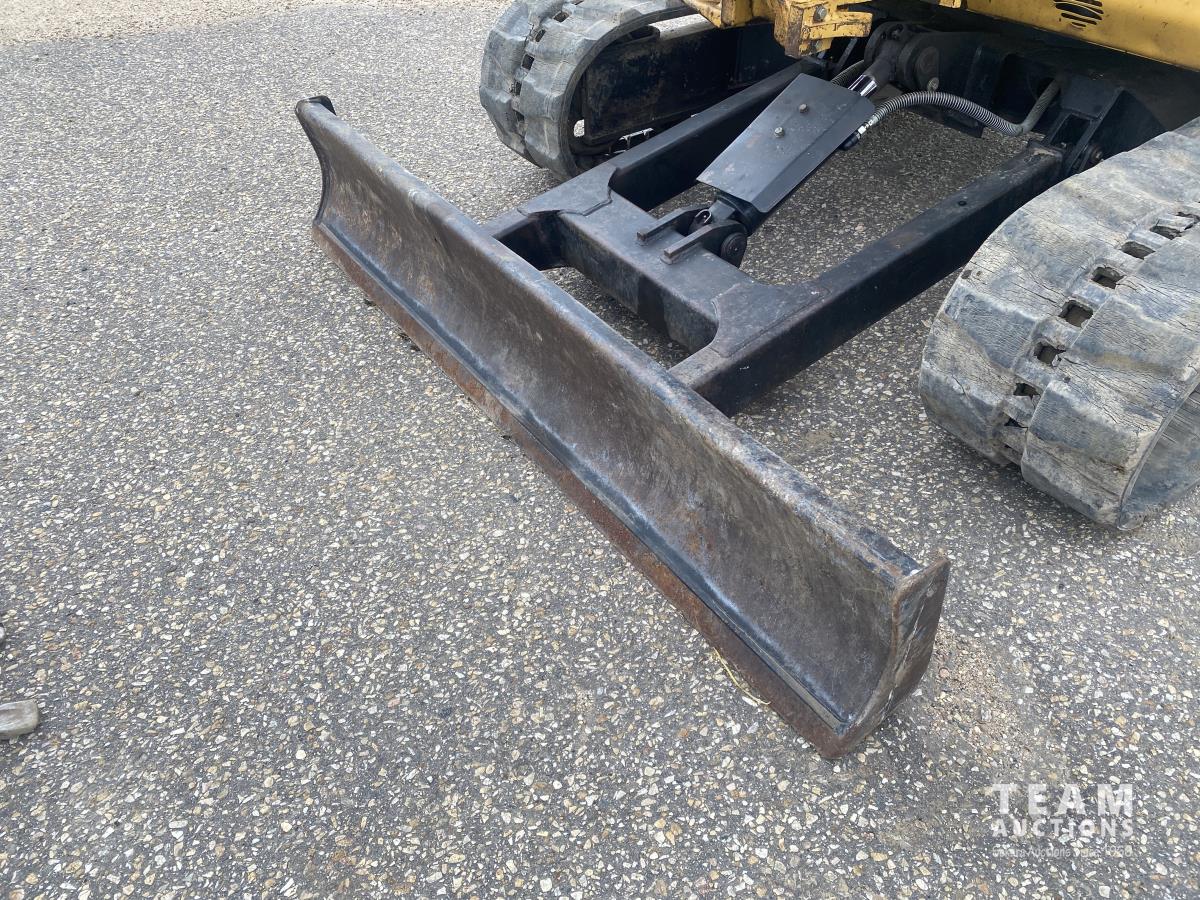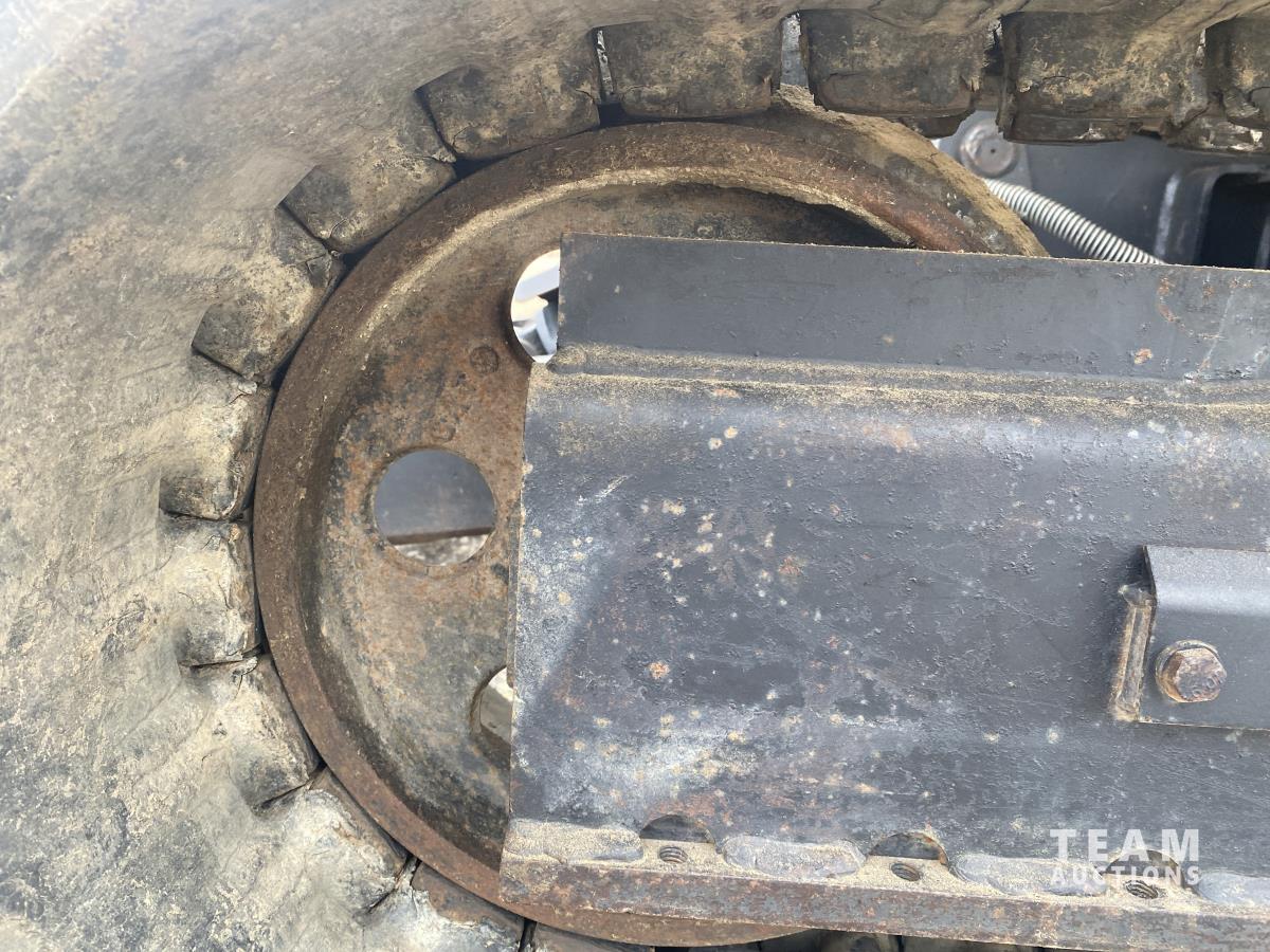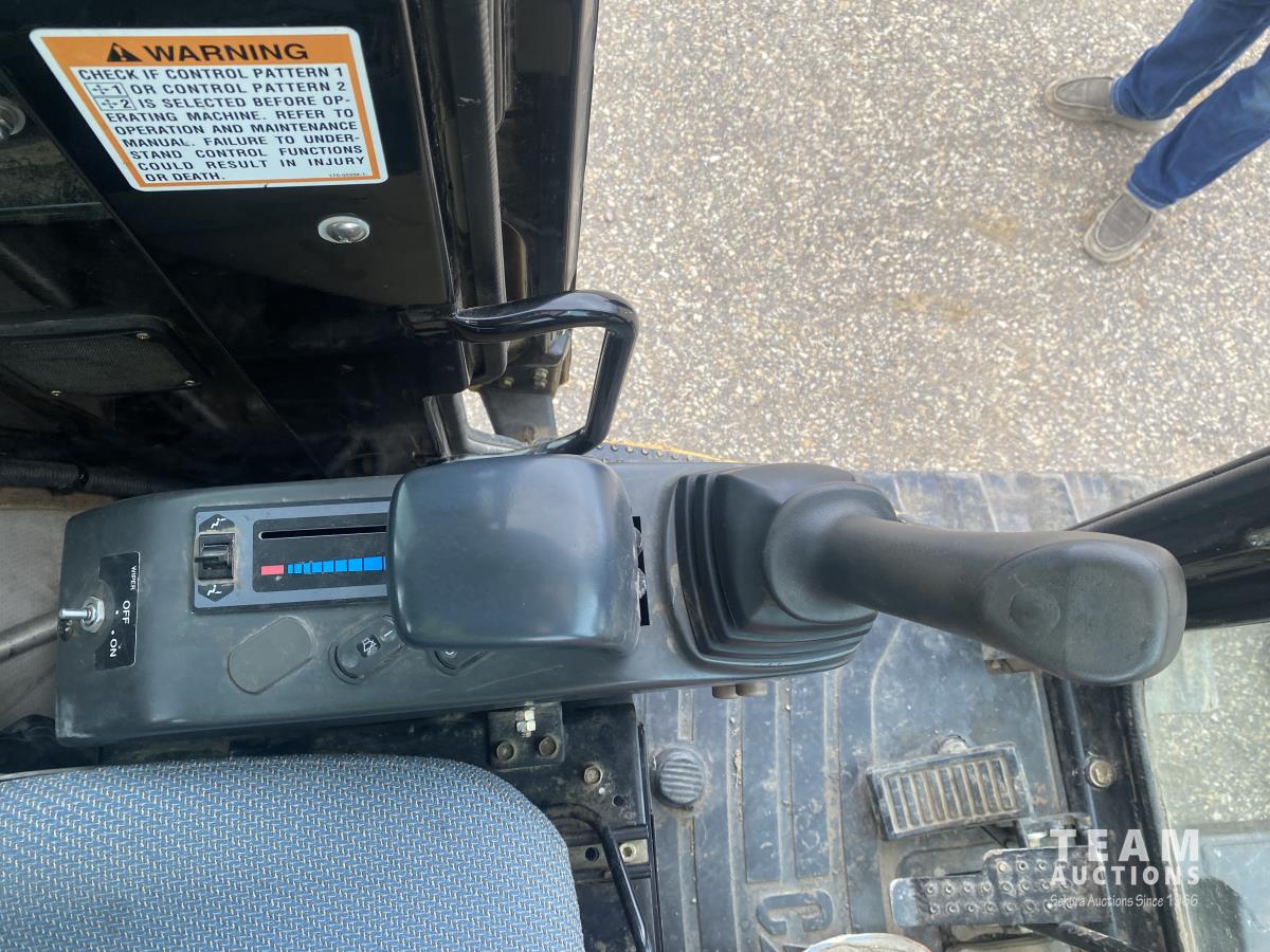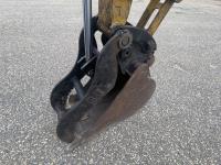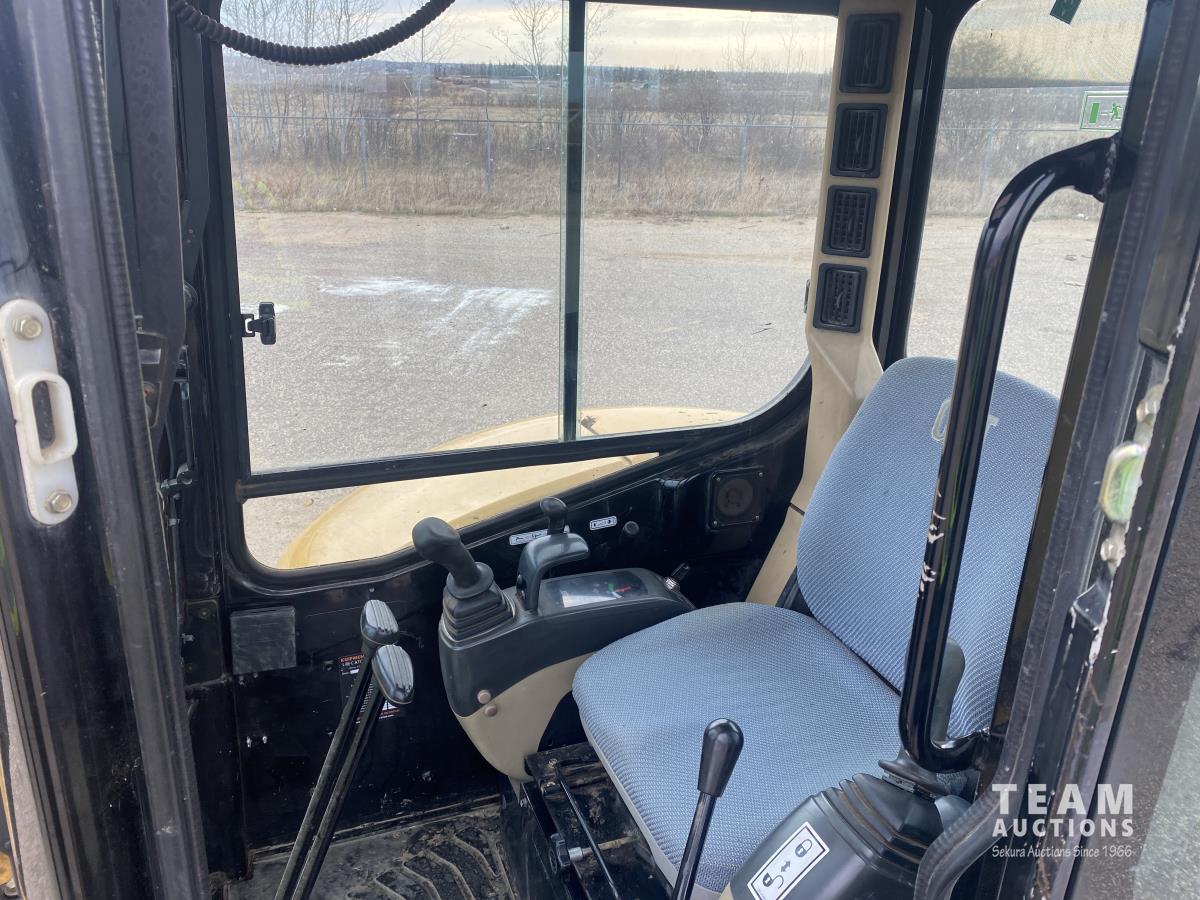18 inch digging bucket, hydraulic thumb, manual Q/A, enclosed cab, A/C, control pattern changer, swing boom, 5 ft 9 inch stick, auxiliary hydraulic plumbing, dozer blade, 16 inch rubber tracks