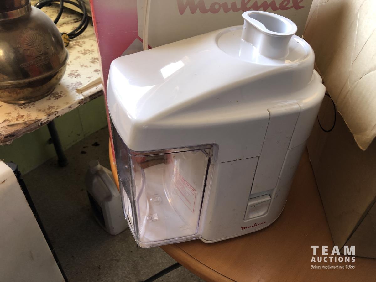 Patch cords, Christmas decorations, table, sleeping bag, juicer, barometer, (4) stacking chairs, miscellaneous household items