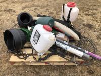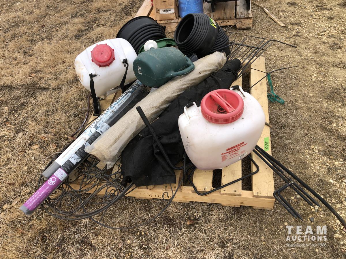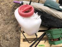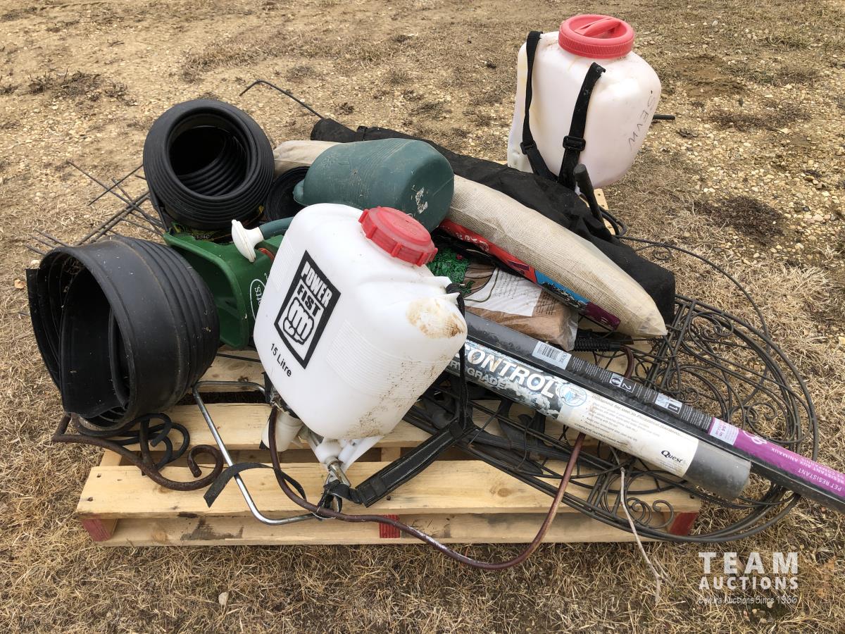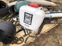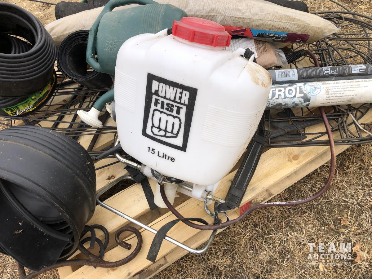 Vine frames, edging, hand seeder, (2) back pack 15L sprayers, window screen, burlap roll, ground matting