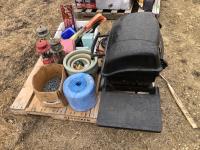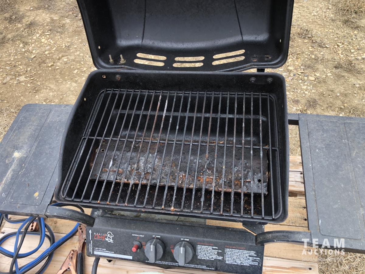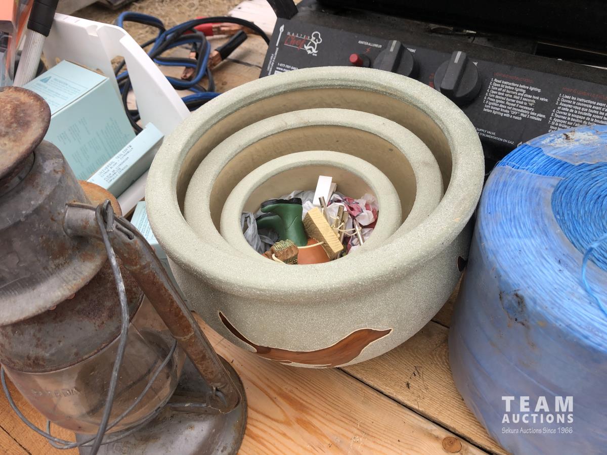 Gas BBQ, flower pot, roll baler twine, part box of screws, assorted party lights, booster cables, miscellaneous