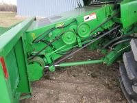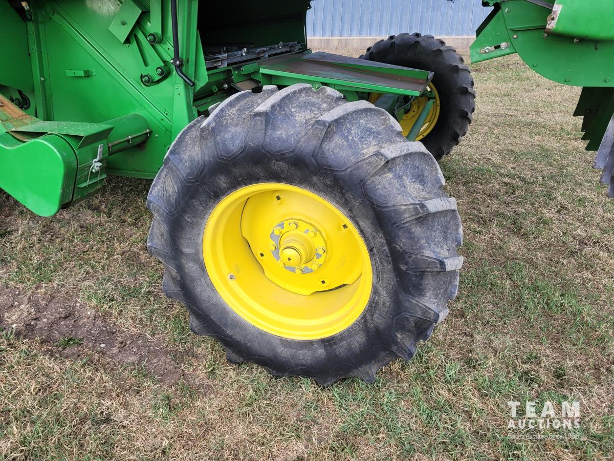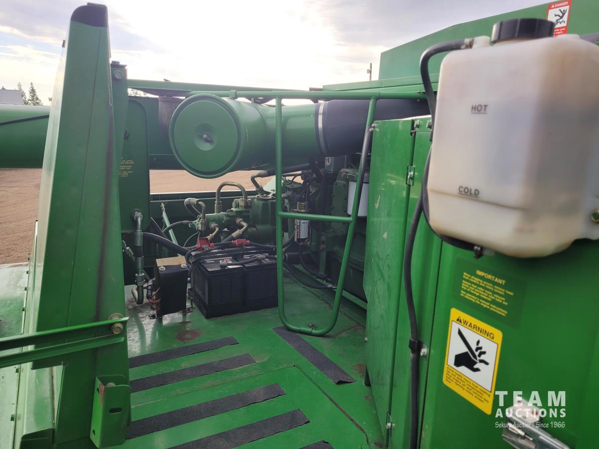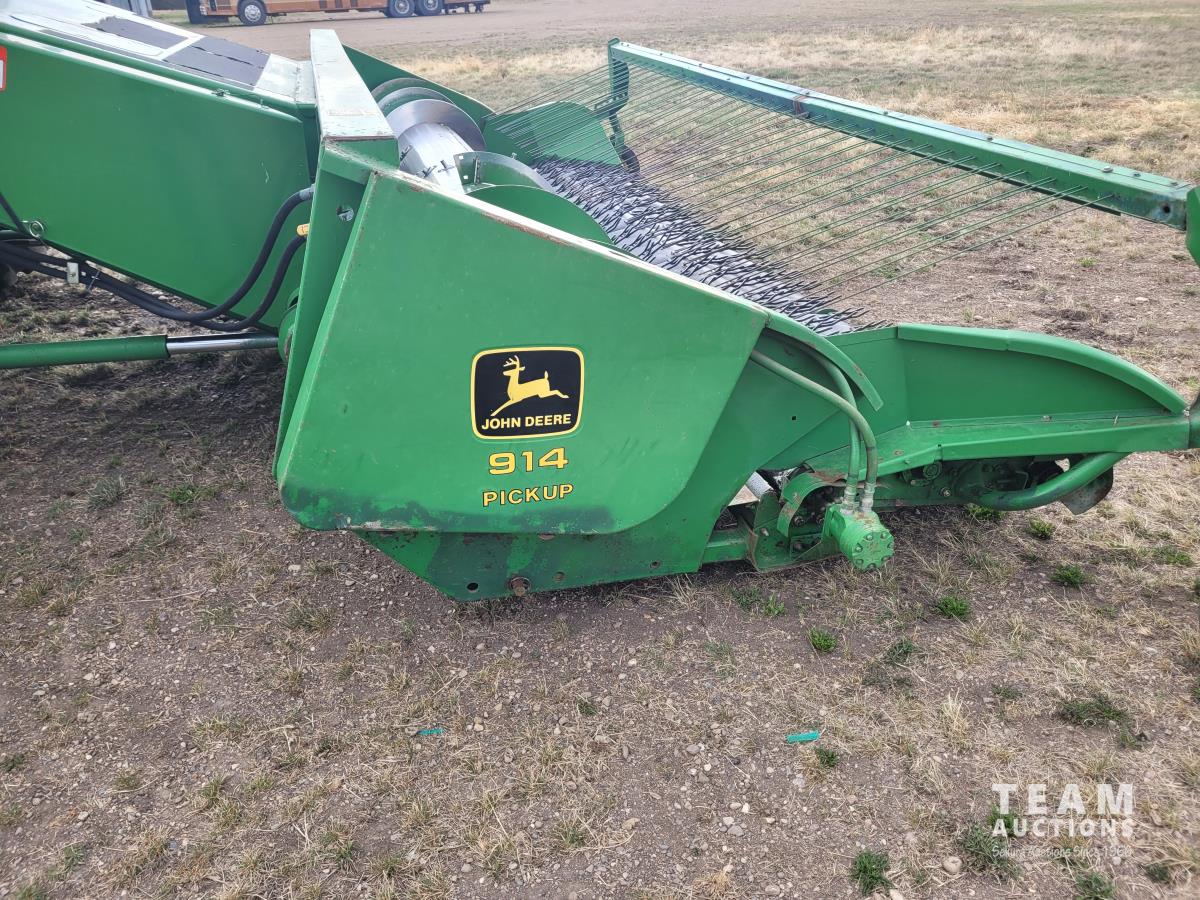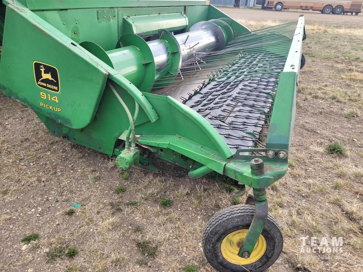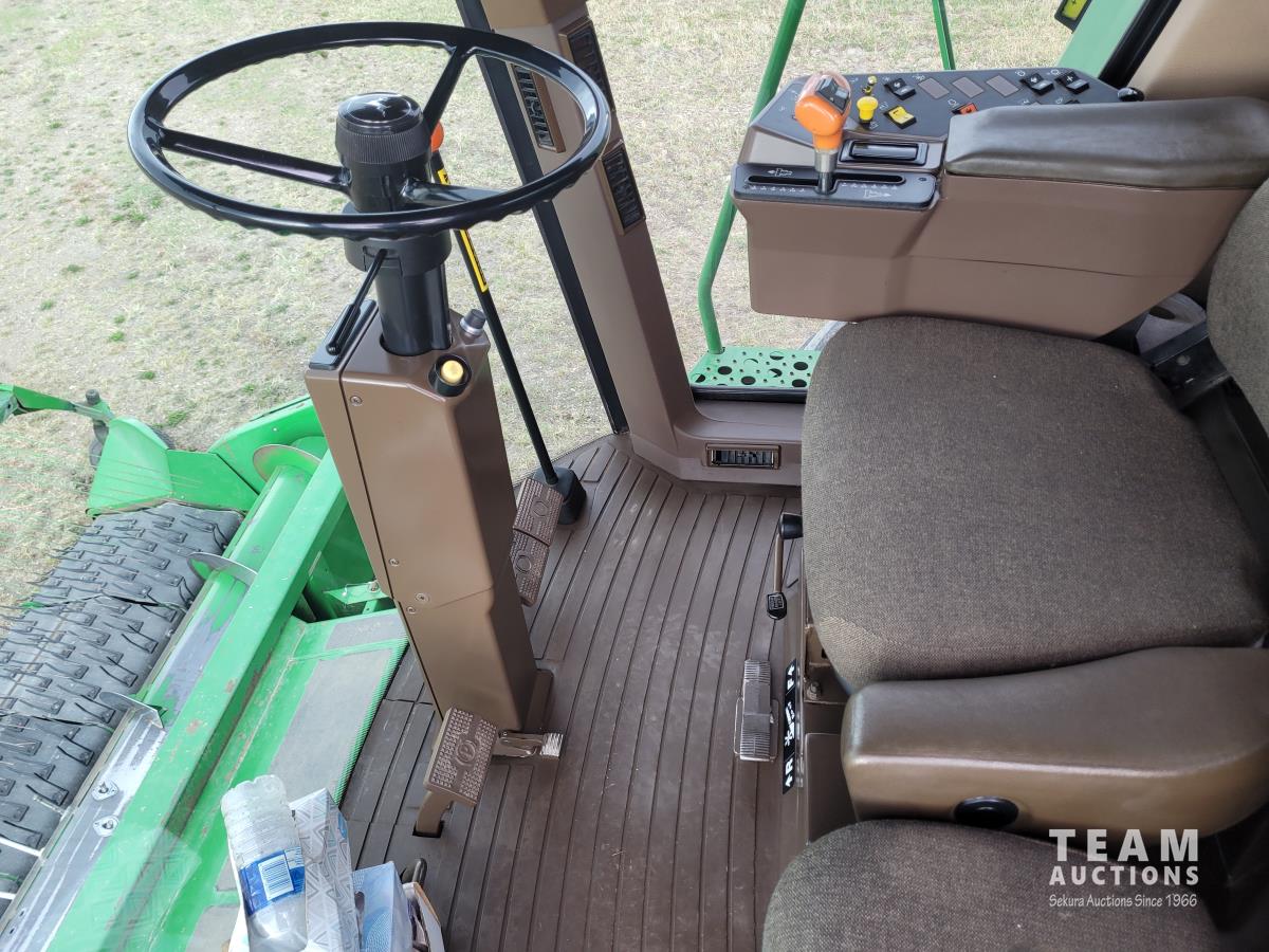 John Deere 914 13 ft pick-up header, variable speed reel, reverser, rock trap, chaff spreader, chopper/straw spreader, A/C, radio, buddy seat, 30.5L-32 front tires, 14.9-24 rear tires