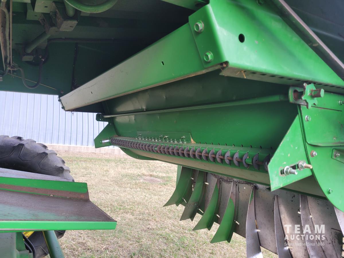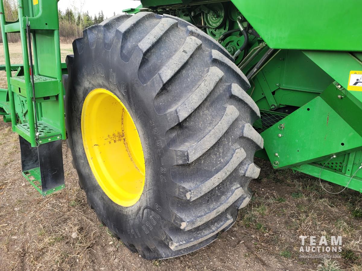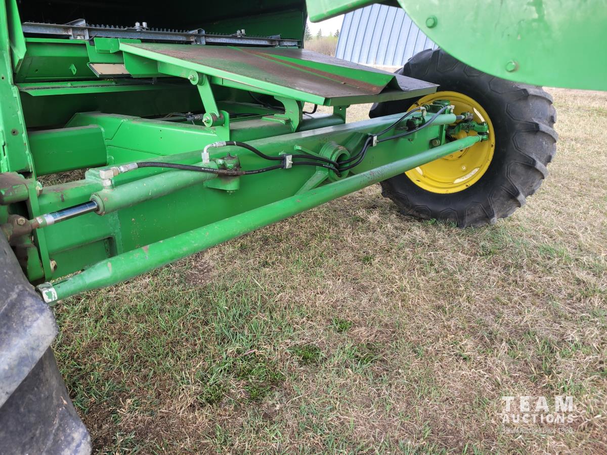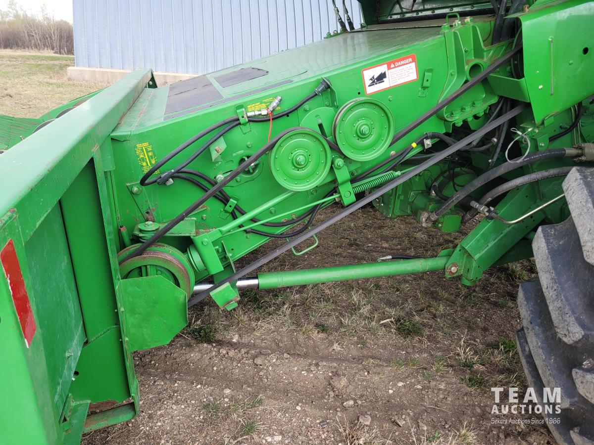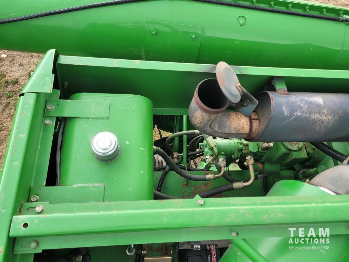 John Deere 914 13 ft pick-up header, variable speed reel, reverser, rock trap, chaff spreader, chopper/straw spreader, A/C, radio, buddy seat, 30.5L-32 front tires, 14.9-24 rear tires