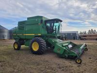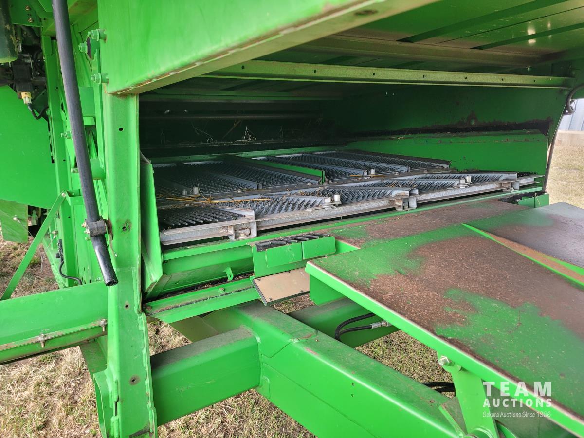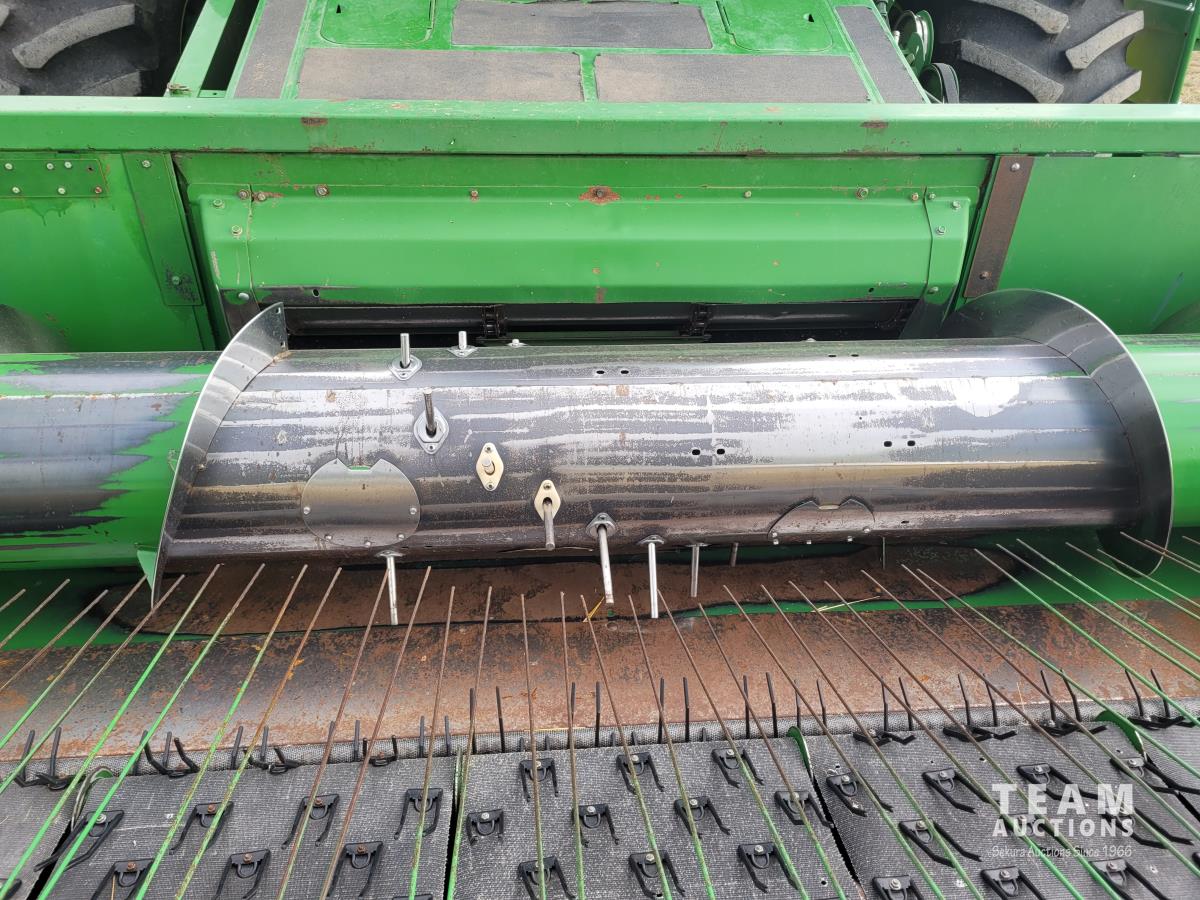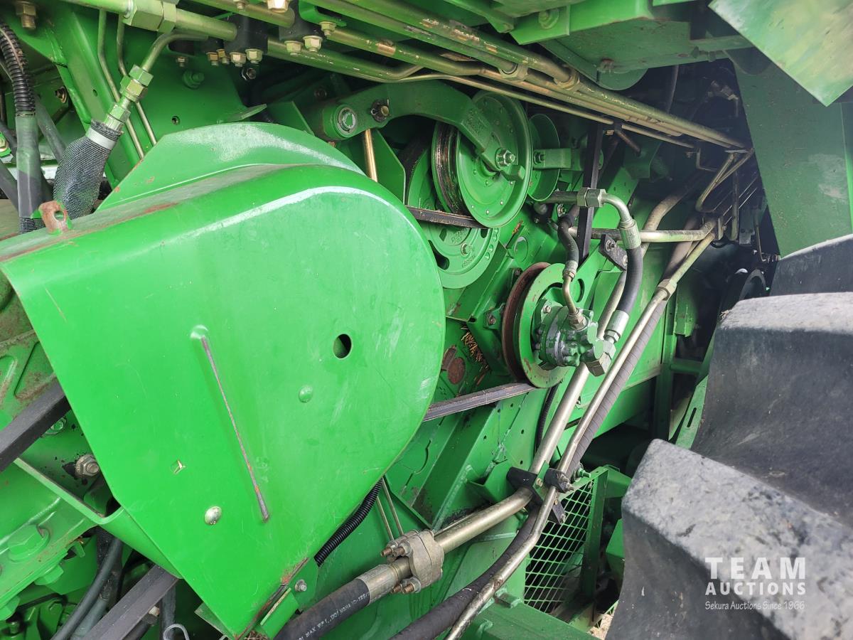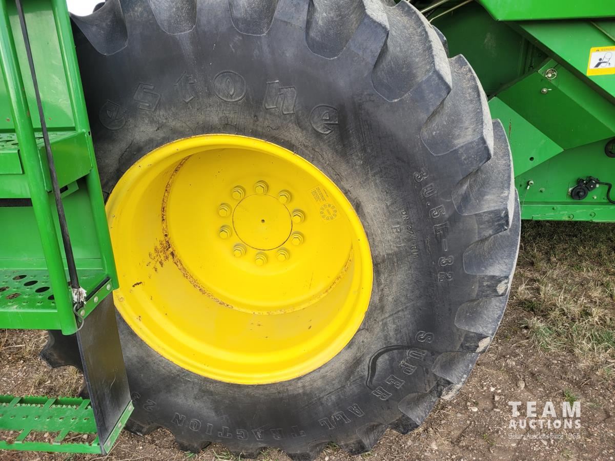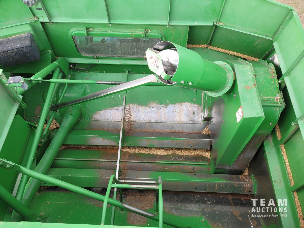 John Deere 914 13 ft pick-up header, variable speed reel, reverser, rock trap, chaff spreader, chopper/straw spreader, A/C, radio, buddy seat, 30.5L-32 front tires, 14.9-24 rear tires
