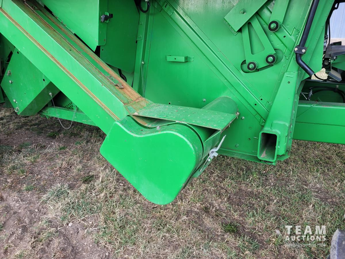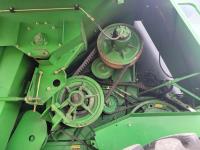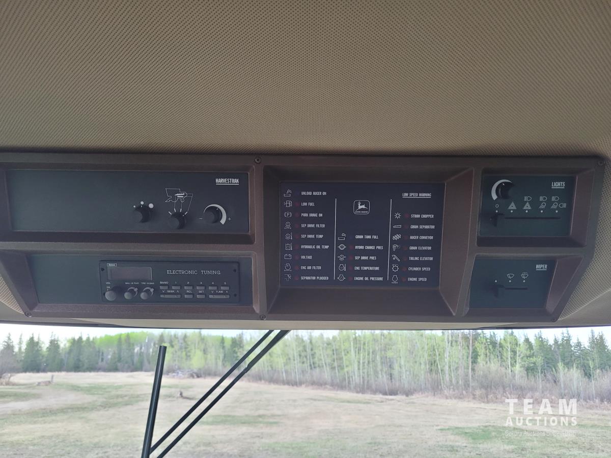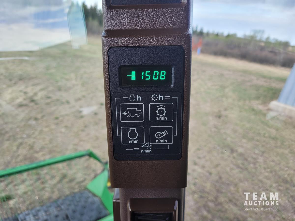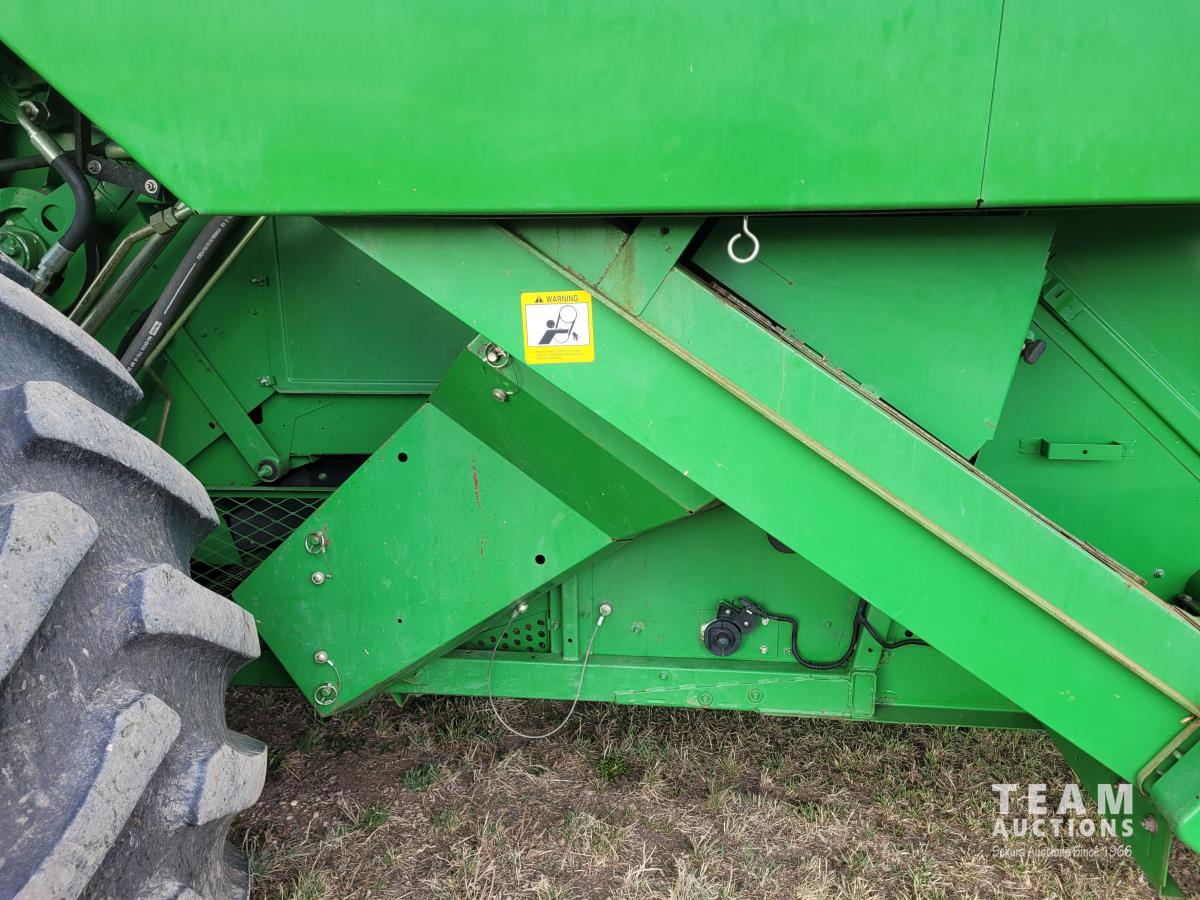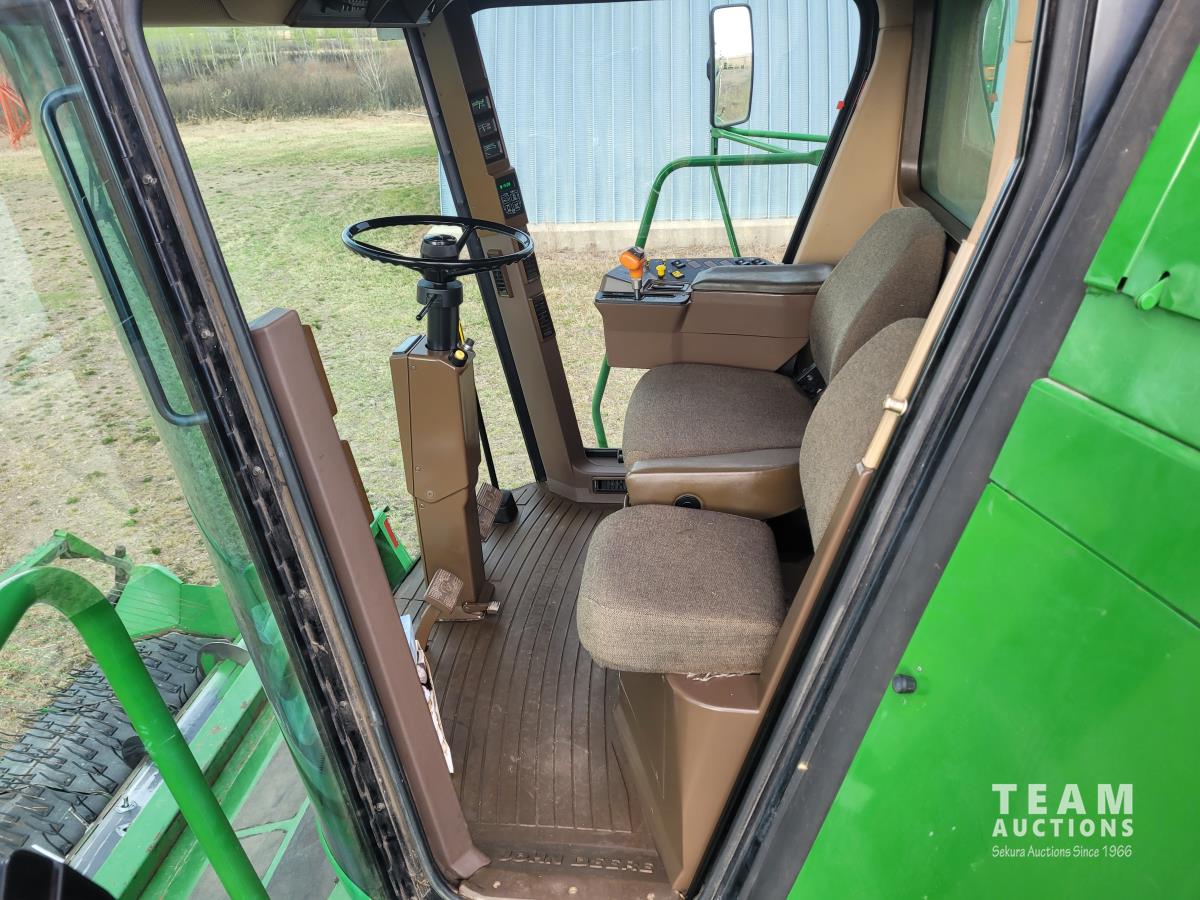 John Deere 914 13 ft pick-up header, variable speed reel, reverser, rock trap, chaff spreader, chopper/straw spreader, A/C, radio, buddy seat, 30.5L-32 front tires, 14.9-24 rear tires