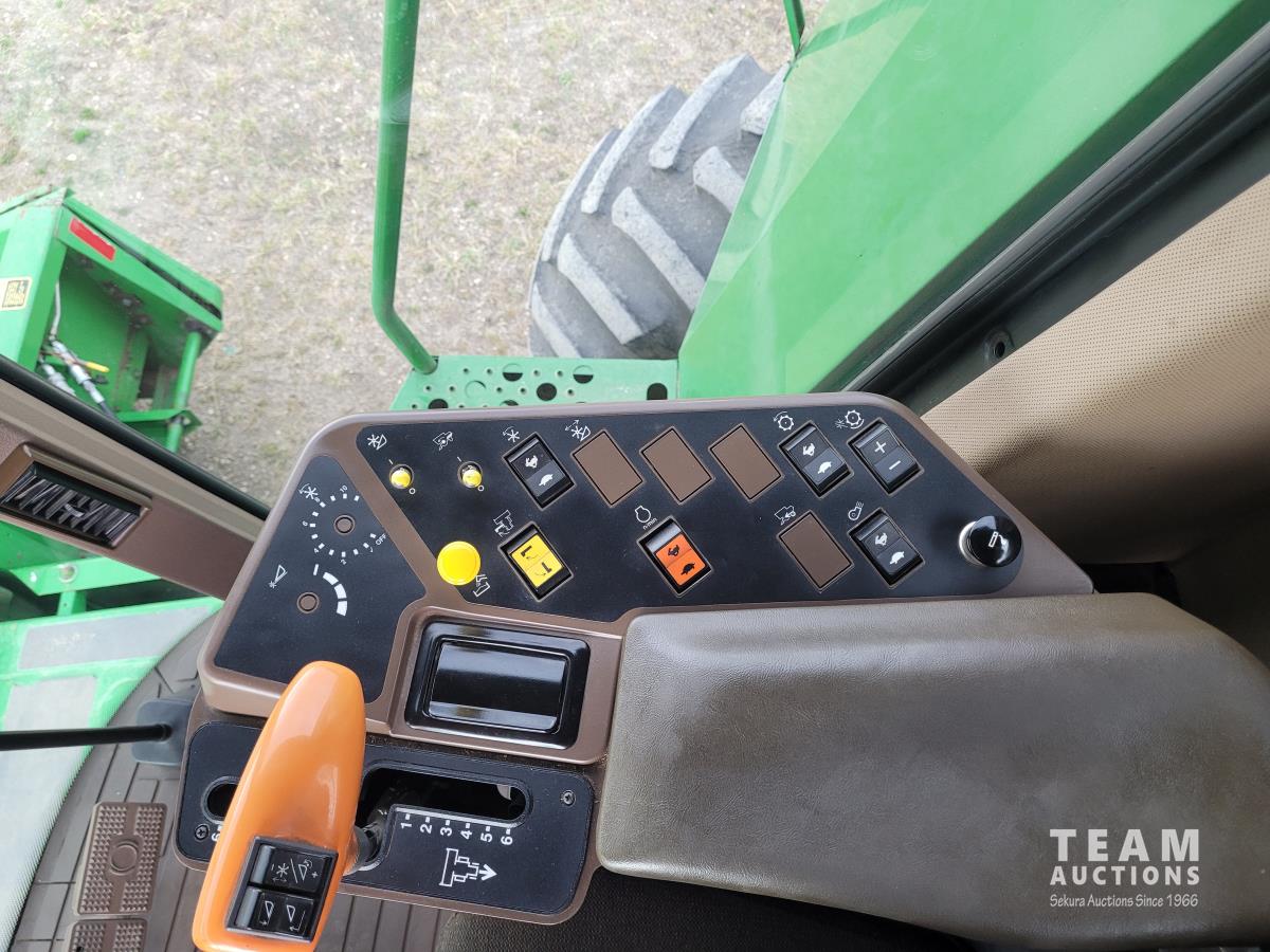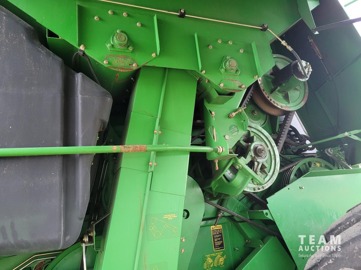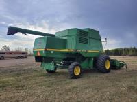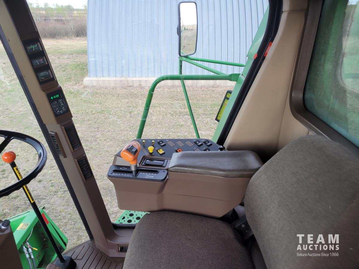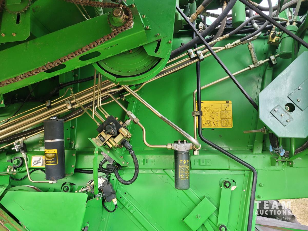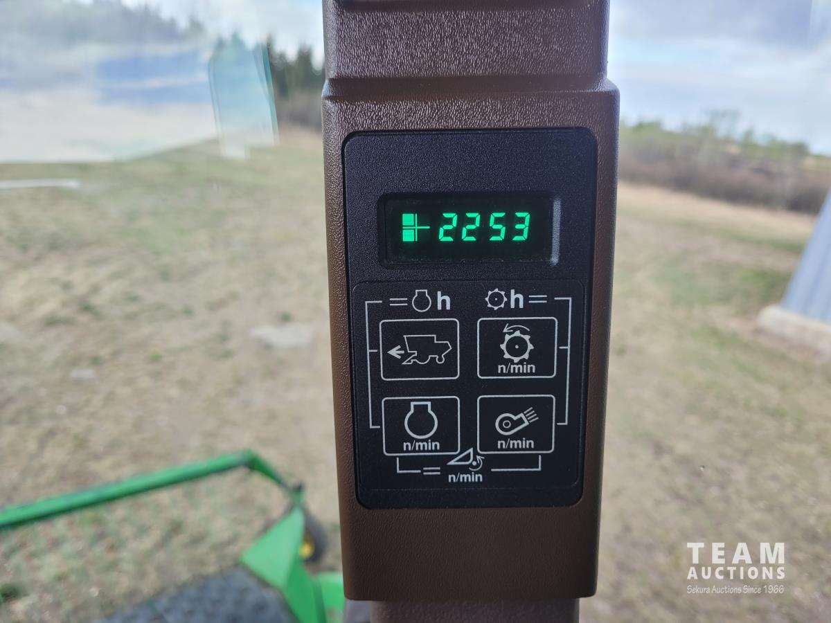 John Deere 914 13 ft pick-up header, variable speed reel, reverser, rock trap, chaff spreader, chopper/straw spreader, A/C, radio, buddy seat, 30.5L-32 front tires, 14.9-24 rear tires