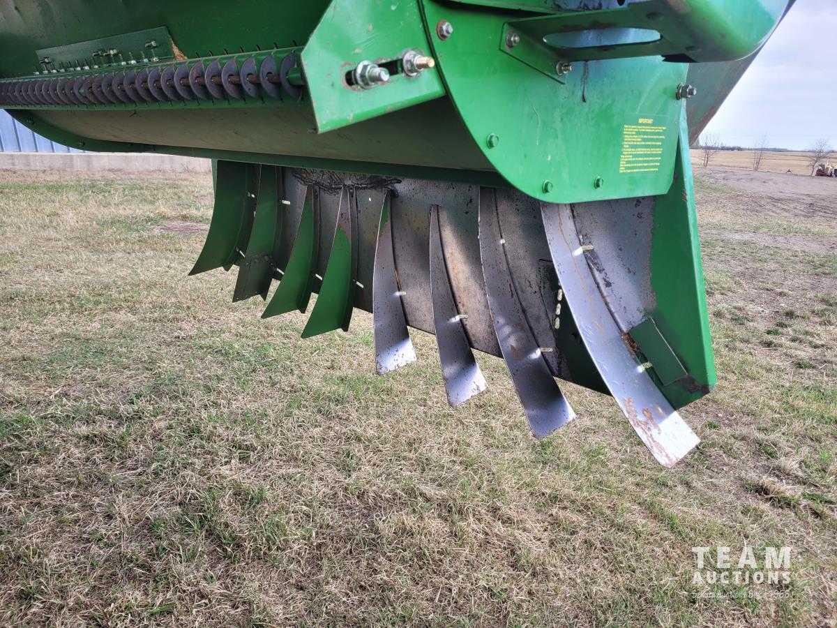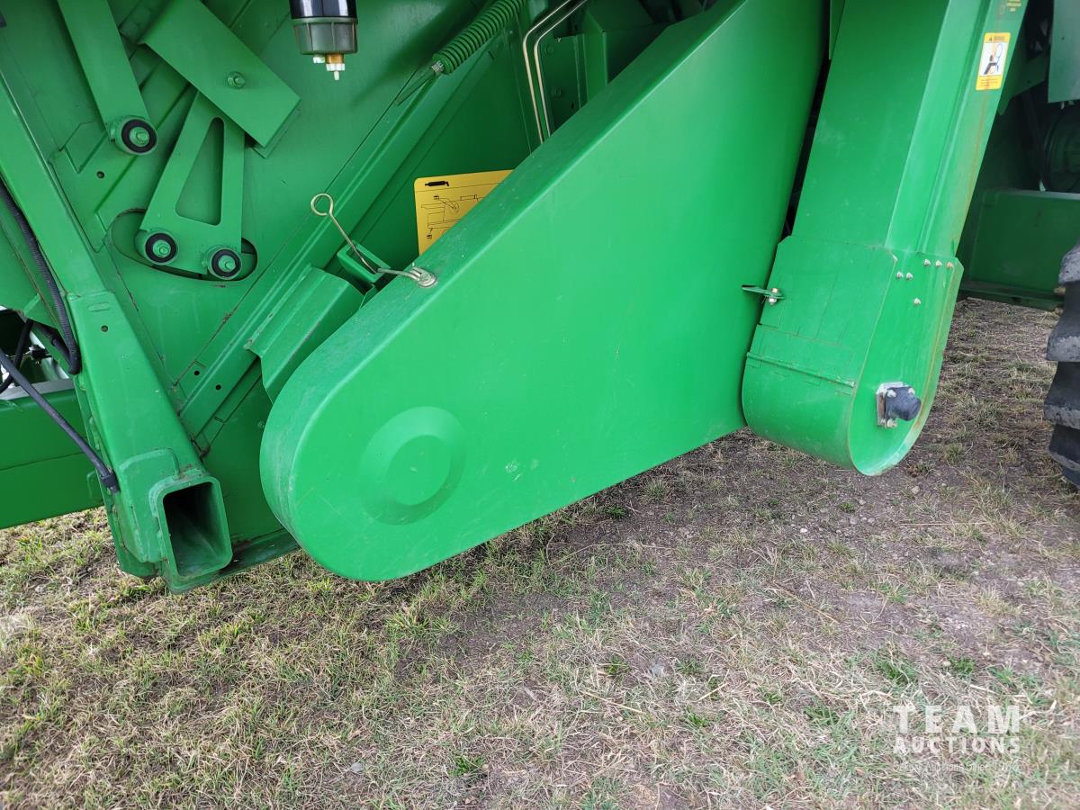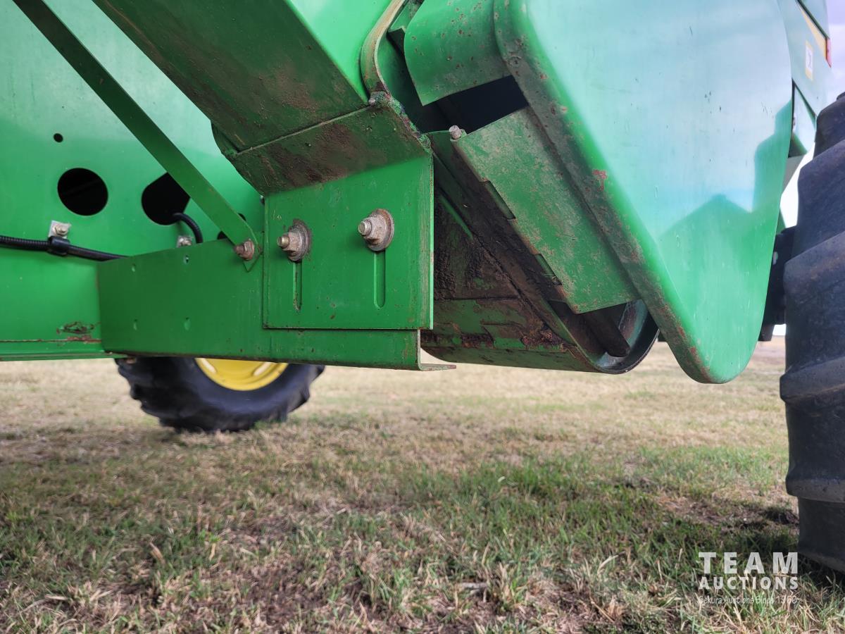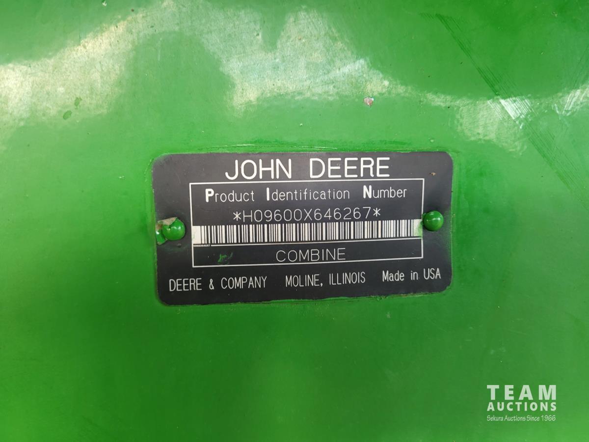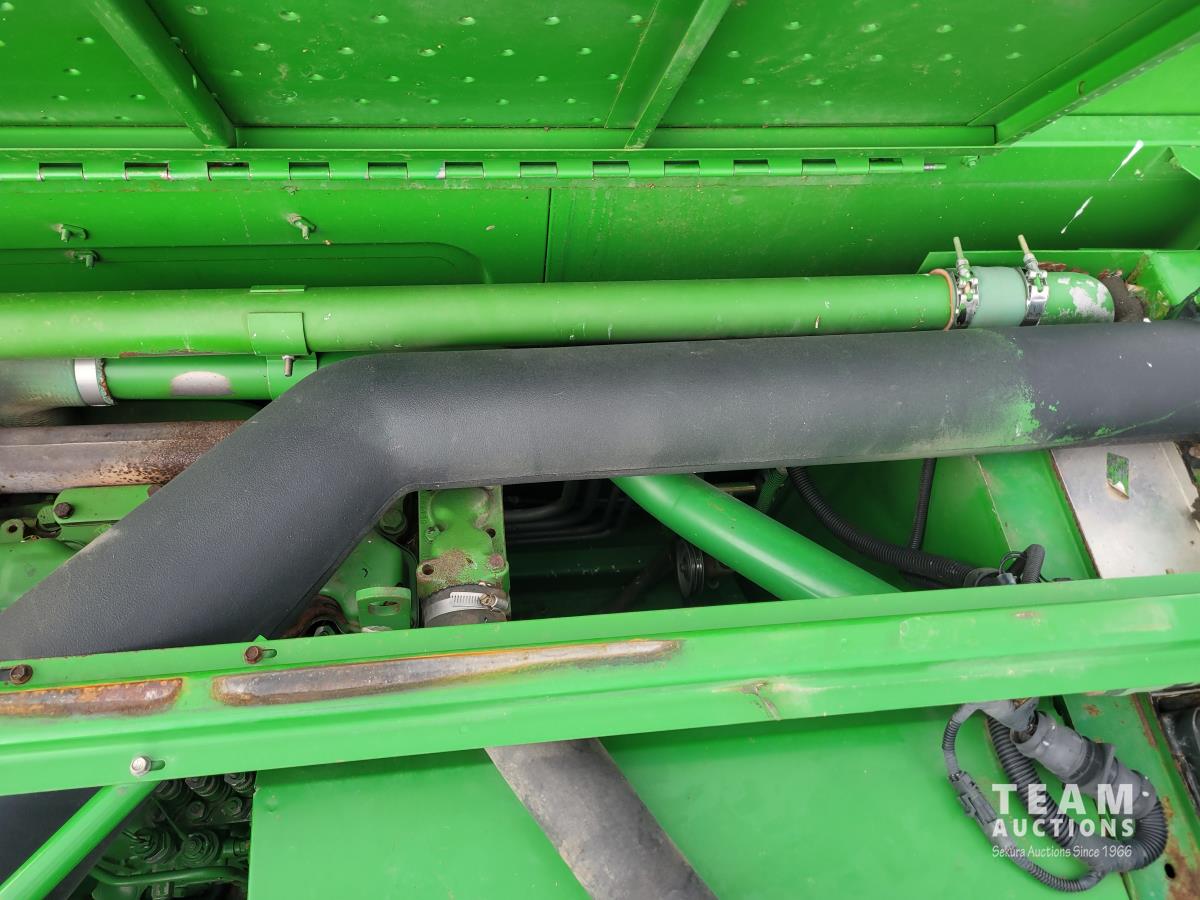 John Deere 914 13 ft pick-up header, variable speed reel, reverser, rock trap, chaff spreader, chopper/straw spreader, A/C, radio, buddy seat, 30.5L-32 front tires, 14.9-24 rear tires