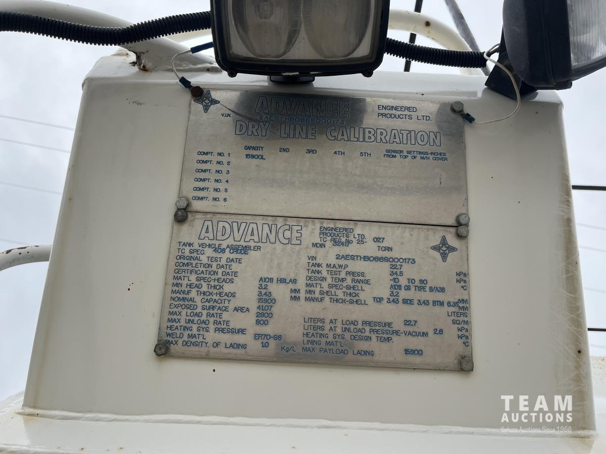 12 L L6 460 HP diesel engine, 18 speed manual transmission, air ride driver seat, radio, air ride suspension, 18,000 lb front axle, 22,000 lb rear axles, diff lock, 250 inch WB, 15,900 liter advance water tank, all aluminum wheels, 285/65R22.5 front tires, 11R24.5 rear tires