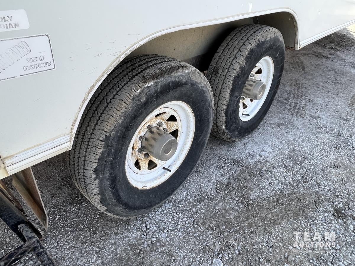 96 inch interior width, ball hitch, side door, electric brakes, torsion suspension, Furnace, A/C, fridge, microwave (2) counters w/ drawers, ST235/80R16 tires