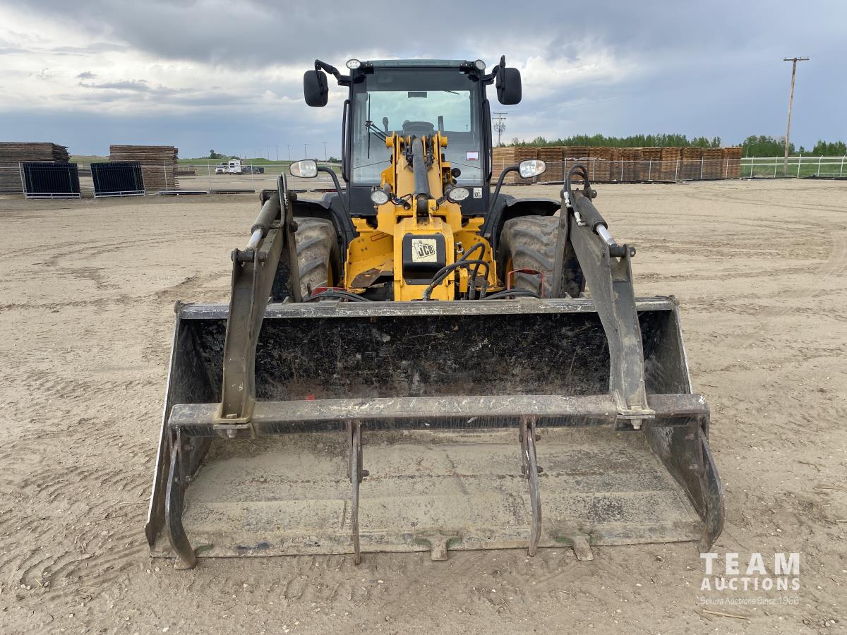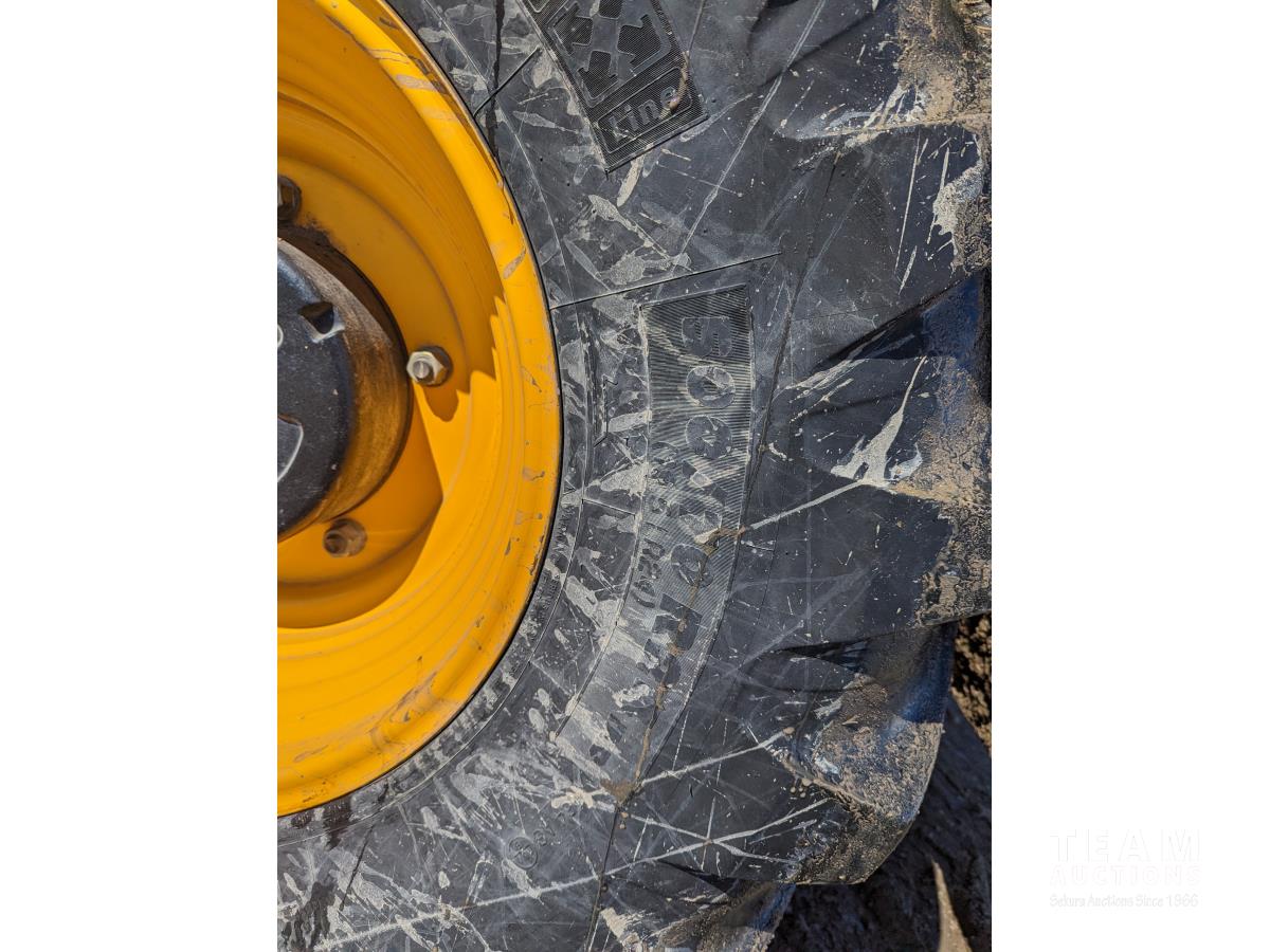 JCB 4 cylinder turbo diesel, Telescopic boom(14 ft reach, 16 ft height), 6390 lb cap, hydraulic Q/C, 8 ft bucket w/grapple, aux hydraulic, joystick, air conditioning, enclosed cab, block heater, rear clevis hitch w/pin, Michelin 500/70R24 tires, fenders.