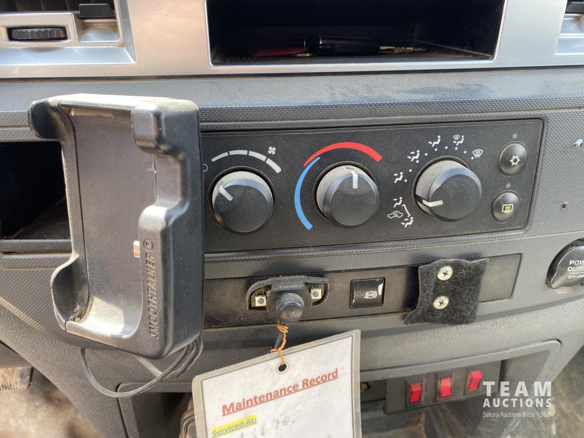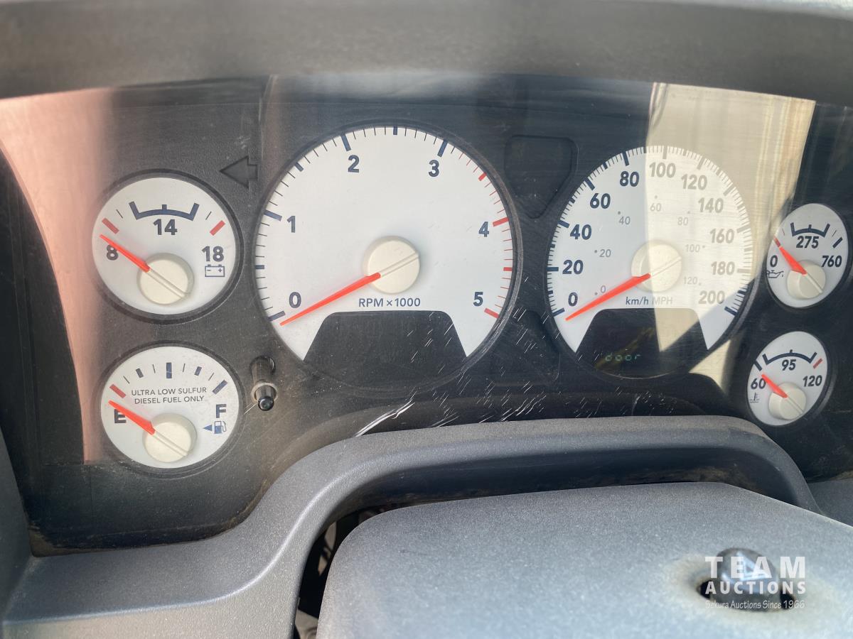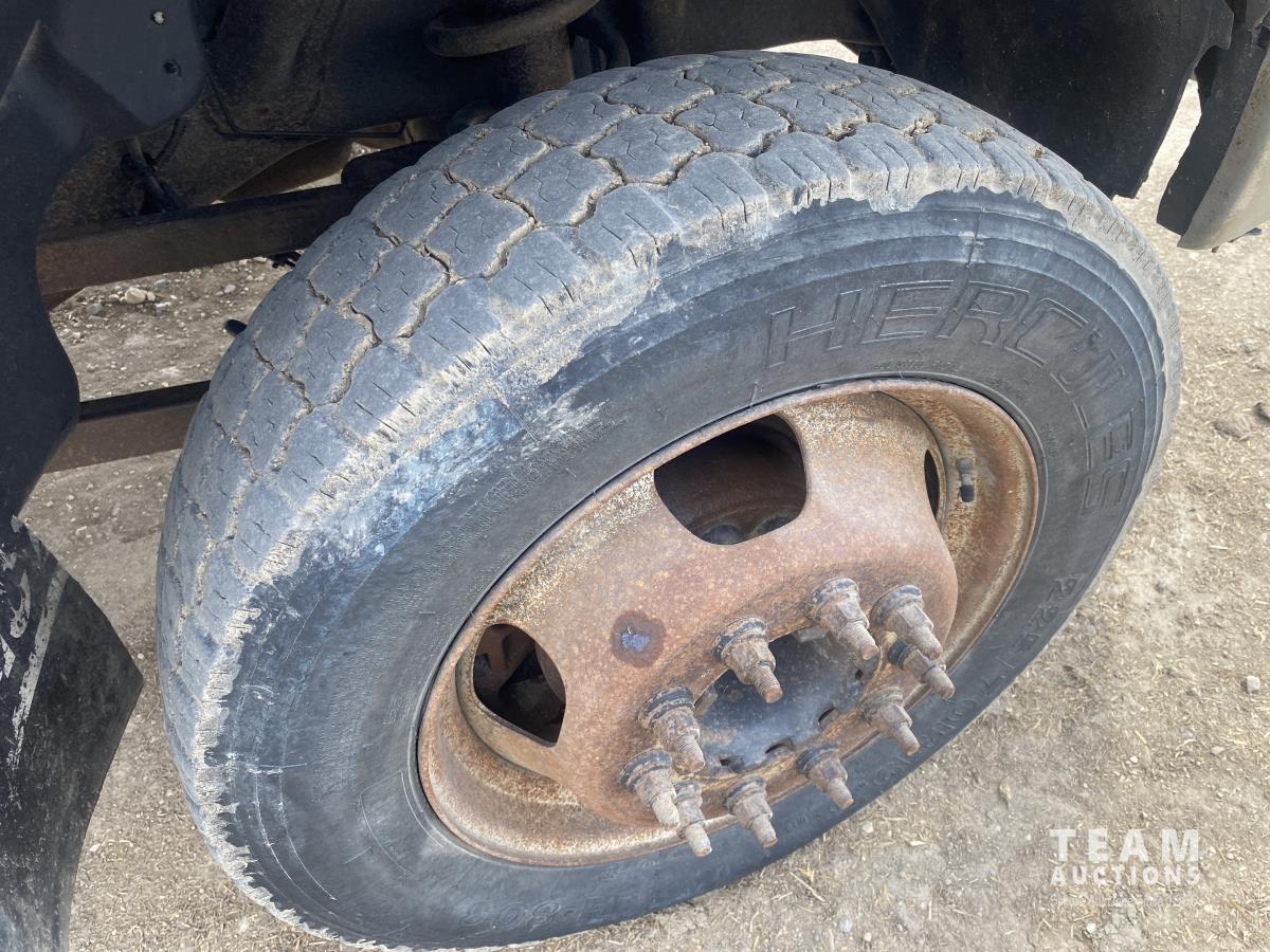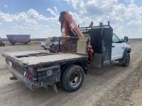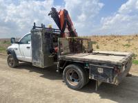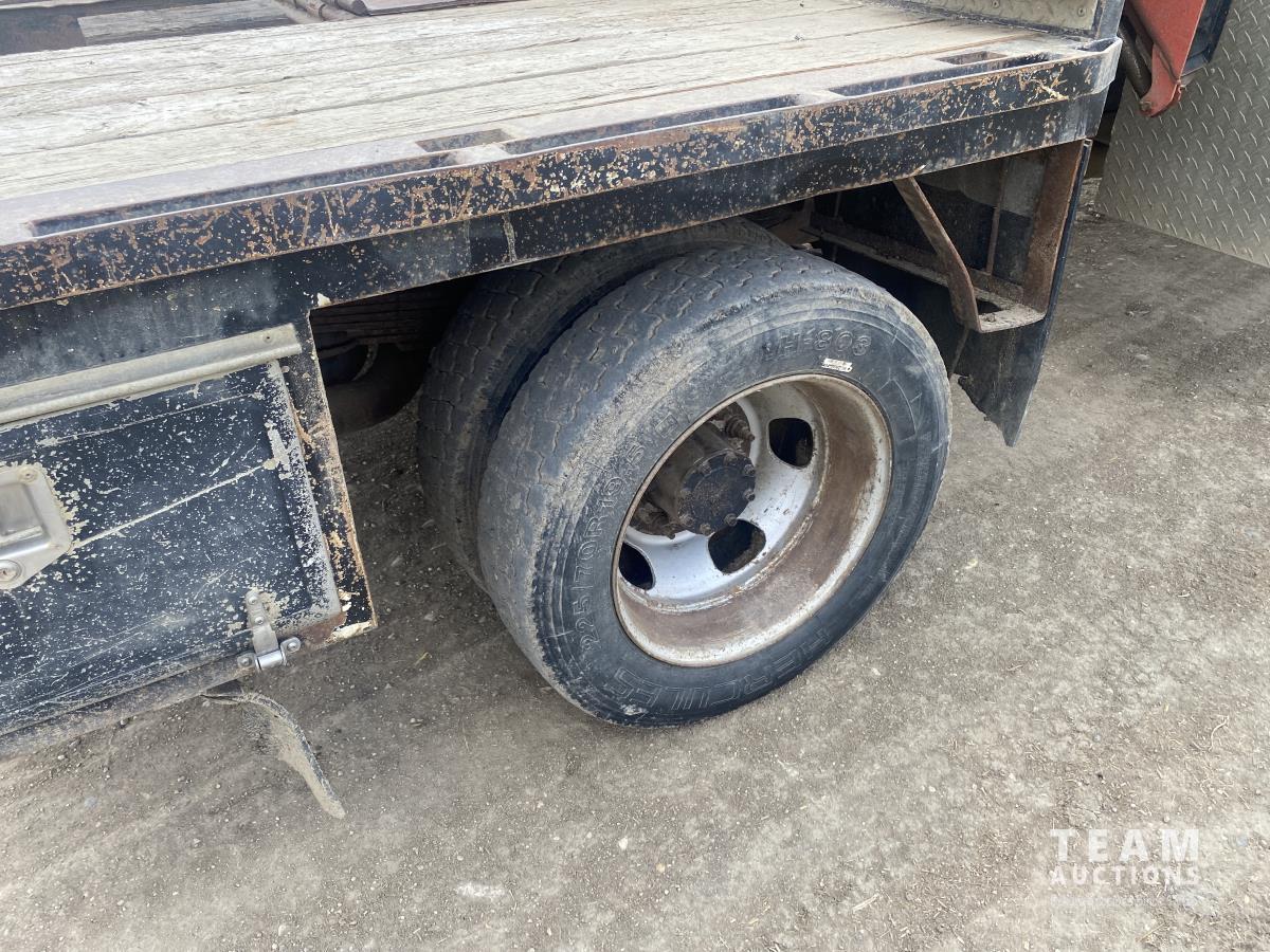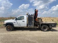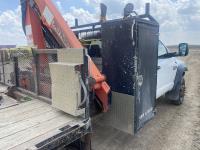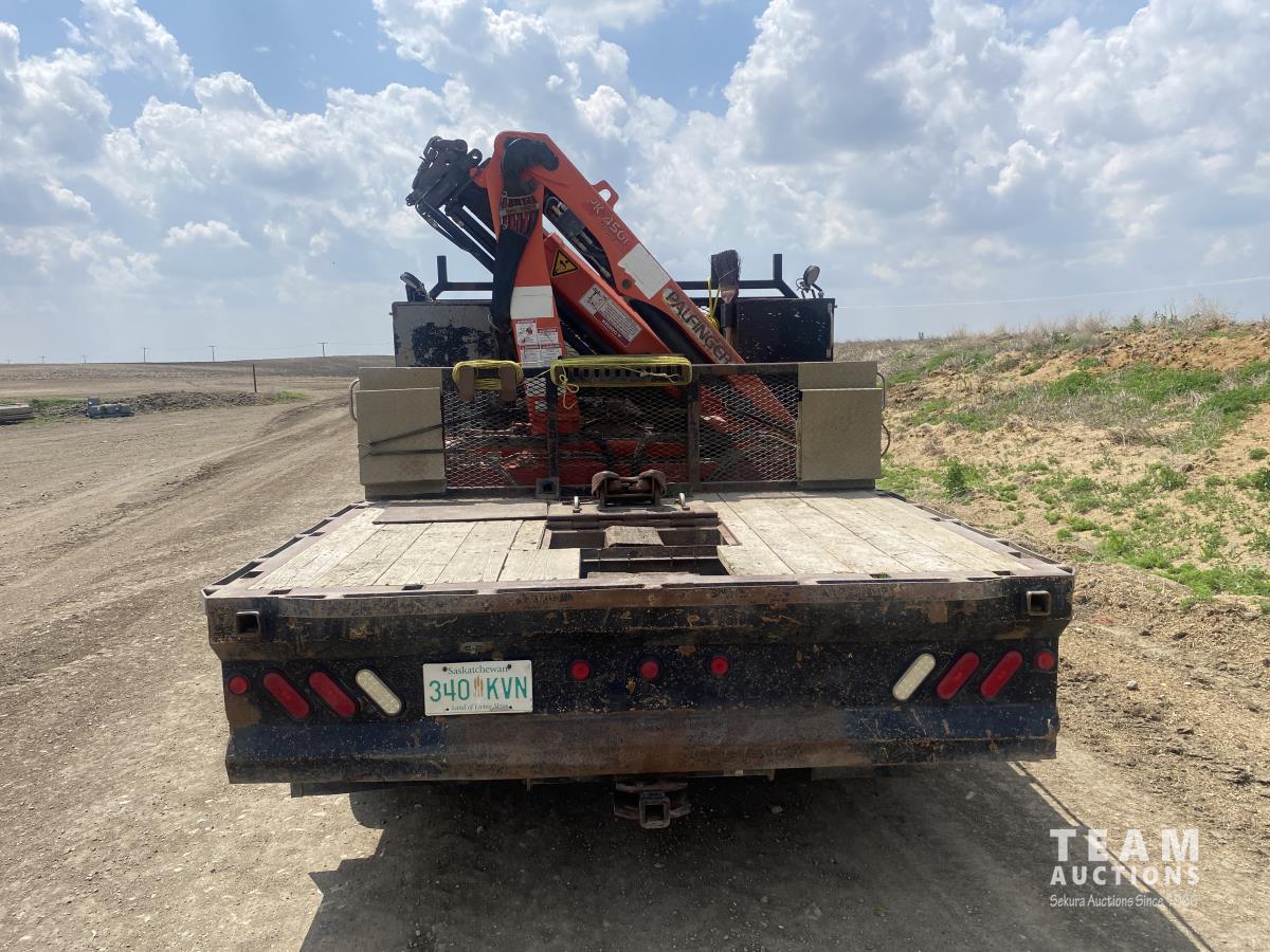 Cummins 6.7 L 6 cylinder diesel engine, automatic transmission, A/C, cruise control, radio, steel tool boxes, 76 inch x 98 inch deck, 2003 Palfinger PK4501 3 section knuckle crane, outriggers, 5th wheel hitch, block heater, power windows, locks, mirrors, 225/70R19.5 tires