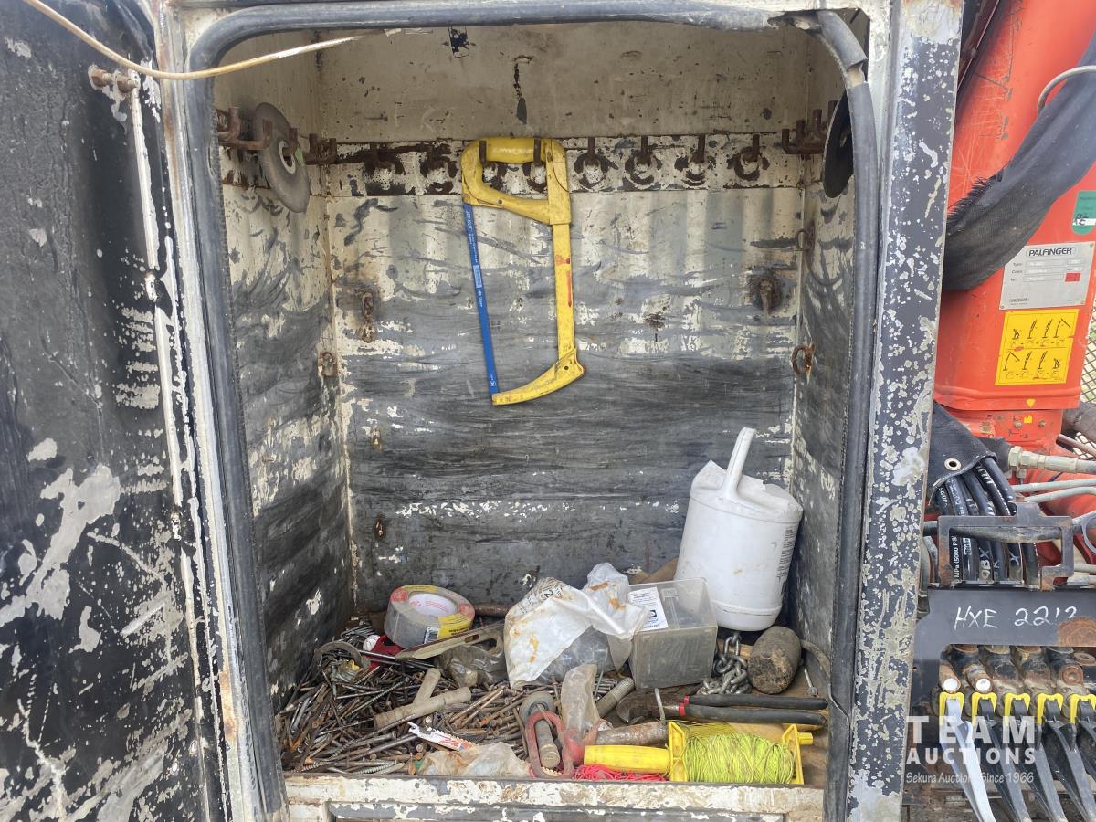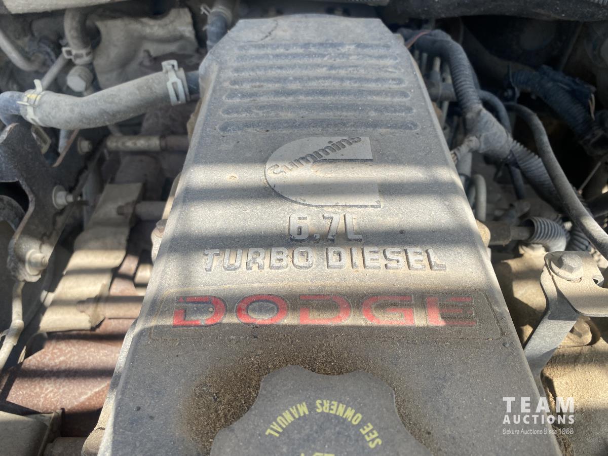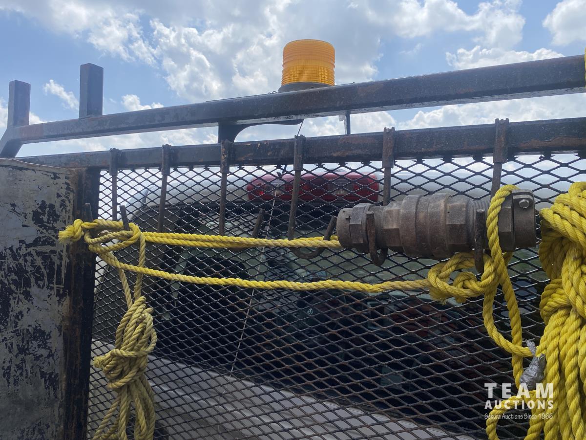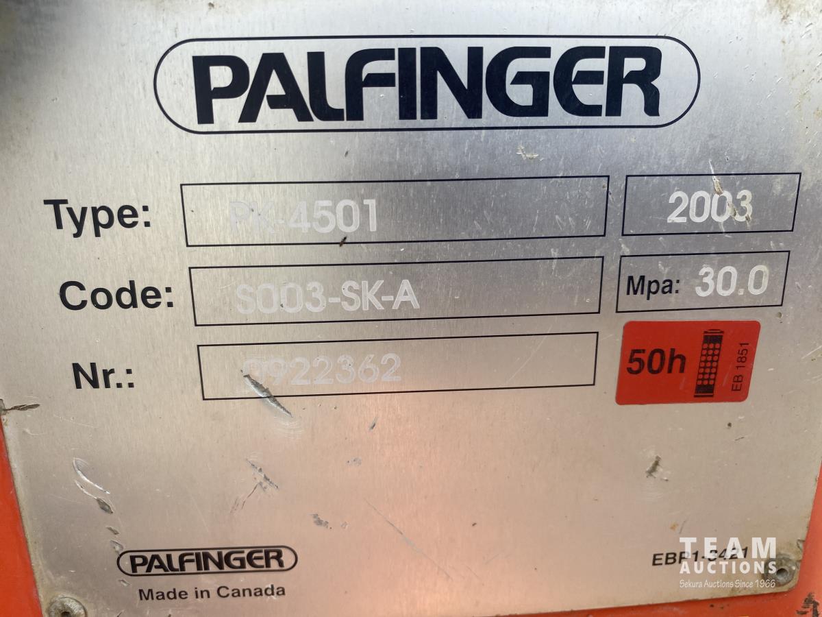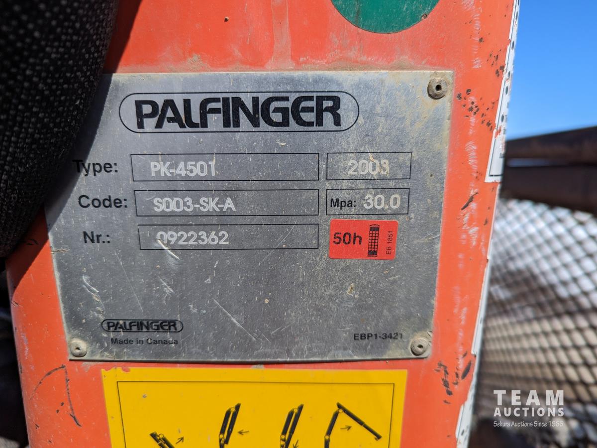 Cummins 6.7 L 6 cylinder diesel engine, automatic transmission, A/C, cruise control, radio, steel tool boxes, 76 inch x 98 inch deck, 2003 Palfinger PK4501 3 section knuckle crane, outriggers, 5th wheel hitch, block heater, power windows, locks, mirrors, 225/70R19.5 tires