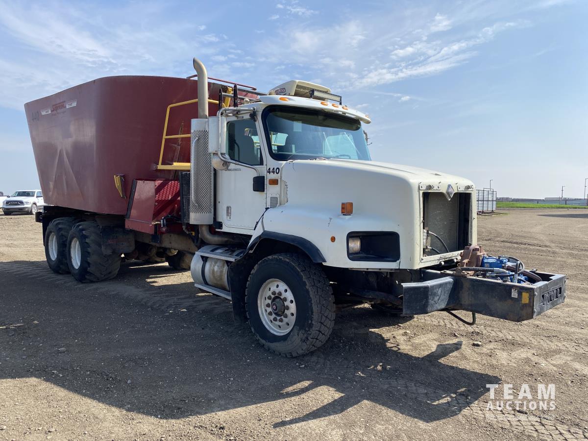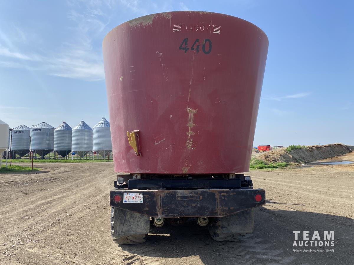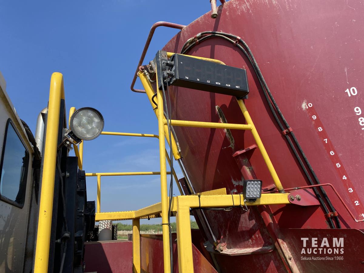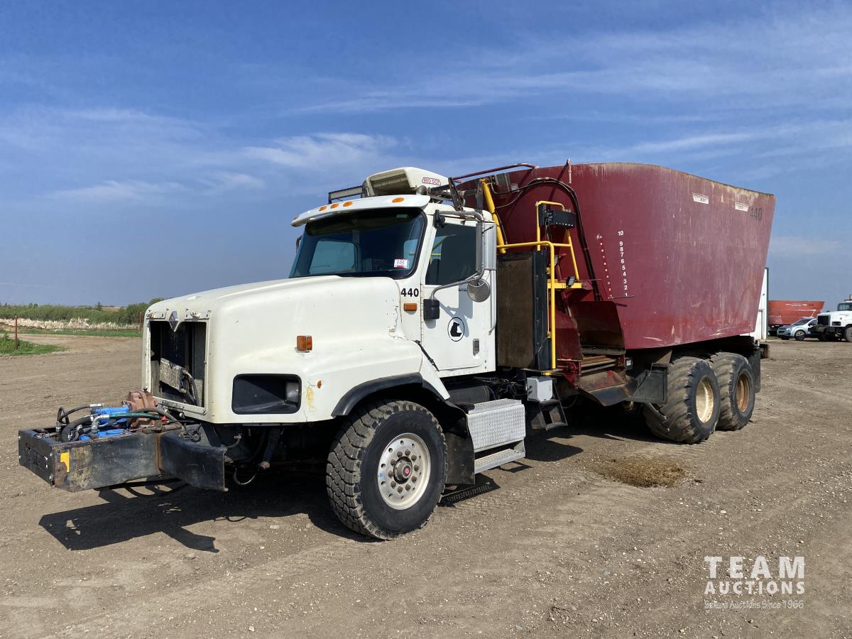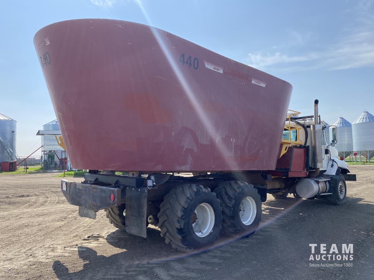 Cummins ISX02 6 cylinder 450 HP diesel engine, engine brake, Allison automatic transmission, cruise control, Supreme 1400TTM Feed Box, Reliable 300 cab scale, rubber block suspension, 10,433 lb front axle, 46,000 lb rear axles, diff lock, 244 inch WB, aluminum front wheels, 385/65R22.5 front tires, 700/40-22.5 rear tires
