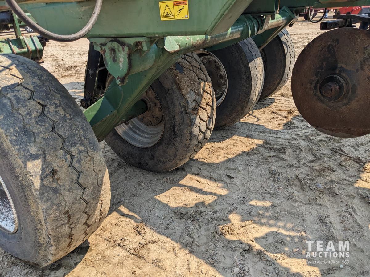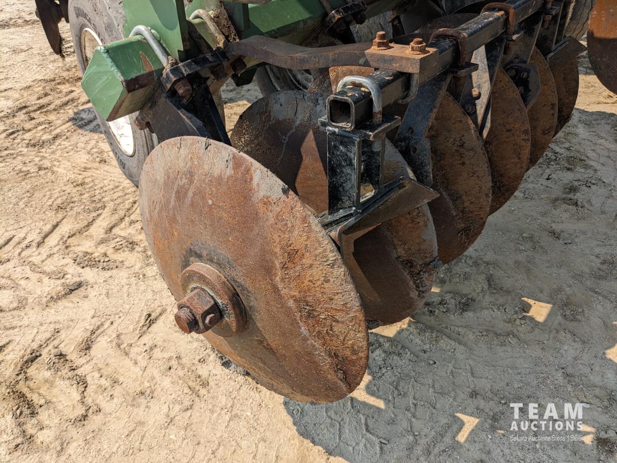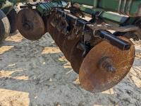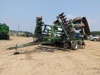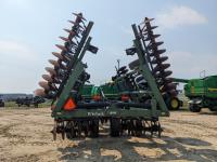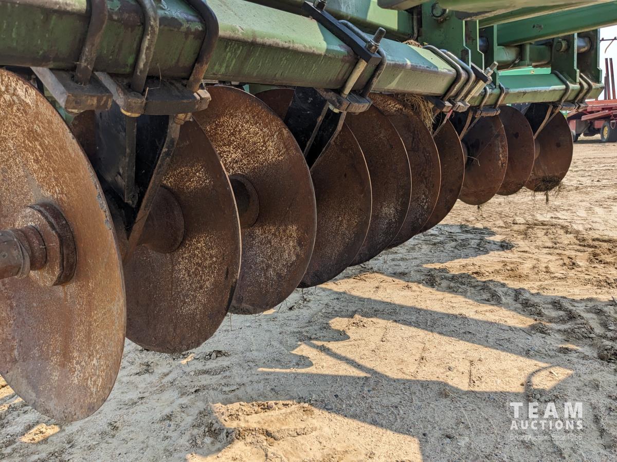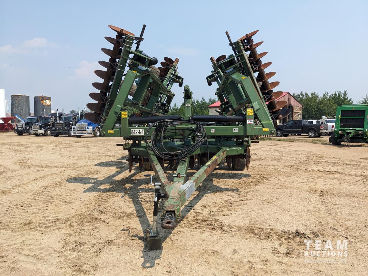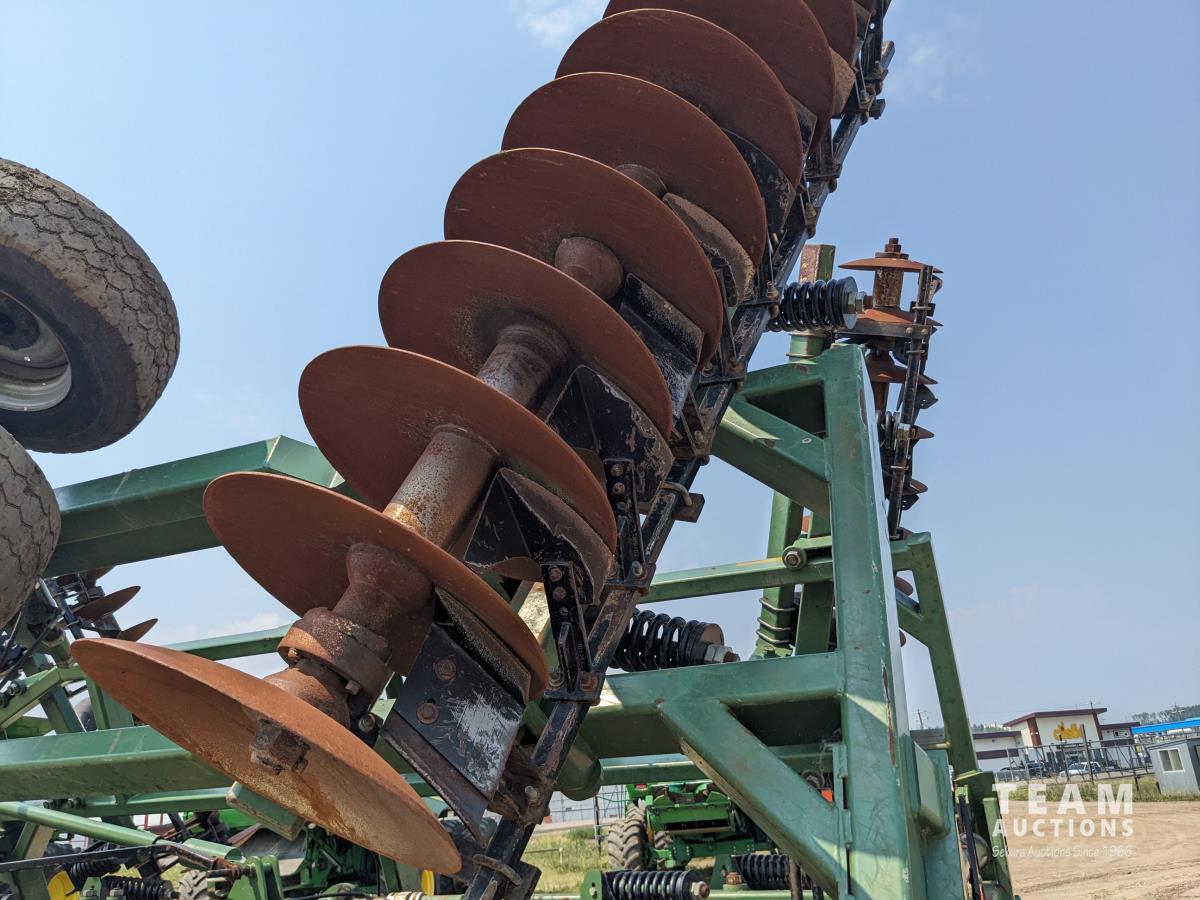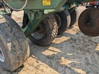 10 inch spacing, 23 inch discs front, 11 inch spacing, 26 inch discs rear, spring cushion gangs, greaseable bearings, hydraulic tilt, 365/65R22.5 duals on main frame and wings