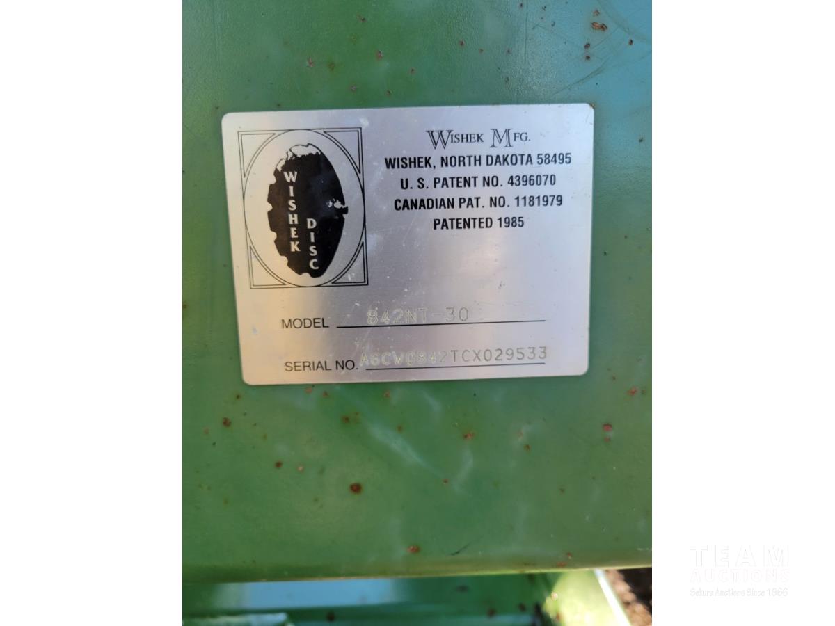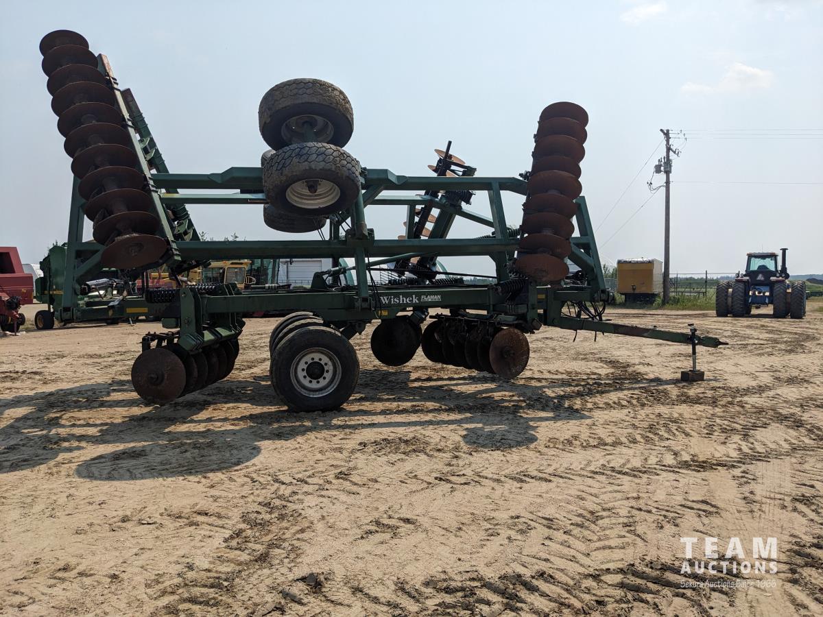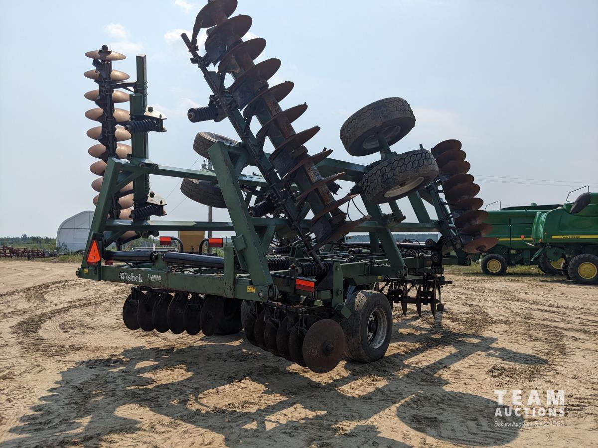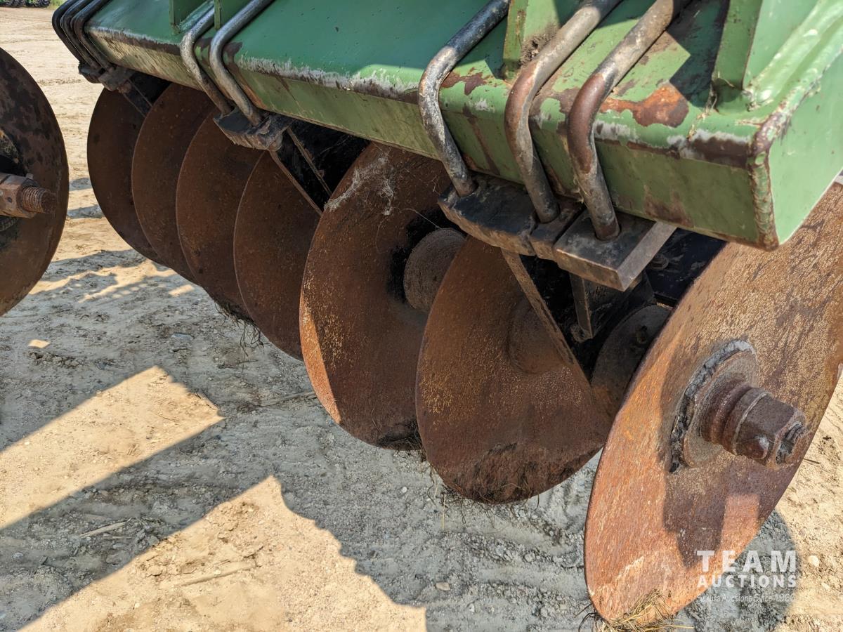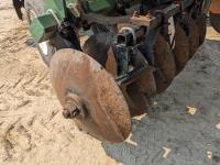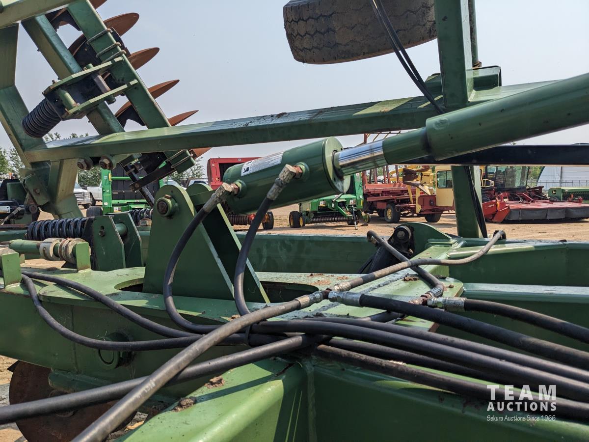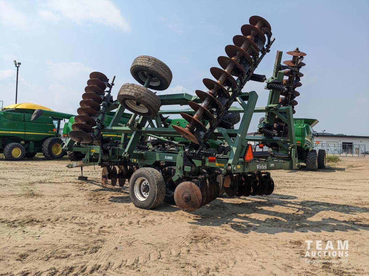 10 inch spacing, 23 inch discs front, 11 inch spacing, 26 inch discs rear, spring cushion gangs, greaseable bearings, hydraulic tilt, 365/65R22.5 duals on main frame and wings